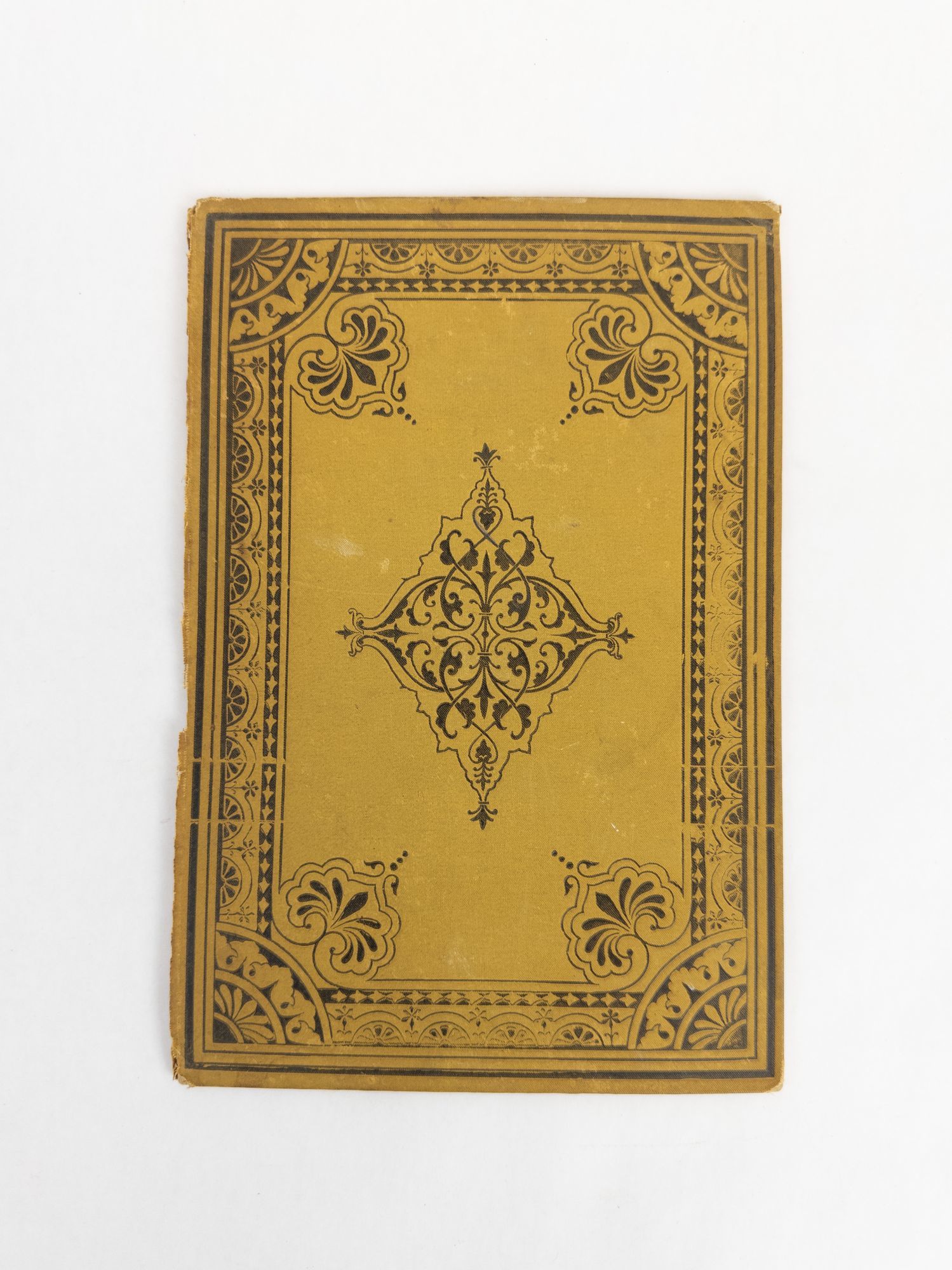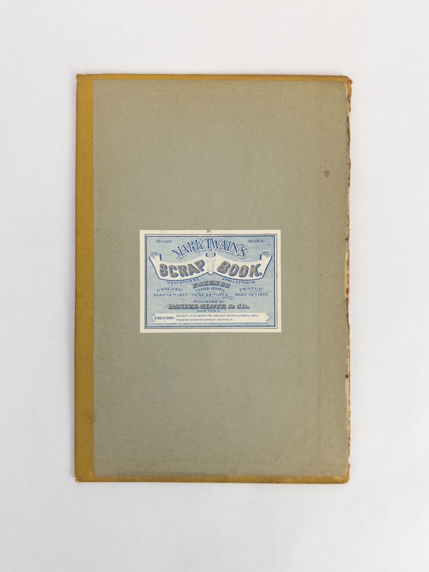 New York: Daniel Slote & Co, 1878. Front board of Mark Twain's scrap book, registered April 23rd, 1878. Yellow cloth with black decoration. Pastedown in silver and blue lettering. Some scuffing to cover and along edges. Fraying to cloth along left edge, where it was originally attached to spine. Shelved in Room G. 1376427. Special Collections.