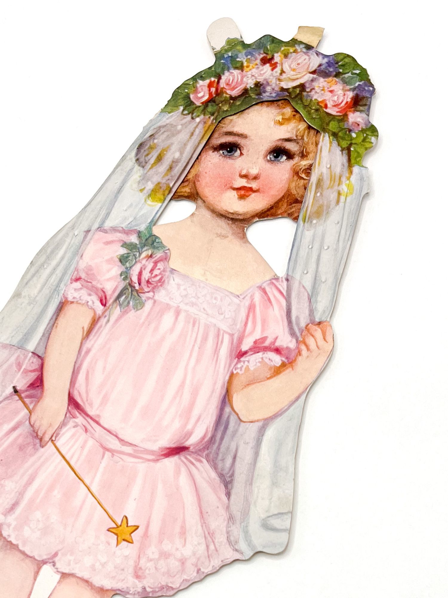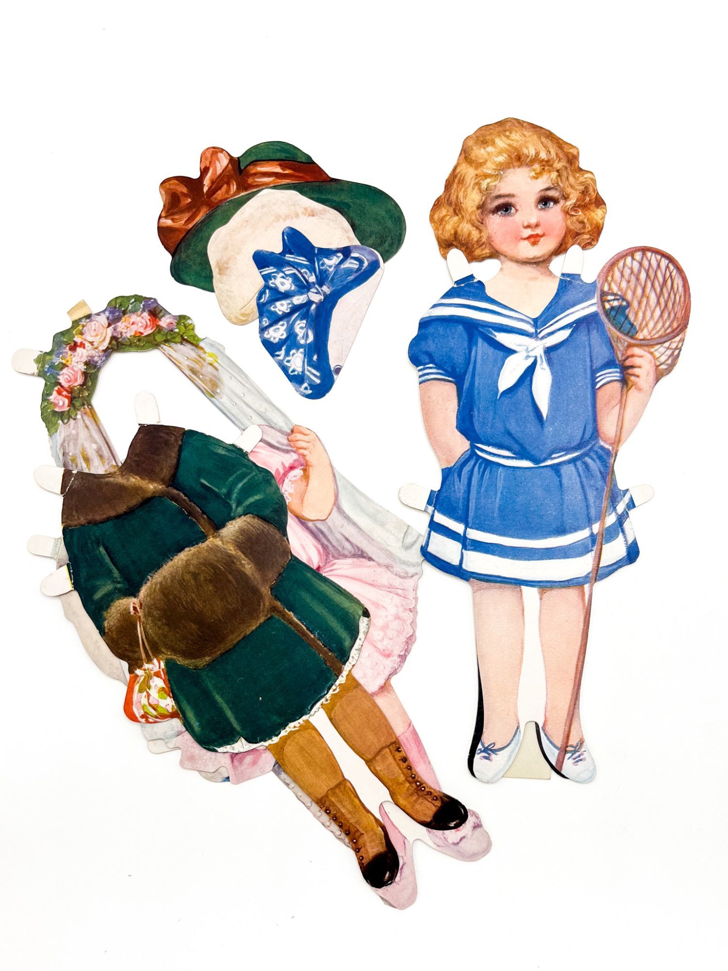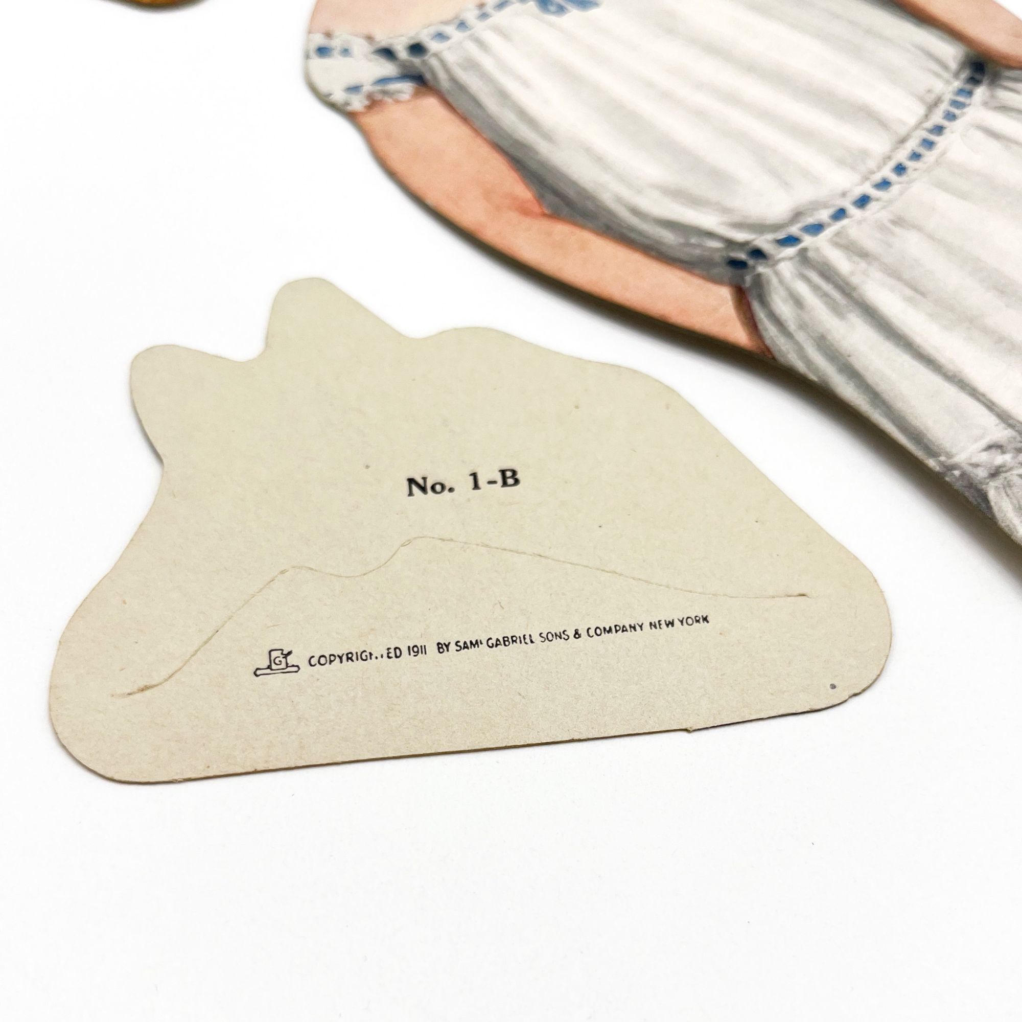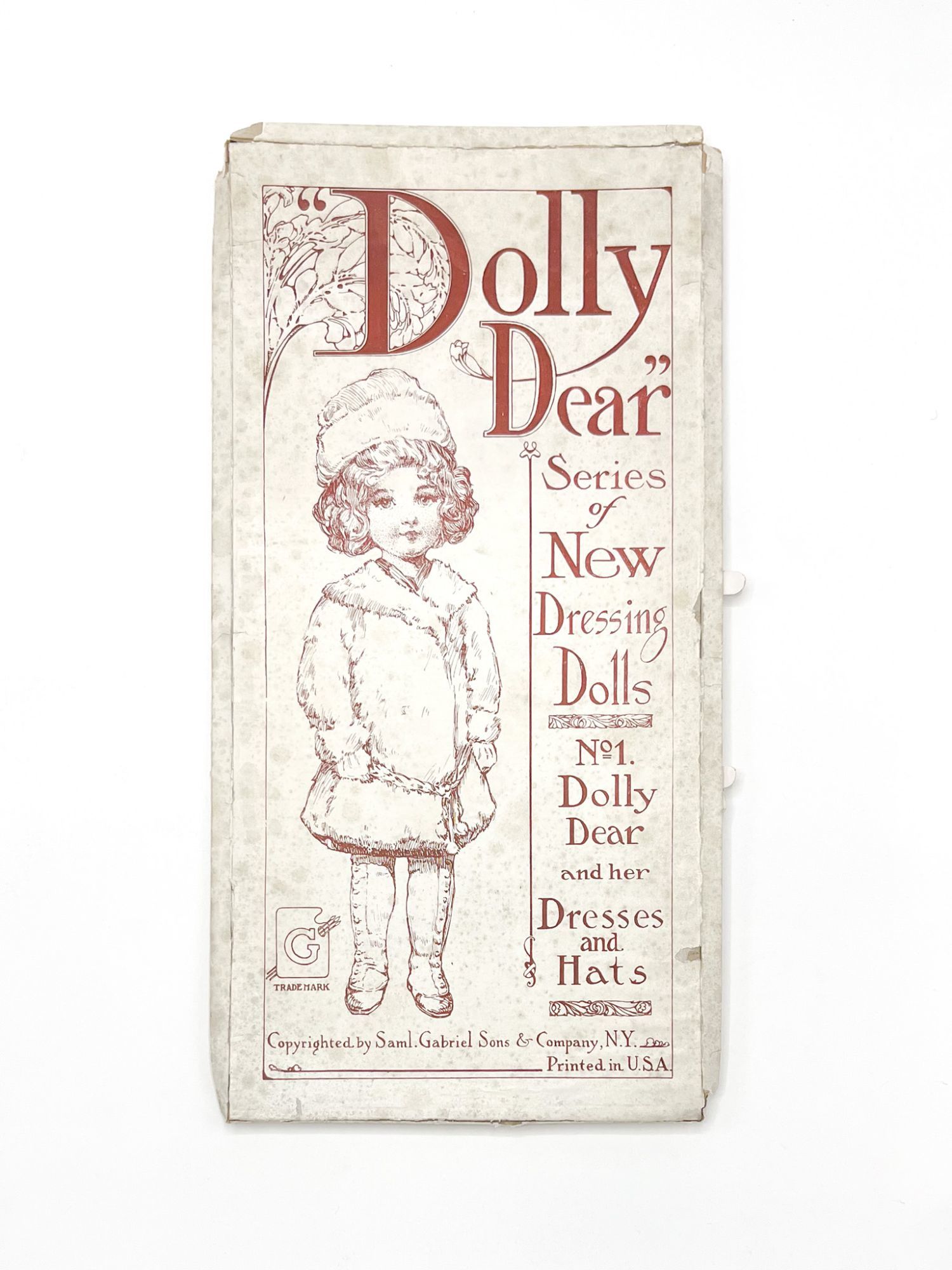 New York: Saml. Gabriel Sons & Company, 1911. Near fine in very good box.. Lovely large paper doll and four stylish outfits in original box — a beautiful example of an early 20th-century paper toy. The doll wears a white frilly chemise with blue ribbon and has blonde hair. Her 4 costumes are: a green coat with fur muffler, a white fur coat, a blue sport outfit with lacrosse stick and a floral fairy costume. The hats match the dresses. Quite wonderful. 14.25'' x 4'' (doll); 16'' x 7.5'' (box). Chromolithograph paper doll, four outfits, and three hats, all on card. In original pictorial box. Box with edgewear and tape repairs, a bit of rubbing; some flattening. Doll with careful reinforcement to verso of neck, outfits with tabs folded. Bright and intact.