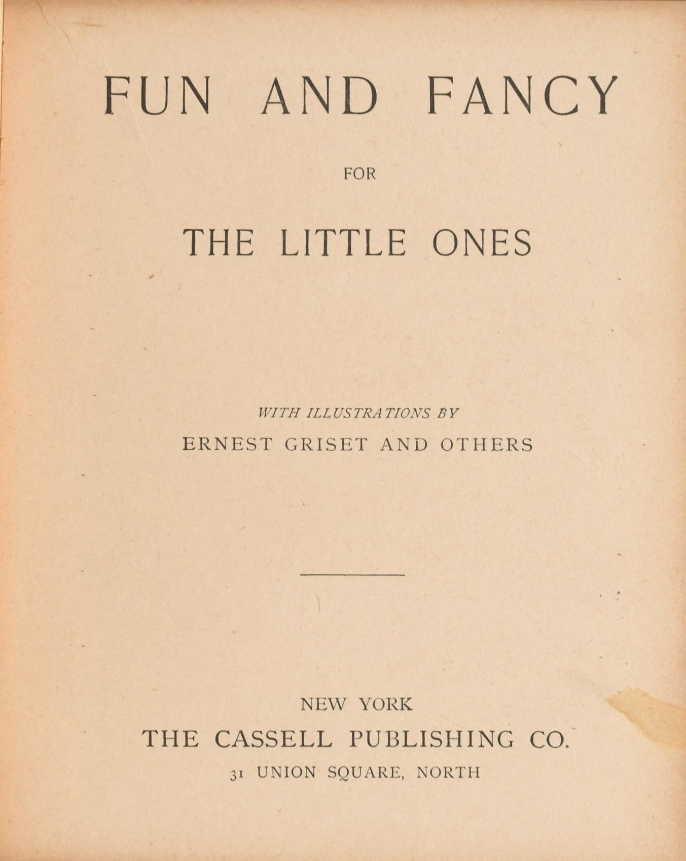 New York: Cassell Publishing Company, 1890. Pictorial Boards. Very Good binding. A fragile late 19th century children's books in pictorial boards. There is some cracking to the spine, but it is essentially all present. The boards are bright, with the usual corner wear and rubbing to the extremities. Front hinge has been reinforced with japanese tissue. Glue residue (from what we're not sure) on the pastedowns, and a child's name on the endpaper, dated in 1897. Mylar has been cut to protect the binding. Very Good binding.