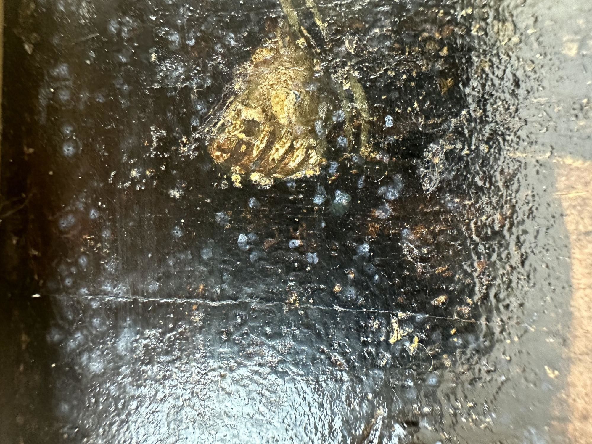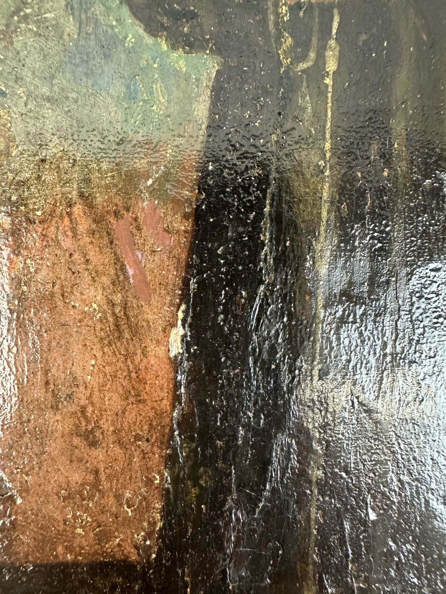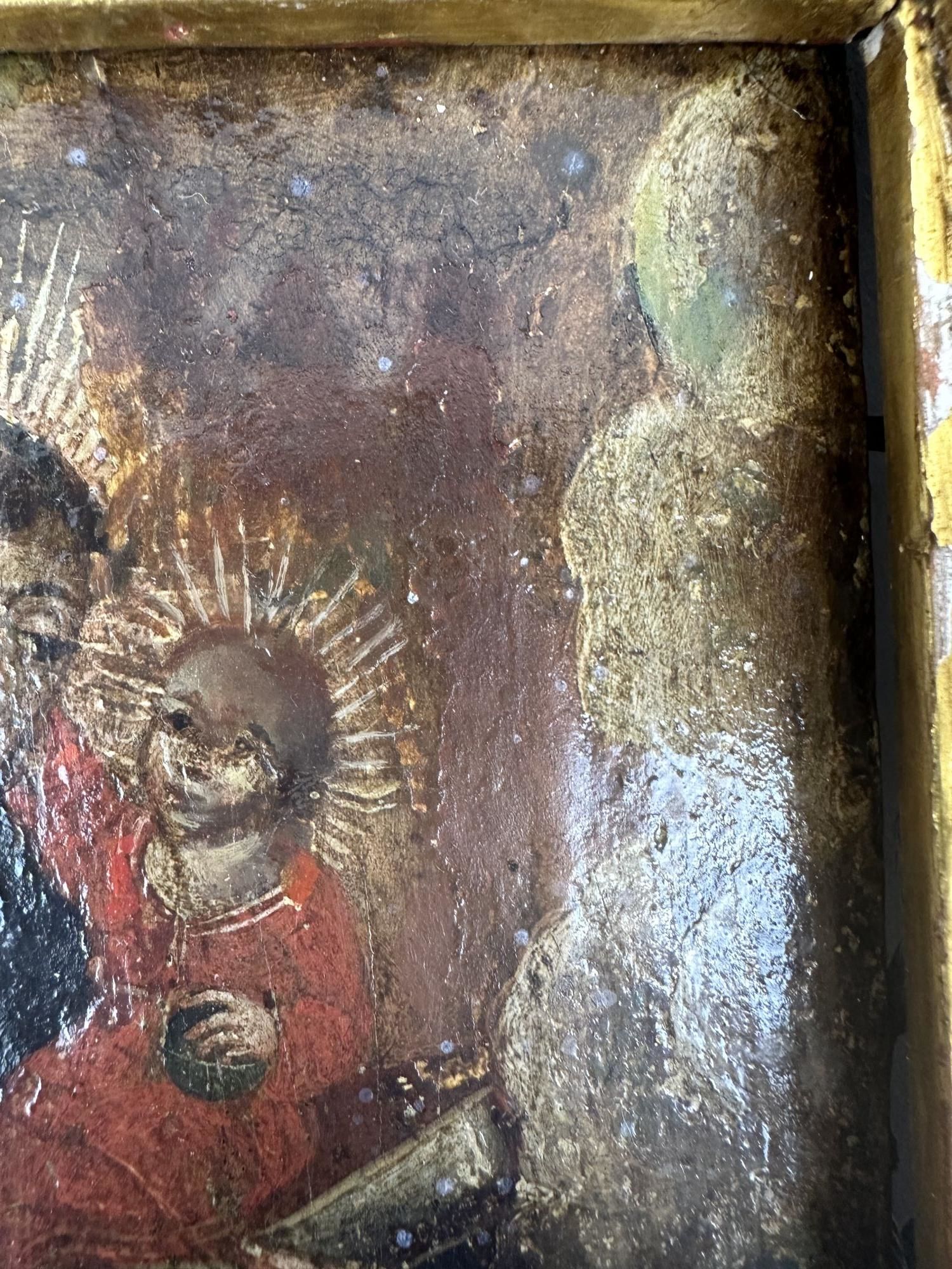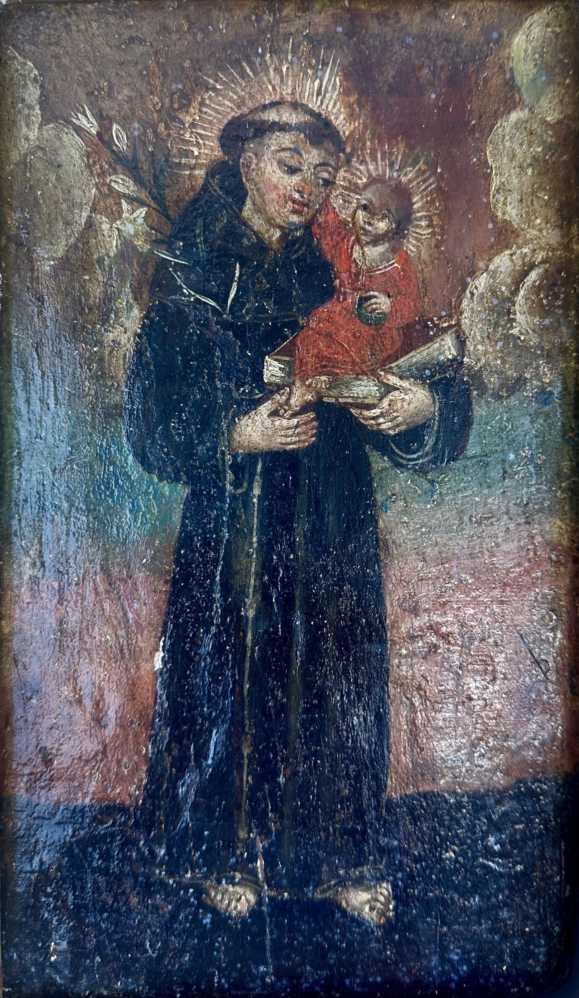 Bogota, Columbia, Circa 1650. Original Baroque oil on wood panel of Saint Anthony of Padua by an unidentified artist. Housed in an ornate wooden red and gold fame. Measurements: Panel: 8 1/2"h x 5"w; frame: 12 1/4"h x 9"w. Condition: Very Good. Wear consistent with age; scattered tiny white spots appear mostly to the bottom left and right quadrants; one tiny chip (2ml x 7ml) to the upper of bottom left quadrant. Moderate distress to edges of the frame. Shelved at DuPont. 1376544. Arts & Antiques.