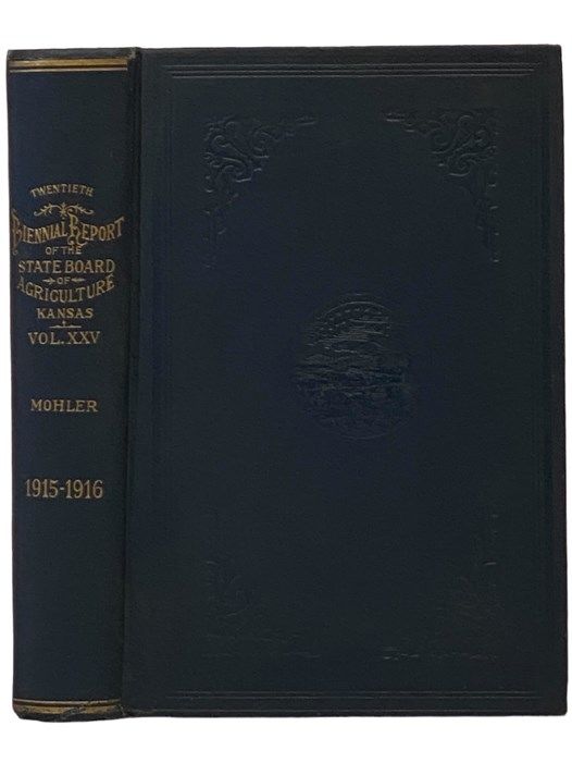 Topeka, Kansas: Kansas State Board of Agriculture, 1917. Hard Cover. Very Good/No Jacket. Front hinge just beginning to weaken. 1917 Hard Cover. ix, 747 pp. Navy boards with gilt text on spine. Includes black-and-white illustrations, tables, maps, and one fold-out table. Contents include: Officers and Members of State Board of Agriculture; Letter of Transmittal; Preface; Rural Welfare; Extension Service; Home Economics; Farm Homes; Farm Management; Rural Engineering; Soils and Crops; Live Stock; Poultry; Farm Forestry; A List of Books for Farmers; Proceedings of the Board; Statistics of Counties, Showing Population, Acreages, Productions and Live Stock, Their Values for 1915 and 1916, Assessed Valuation of Properties for Taxation in 1916, etc.; General Summary of Statistics, Assessed Valuation of Taxable Property for 1916, Diagrams of Various Crops, Showing Comparisons, Population and Area, and State Summaries for 1916 and 1916; Crop and Live-Stock Statistics for the Years 1915 and 1916; Census Tables, 1915; General Index.