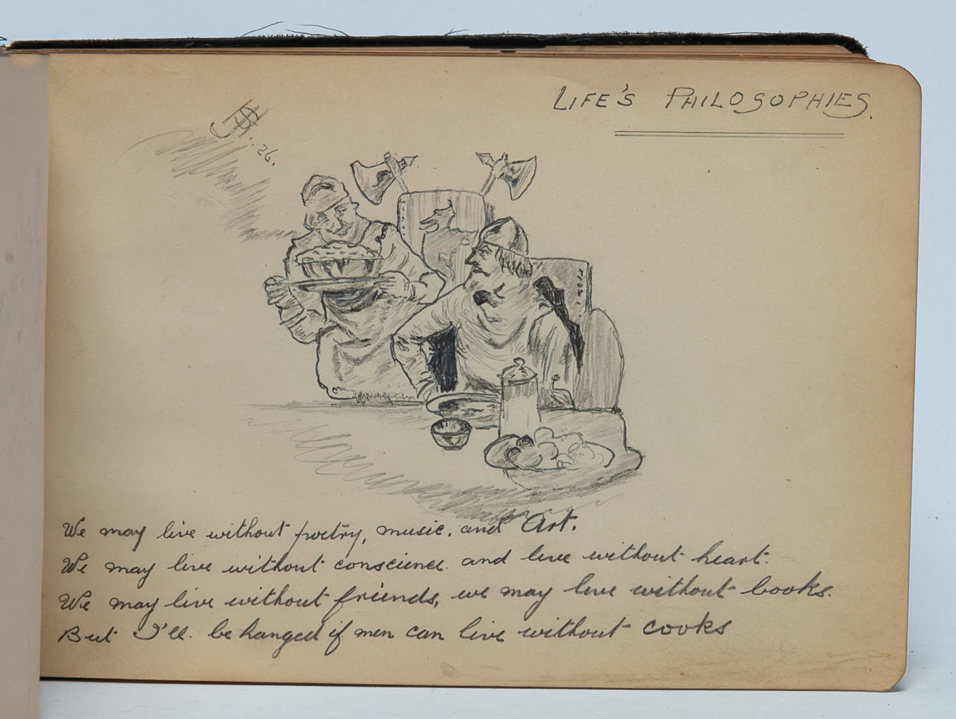 Without a surname, Evelyn will remain partially hidden by history; but the survival of her friendship album gives us insight into her personality, the friends with whom she surrounded herself, and the varying attitudes her generation and community had about what constituted a satisfying life. The opening dedication from "Dad" suggests like many similar albums that its purpose is to provide its owner with comfort "in the Autumn of my days" by prompting memories old "the old friends that I once had. The highly Victorian sentiments of the parent are humorously at odds with much of what Evelyn and her friends have to say. In an undated entry signed only "M. B." traditional gender hierarchies are thrown to the wayside: "He's a fool who think by force or skill, To stem the torrent of a woman's will, For if she will -- she will, You may depent on't. And if she won't -- she won't. So there's an end on't." Another titled "Life's Philosophy" and left unsigned has an illustration of knights at dinner, and a quippy poem about men's incompetence in the kitchen and their inability to "live without cooks" despite touting their own greatness. M. Florence Godwin contributes in 1925: "When you are married, And Hubby get cross, Pick up a rolling pin, And say 'I'm Boss.'" Others push back against such latent feminism. "Do your duty without a fuss," writes M. Black, for example. An unsigned entry plays on the idea of motherhood, wishing "May your only troubles be 'little ones.'" In 1928 C. W. B. Hunter writes "May he who feeds the little pigs And sends the horses hay, Take pity on this little miss, And send a man her way."