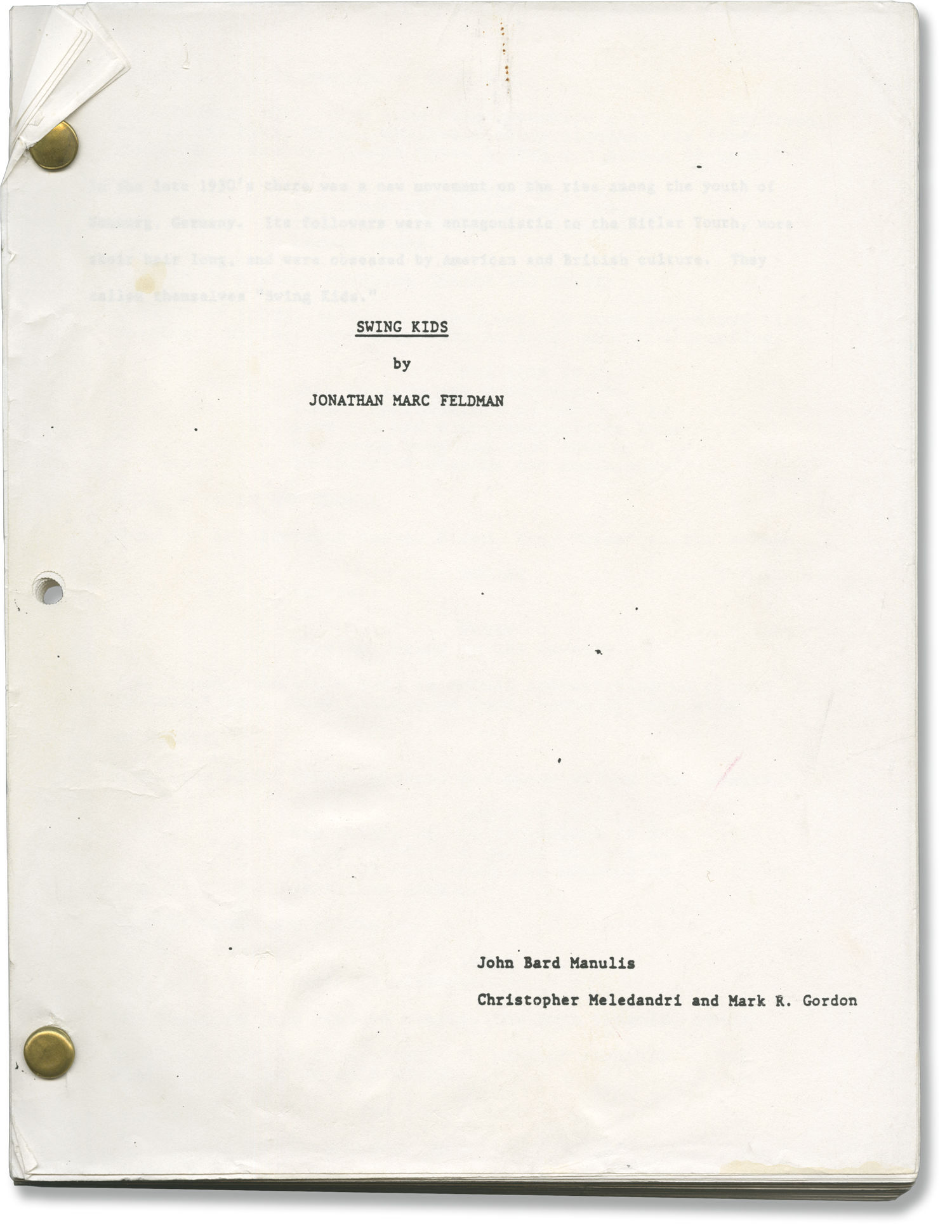 Missing wrappers. Title page present, undated, with credits for screenwriter Jonathan Marc Feldman. 126 leaves, with last page of text numbered 124. Xerographic duplication, rectos only. Pages Very Good plus, bound with two gold brads.