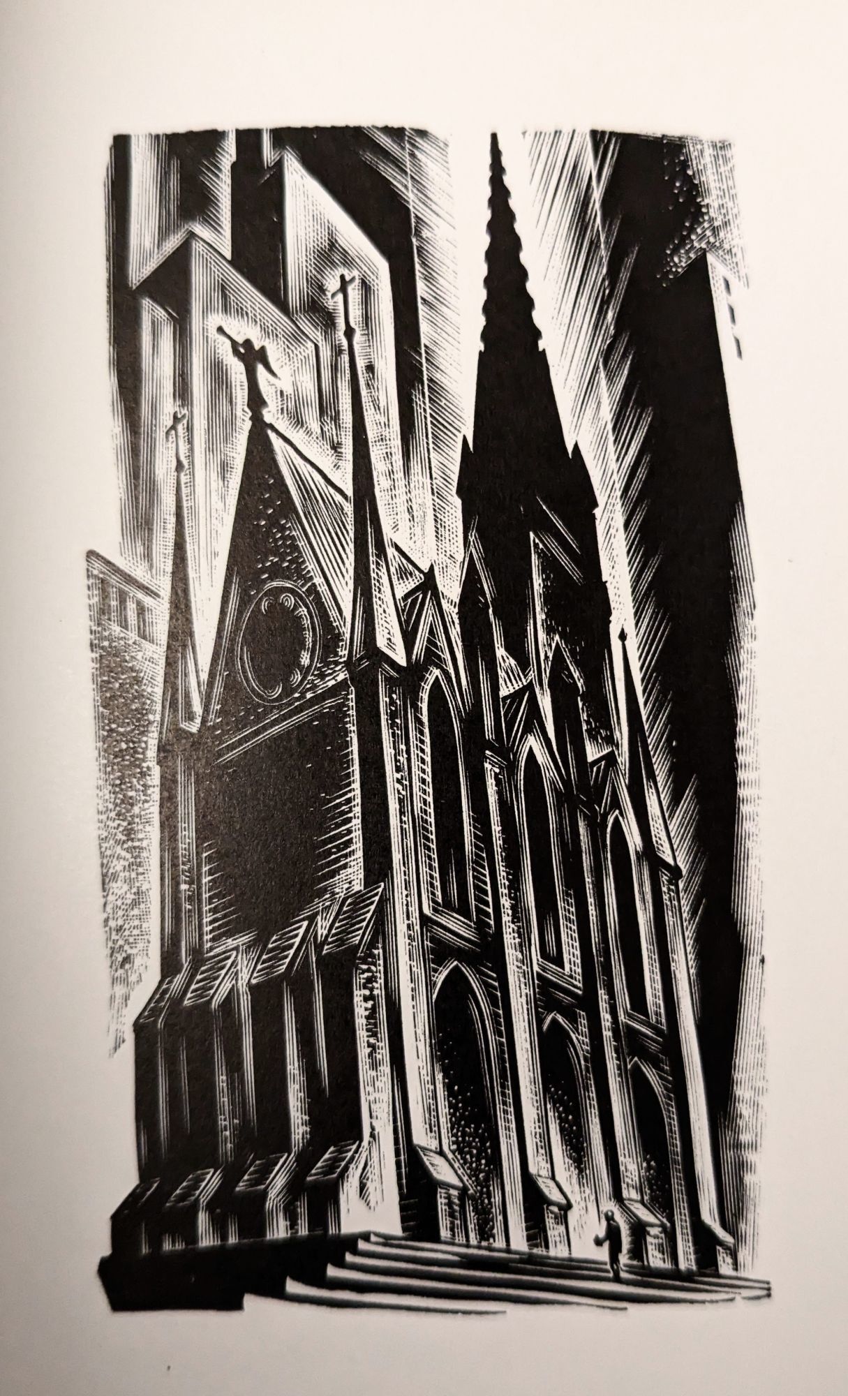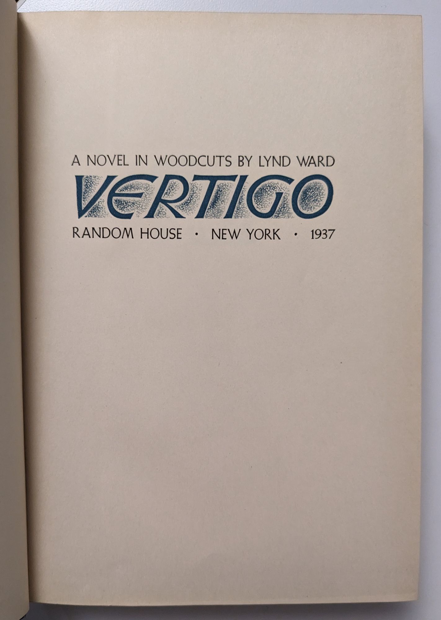 New York: Random House, 1937. First edition. Hardcover. Lynd Ward. [490 pp. 230 wood engravings.] Octavo [21.5 cm]; full dark blue cloth with spiral and star illustrations. Small bump to top corner of the rear board. Some light toning around edges of the pastedowns and flyleaves (as is commonly seen in this work). Lacking the rare dust jacket. Nice period era bookplate affixed to front pastedown, corresponding previous owner's name and date neatly written in black ink on the front flyleaf. A Very Good copy; clean, square, and tightly bound. Considered one of Lynd Ward's finest works, "Vertigo" is the sixth and final of his “wordless novels,” and is told in 230 beautiful and striking woodcut images. The narrative takes place during the Great Depression and explores themes of greed, love, despair, and death, through the progression of three characters: a young woman, a young man, and an ailing capitalist. Ward produced his six wordless novels (proto-“graphic novels”) between 1929 and 1937, and although he continued to be an in-demand illustrator for the rest of his life, these early works show him at the height of his creative powers. Dance 10.