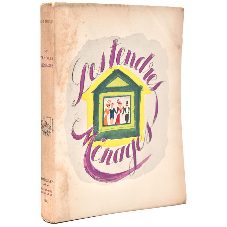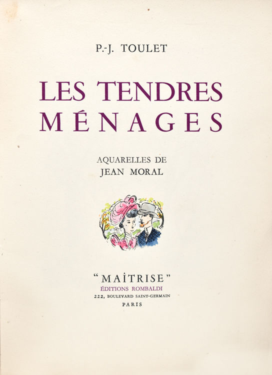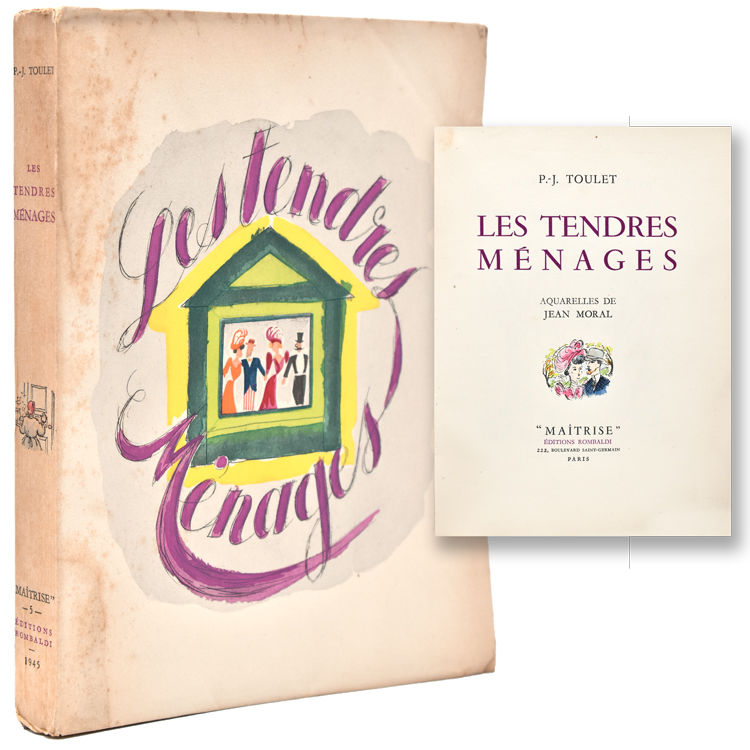 Paris: Maitrise" Editions Rombaldi, 1944. First edition thus, by this publisher and with illustrations by Jean Moral, issue on BFK Rives paper, this being copy No. XLVI, presumably one of the "hors commerce" copies, expertly hand-colored throughout, stating on hand-colored colophon leaf: "Il a ete tire en outre quelques exemplaires hors commerce" [total edition of 1000 numbered copies, plus an undetermined number of hors commerce issue]. pp. 231, [ii], illustrated [by watercolor] throughout by Jean Moral; text in French, Illustrations include numerous hand-colored, full-page plates and vignettes. 8vo. Pictorial wrappers (with hand-colored illustration on front cover). Moderate tanning on spine, with moderate, uneven foxing on spine and on front cover (adjacent the spine), else a near fine, partially unopened copy, with text and plates fresh and clean. First edition thus, by this publisher and with illustrations by Jean Moral, issue on BFK Rives paper, this being copy No. XLVI, presumably one of the "hors commerce" copies, expertly hand-colored throughout, stating on hand-colored colophon leaf: "Il a ete tire en outre quelques exemplaires hors commerce" [total edition of 1000 numbered copies, plus an undetermined number of hors commerce issue]. pp. 231, [ii], illustrated [by watercolor] throughout by Jean Moral; text in French, Illustrations include numerous hand-colored, full-page plates and vignettes. 8vo. Paul-Jean Toulet (1867-1920) was a French poet and novelist. An uncommon title in this edition, with illustrations by Jean Moral. Jean Moral (1906-1999) was a respected French photographer (experimenting with multiple images and abstraction), who turned to drawing later in life. OCLC locates three worldwide holdings of 'Les Tendres Menages' (undetermined issue), only one of which is held by an American institution [North Carolina-Chapel Hill, Glasgow University, and Koninklijke Bibliotheek(Netherlands)]