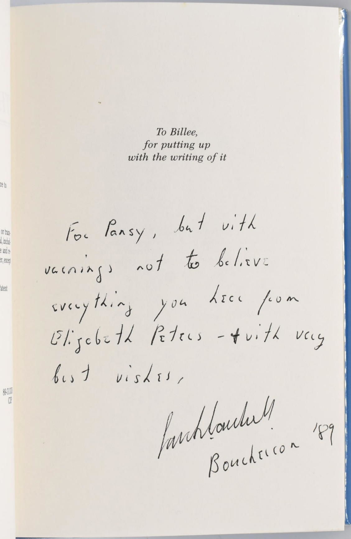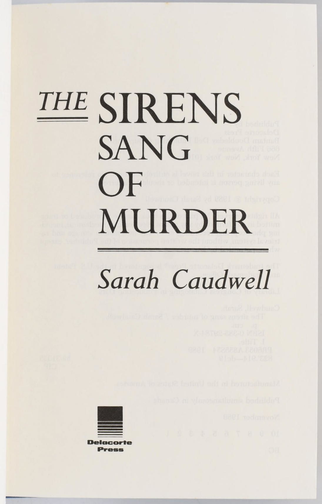 New York: Delacorte Press, 1989. First Edition. Hard Cover. Very Good binding/Very Good dust jacket. Signed. 8vo.; in pale blue paper-covered boards, backed in blue cloth, with dustjacket; 276 pages; the jacket has not been price-clipped.~~From the library of the late novelist Alexandra Ripley; with a wonderful inscription from Caudwell: "FOR PANSY, BUT WITH WARNINGS NOT TO BELIEVE EVERYTHING YOU HEAR FROM ELIZABETH PETERS - & WITH VERY BEST WISHES, SARAH CAUDWELL, BOUCHERCON 1989". "Pansy" is an "in-joke" between them -- it is the name Ripley gave to Scarlett's maid in Ripley's sequel to Gone With the Wind, Scarlett. Ripley and Caudwell must have been at the Bouchercon Mystery Awards together in Philadelphia in 1989. Caudwell's book, "The Sirens Sang of Murder" was the Bouchercon winner the next year in London. ~~A very nice association, with the reference to their mutual and good friend, Elizabeth Peters. Very Good binding / Very Good dust jacket.