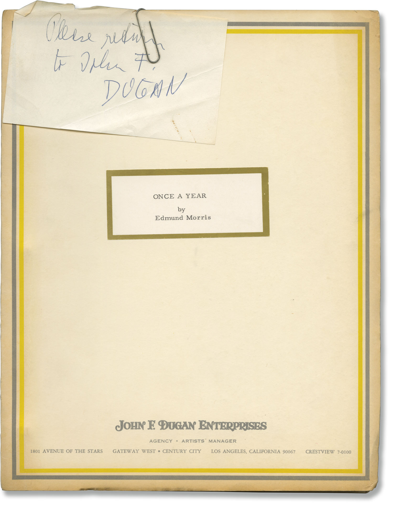 White titled wrappers, with credit for screenwriter Edmund Morris. Title page present, with credit for Morris. 154 leaves, with last page of text numbered 151. Xerographic duplication, rectos only. Pages Near Fine, wrapper Near Fine, bound internally with three gold brads.