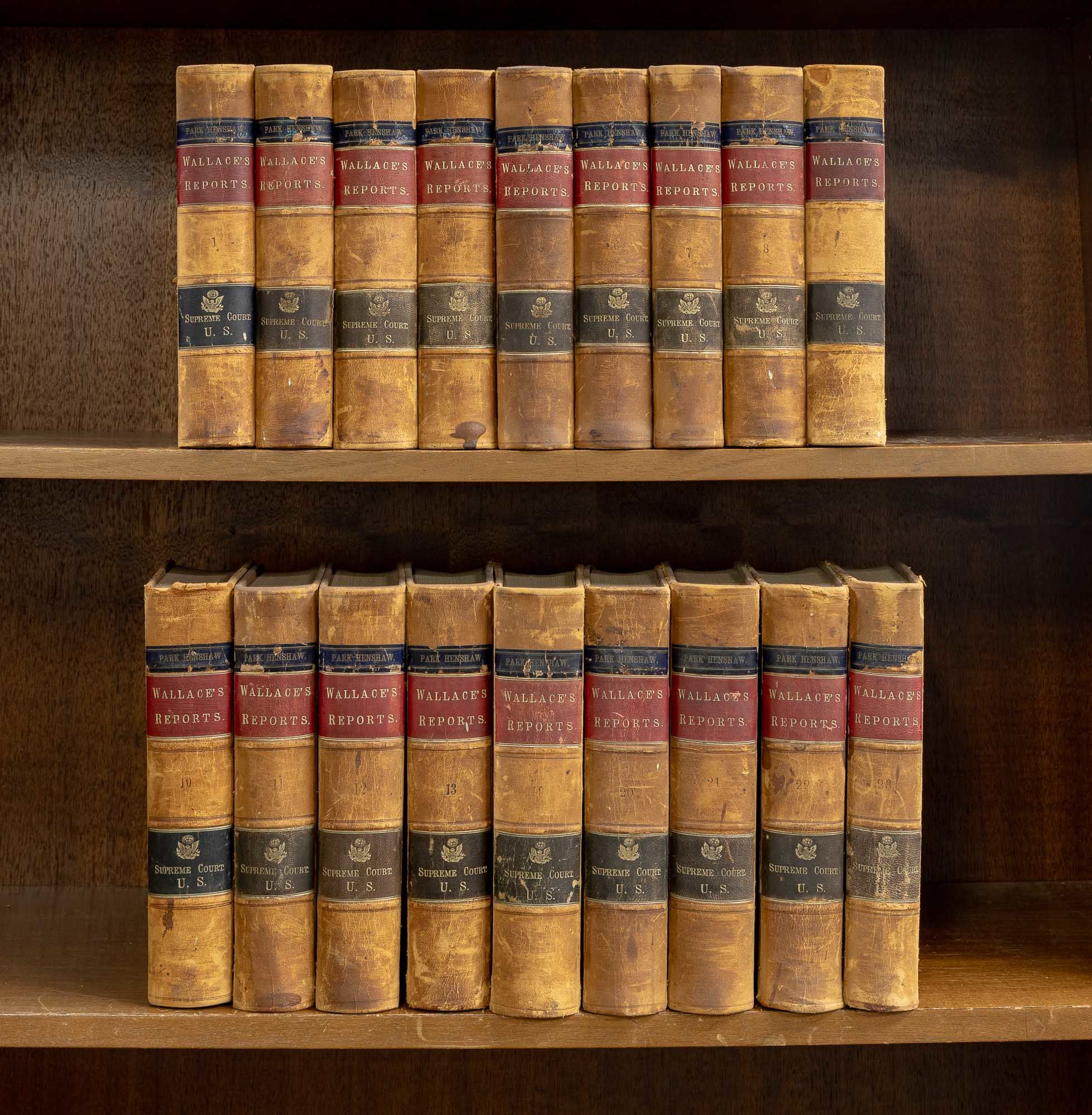 1876. Three (3) linear feet of shelf space.. Three (3) linear feet of shelf space. [United States Reports. Original law calf]. [United States Supreme Court]. Wallace, John William (Reporter). Cases Argued and Adgudged in The Supreme Court of the United States, December Term, 1863-1873 [Volumes I-XIII; Volumes XIX-XXIII (68 U.S. to 80 U.S.; 86 U.S. to 90 U.S.]. 18 books. Washington, D.C.: W.H. & O.H. Morrison, Law Publishers and Booksellers, 1869-1876. Original law calf. Three (3) linear feet of shelf space. Moderate shelf wear and scuffing, hinges of several volumes cracked or starting, joints of a few volumes rubbed and just starting but secure. $950. * Later editions. Wallace (1815-1884) was a non-practicing member of the Philadelphia bar, and the seventh reporter of decisions of the United States Supreme Court, serving from 1863 to 1874.