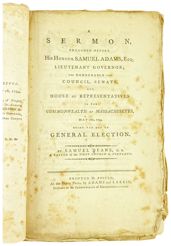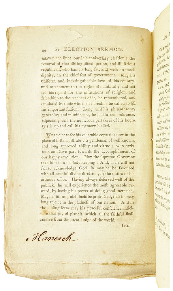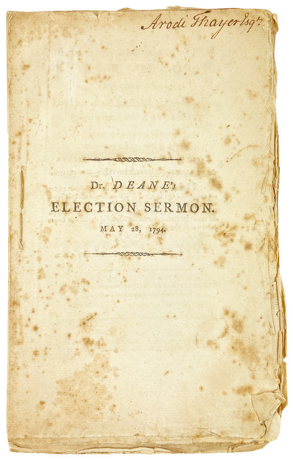 Provenance: Contemporary ownership signature at head of half title page of Arodi Thayer, Esq. (1743-1831). Though largely forgotten today, Thayer played a small but important role in pre-Revolutionary Massachusetts where he served as Marshal of the Court Admiralty. It was in this capacity that Thayer arrested John Hancock for smuggling in 1768. When the war broke out Thayer, a "Moderate Tory," was banished from Massachusetts from 1778 to 1790 as an enemy of the state. In his copy of this election sermon Thayer, newly returned to the state, has added in the bottom margin of p. 19 the name "Washington" (referred to in the text as the "Supreme Ruler of events"). A few pages later, on p. 22, Thayer has written "Hancock" in the bottom margin, the text referring to the recent death of "that distinguished person and illustrious republican, who has so long sat, and with so much dignity, in the chief seat of government."