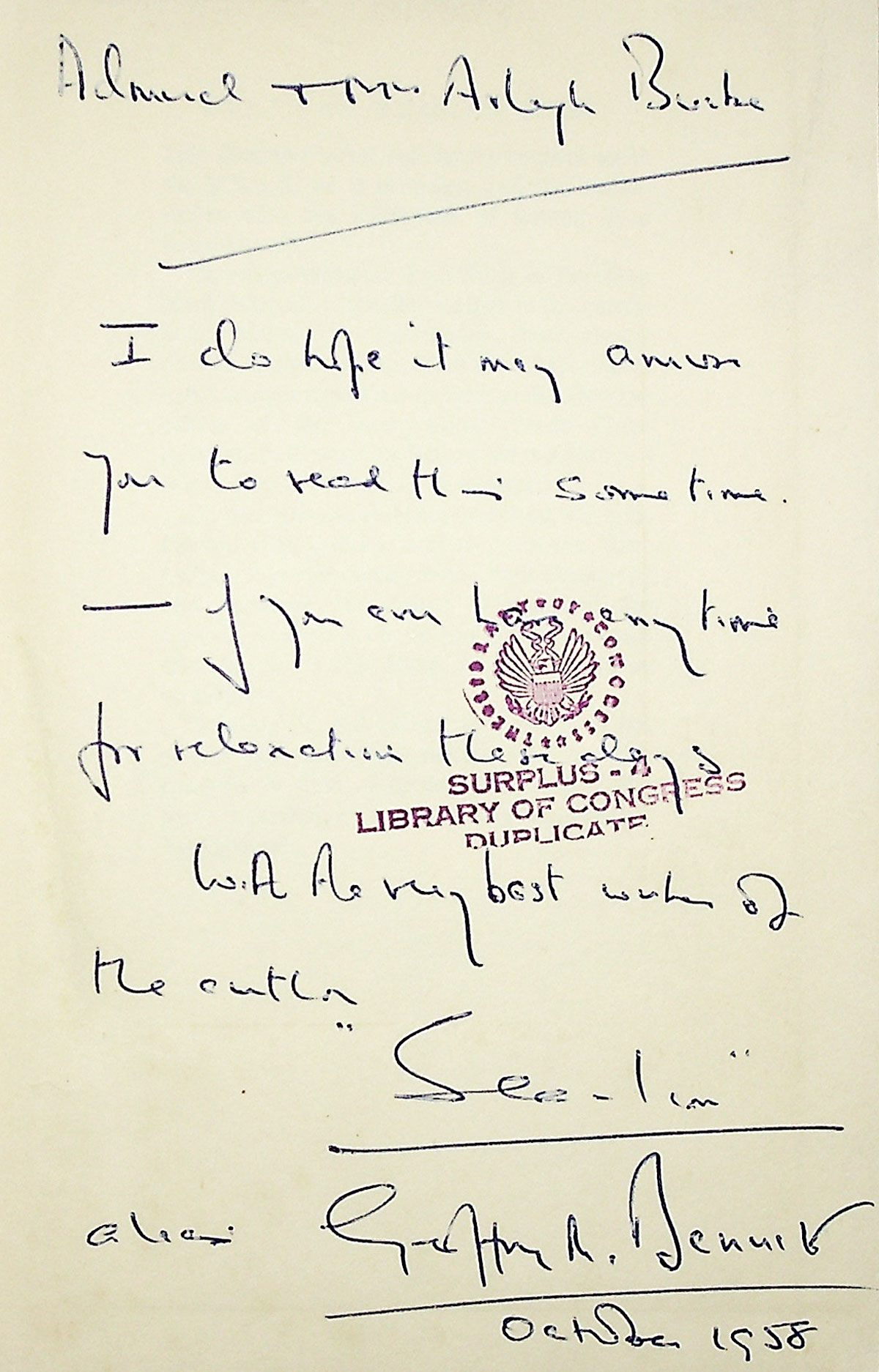 London: John Long Ltd, 1958. First Edition. First impression. Inscribed on front free endpaper: "Admiral .. Arleigh Burke / I do hope it may amuse you to read this some time - if you can have any time for relaxation these days. With the very best wishes of the author, "Sea Lion," signed "alias Geoffrey R. Bennett," dated in year of publication. With the printed bookplate of Admiral Arleigh Burke, Chief of Naval Operations; also laid-in are Burke's calling card and a small autographed placard. 12mo; blue cloth hardcover, 208pp. Light wear, spine mildly sunned, lacking dustwrapper. Library of Congress "duplicate" stamp to front free endpaper, underneath Bennett's incription. Very Good.