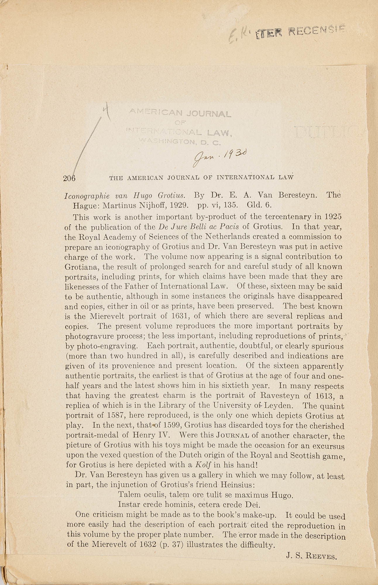 1929. Beresteyn, E.A. van. Iconographie van Hugo Grotius. The Hague: Martinus Nijhoff, 1929. 136 pp. 65 plates. Softbound, deckle edges. Previous owner's signature to front cover, newspaper clipping to front free endpaper. Light soiling and rubbing to exterior, minor wear to spine ends, small scuff to front joints, moderate toning to interior. A good copy. $30. * Text in Dutch. A well-produced catalogue raisonne of images of Grotius and people associated with him.