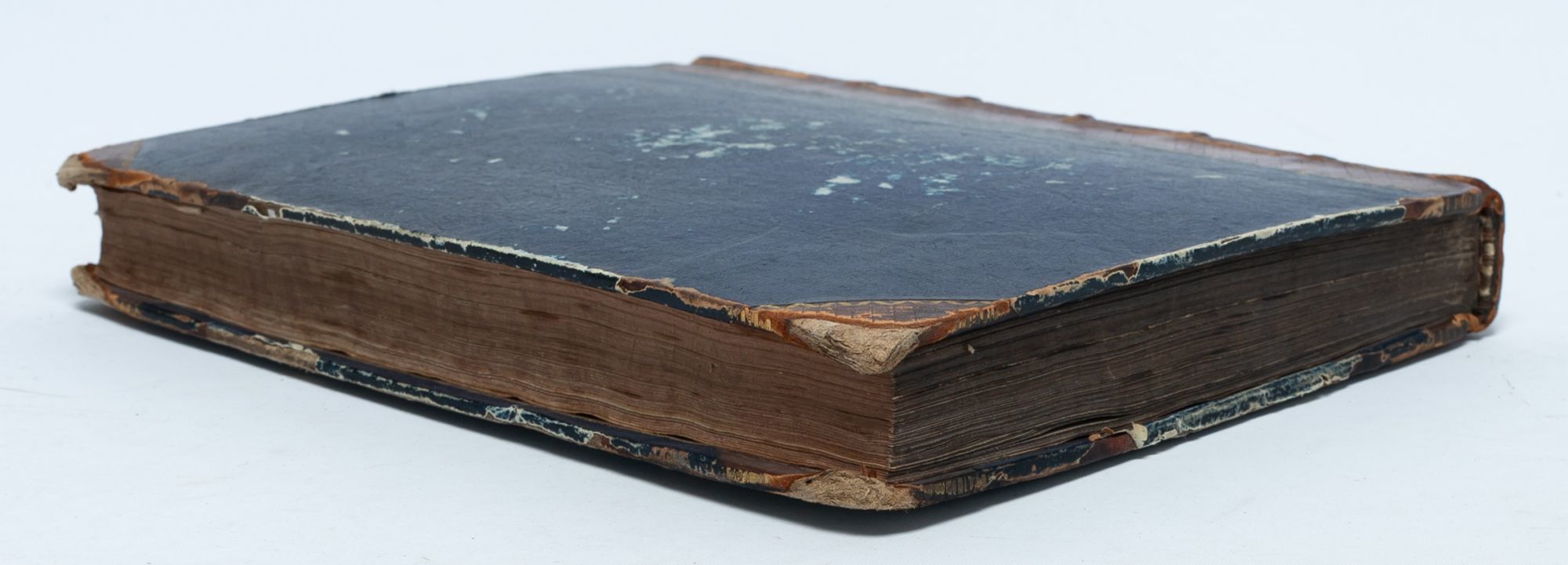 Bound in quarter diced calf over dark blue paper boards. Binding holding fine, but fairly worn at the corners and spine ends with a bookplate removed from the front paste-down and a shelf-location plate on the rear paste-down. Quarto (pages 222 x 175 mm) collating: 403, 79; complete but for the title page. Printed mostly in black letter with light foxing throughout.