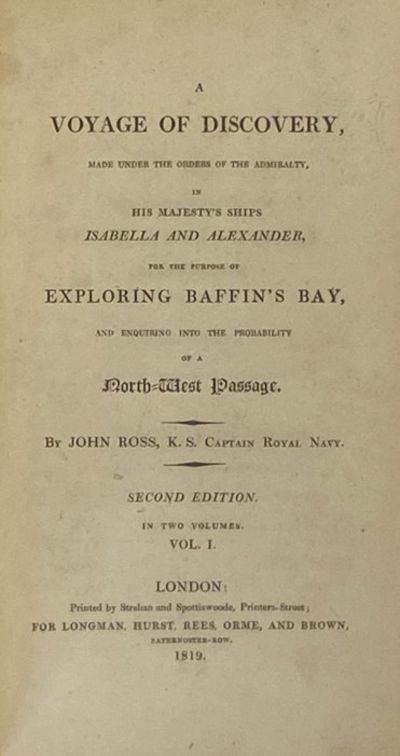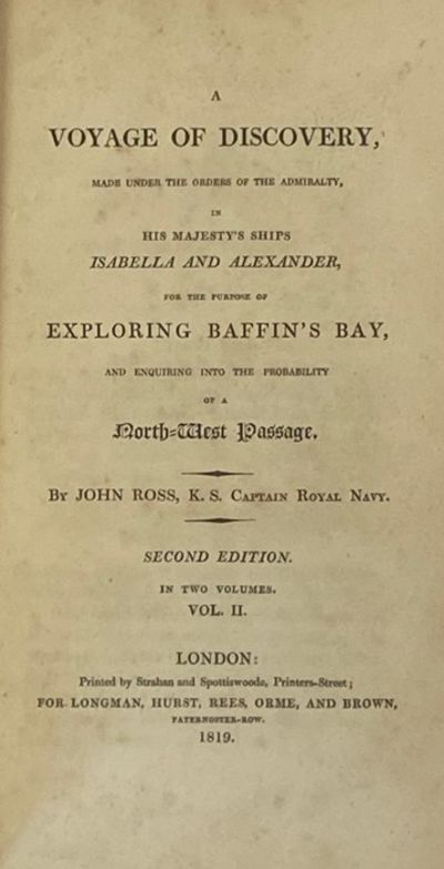 London: Strahan and Spottiswoode, for Longman, Hurst, Rees, Orme, and Brown, 1819. Second Edition. Hard Cover. Very Good/No Jacket. Second edition. Rebound in library buckram. Minor tape repairs to fold-outs, expected transfer, otherwise an exceptional set. 1819 Hard Cover. lxix, 265, [2]; 258 pp. 8vo. Two fold-outs (one of Davis' Strait and Baffin's Bay, one depicting several geological instruments) and deviation chart follow text of vol. 2. 2-page terminal publisher ad in both volumes advertises other travel books. Published first in a single quarto volume, this work was reissued in a second edition of two octavo volumes the same year. Based on auction records, the second edition seems the more uncommon of the two, though the original remains the more desirable edition, and includes aquatints and fold-outs not present in the edition offered here. An account of Ross's first Arctic expedition in 1818 (he returned in 1829 and 1850). Launched shortly after Ross rose to the rank of Commander of the Swedish Navy, the expedition's main achievements were to open northern Baffin's Bay to whaling, and to spur the further exploration of Lancaster Sound, which would ultimately prove to be the eastern extremity of the much-sought-for Northwest Passage. A critical navigational error made by Ross during the voyage (the controversy of which is discussed herein), prevented him from making this discovery himself. Includes a "Comparative List of the Northern and Southern Humooke Dialects," as well as a list of "Words the Same in Both Dialects." Arctic Bibliography 14873: "Sir John Ross commanded the Isabella and the expedition, with Sir W.E. Parry in command of the Alexander. The vessels sailed from England Apr. 18, to Davis Strait and along the west coast of Greenland to the entrance of the Smith Sound; thence southward past Jones Sound to Lancaster Sound; after exploring it, the vessels continued southward, making a test of the breadth of Davis Strait, and returning to England by Nov. 14. Discoveries made by this expedition include Melville Bay, Cape York, Prince Regents Bay (Dedodes Fjord), Whale Sound, Carey's Islands, and numerous bays, capes, and mountains. Contains a journal of the voyage, with information on the ice conditions, descriptions of Polar Eskimos (whom Ross termed 'Arctic Highlanders') of the Cape York region, and of extensive stretches of red snow seen there; a record of personnel, equipment, all orders, and work carried out." Sabin 73376.