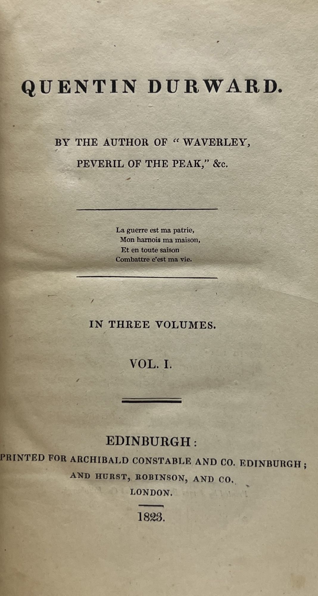 Edinburgh: Archibald Constable & Co, 1923. First Edition. Hardcover. Good. Complete in three volumes. About Good. Quarter tan paper with blue paper on the boards, generally toned and soiled, rubbed and bumped at the edges and corners, splitting at the top joint of Vol. I. Square, bound with some reading wear, old reinforcements at the joints, foxing throughout. One of Scott's Waverley novels, the story of an archer in the service of King Louis XI.