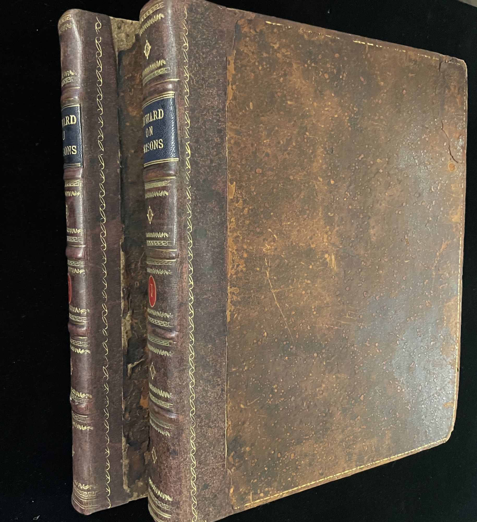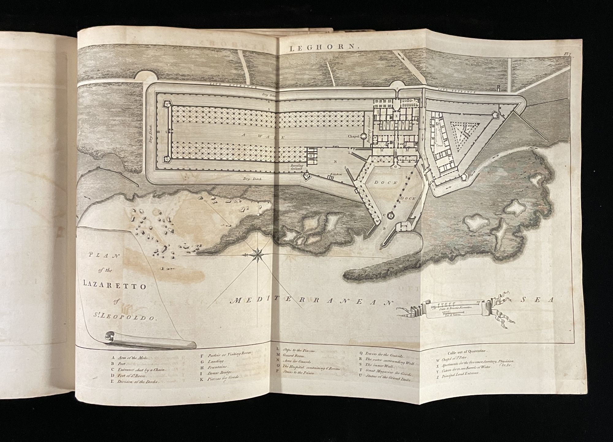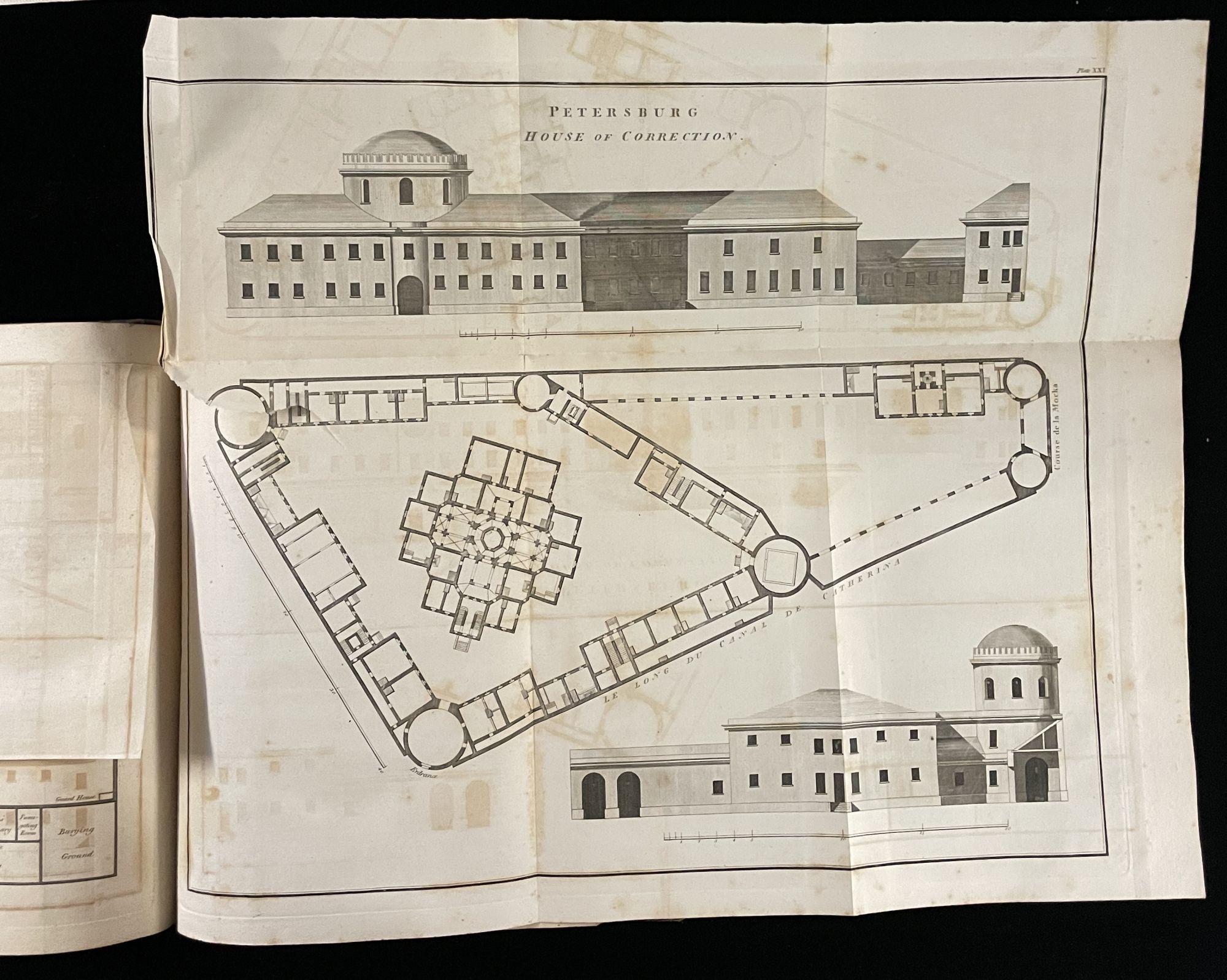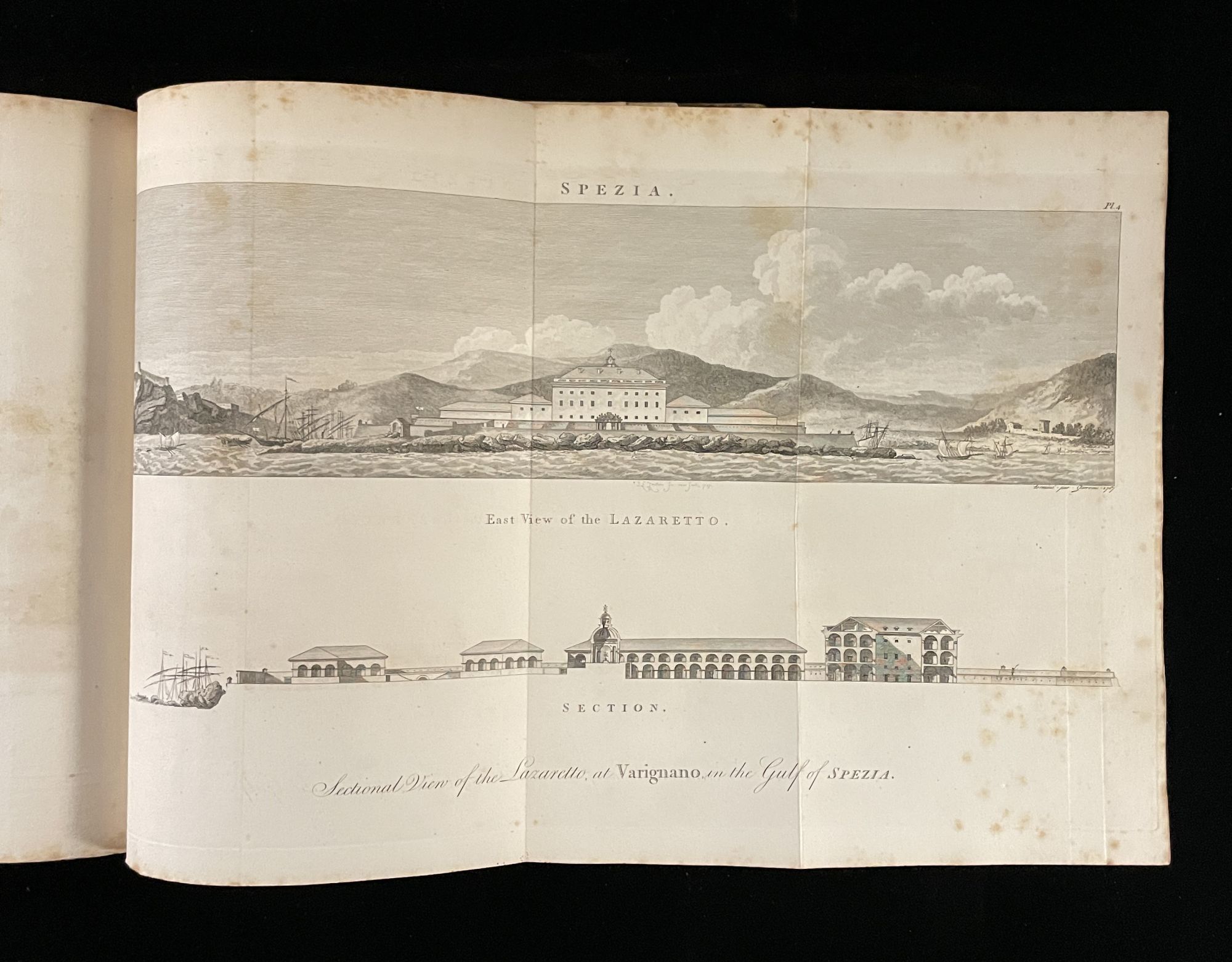 London: Printed for J. Johnson, C. Dilly, and T. Cadell, 1791. 4th Edition. Hardcover. Very Good. Two volumes, large 4to, uniformly printed and bound. Volume 1 (stated fourth edition, dated 1792): The State of the Prisons in England and Wales, with Preliminary Observations , and an Account of Some Foreign Prisons and Hospitals. 540pp with 492 (text), 23 (index), (directions to binder), 28 (Historical remarks and anecdotes on the castle of the Bastille translated from the French and published in 1774). Volume 2 (stated second edition, dated 1791): An Account of the Principal Lazarettos in Europe; with various papers relating to the Plague; together with Further Observations on some Foreign Prisons and Hospitals; and additional remarks on the present state of those in Great Britain and Ireland. 22 plates total. 259pp ( plates in text #1,2,9,12, 14,15,16,17, 18, 19,20, 21),3 (index), 32 (appendix), rear plates 3,4,5,6,7,8,10,11,13,22, tables originally published 1772, republished 1784. Directions to binder after Contents in Volume 2; all plates bound as called for. John Howard (1726 -1790) was a philanthropist and early English prison reformer, who published the first edition of "The State of the Prisons" in 1777, having visited several hundred prisons across England, Scotland, Wales and wider Europe. His fourth and final tour of English prisons began in March 1787 after which he published The State of the Prisons in England, and An Account of the Principal Lazarettos of Europe, the last version of his life work, offered here. Presumed original calf binding preserved, with new leather spines with gilt in period style, Intermittent, moderate foxing throughout both volumes; all plates in original folds. All considered, in thoroughly presentable condition. With an early 19thC baronial bookplate and an early 20thC American one, too.