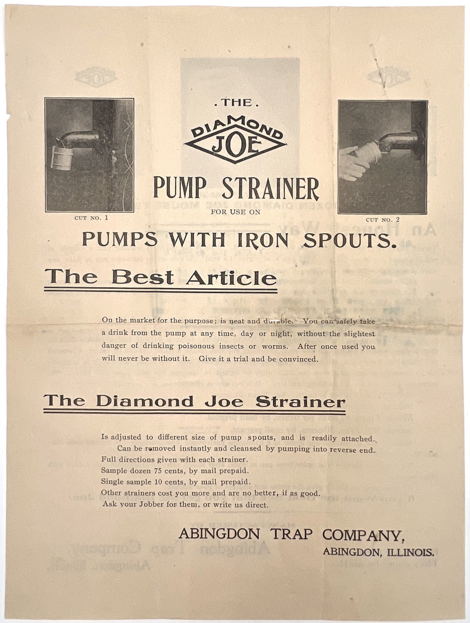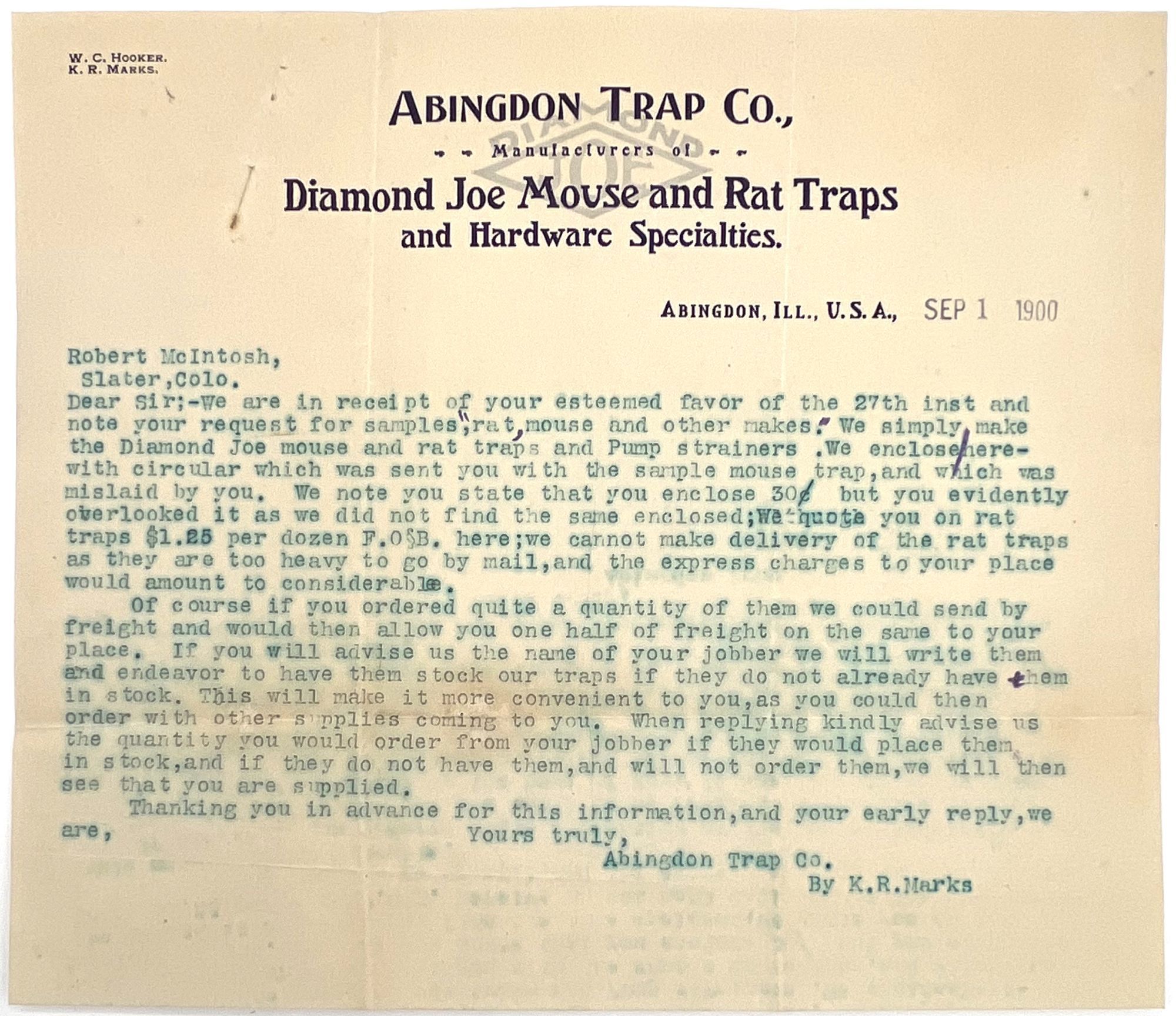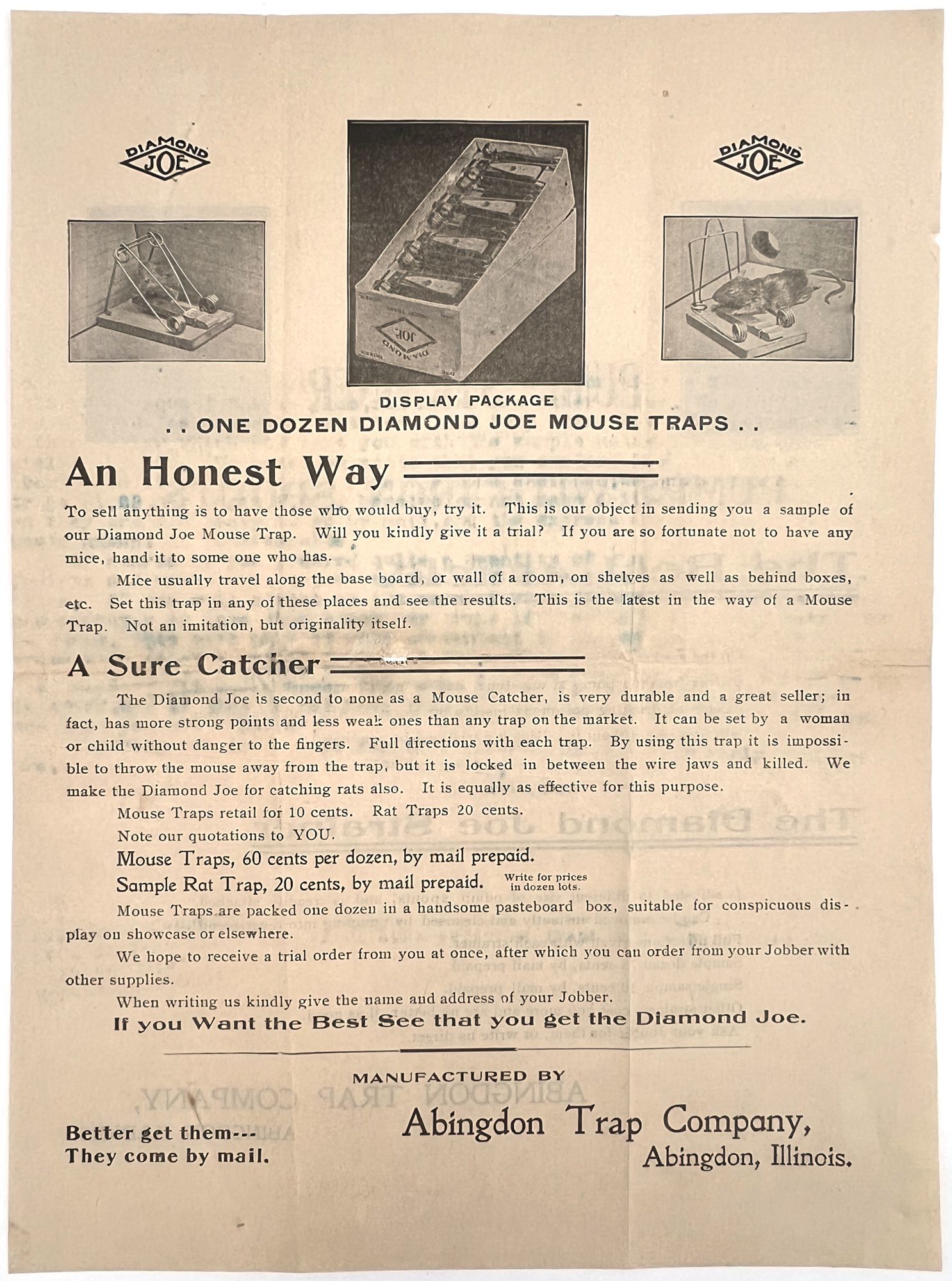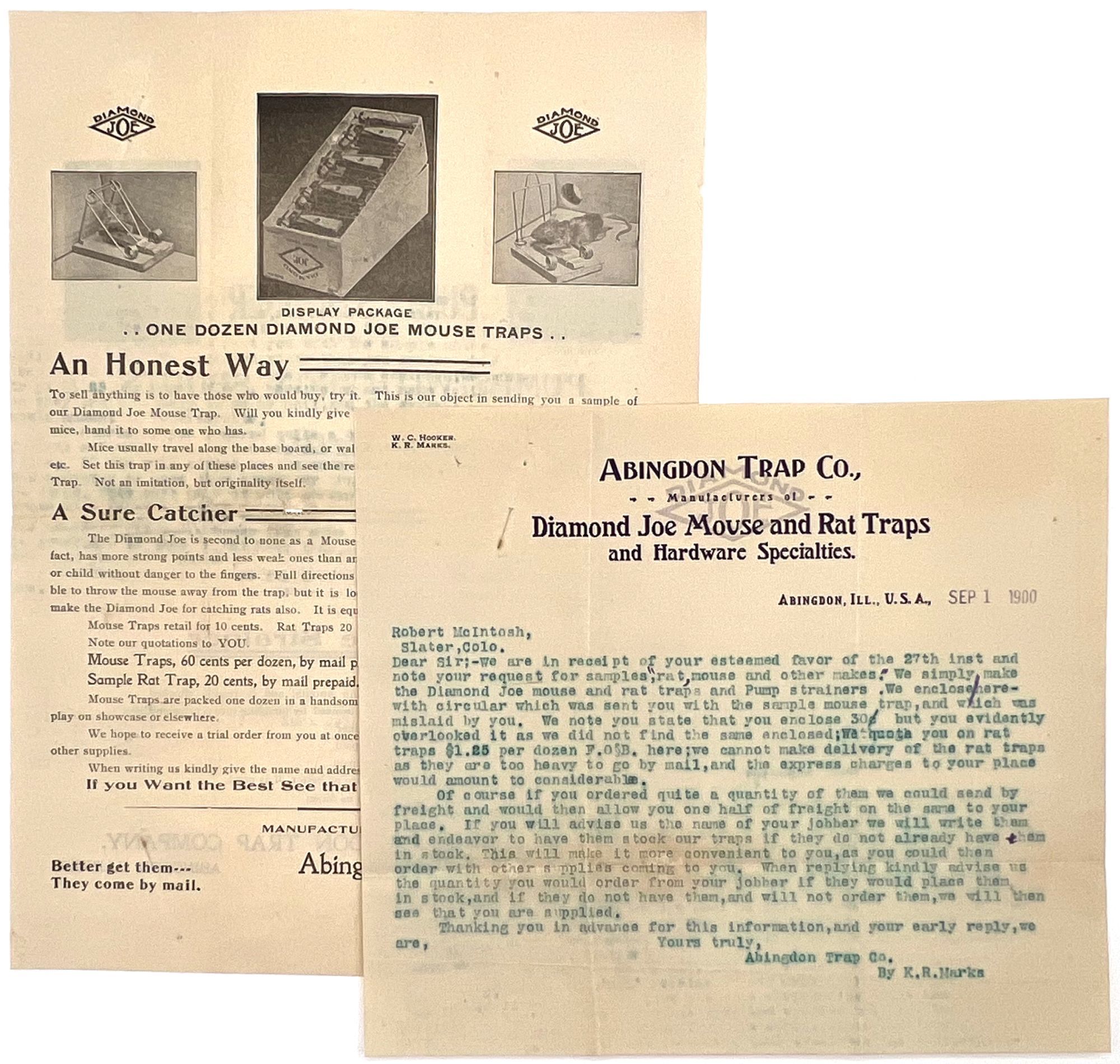 Abingdon, Illinois: Abingdon Trap Company, 1900. Very good. Toned. Ink bleed from blue ink used on letter.. Illustrated circular and sales letter on company billhead advertising mouse traps sold by the Abingdon Trap Co. Specifically promotes the "Diamond Joe Mouse and Rat Traps" line of products. Includes a photo of the traps in the box, as well as before and after photos of the poor mouse who encountered one of the traps. Includes pricing, and mail-order delivery. Circular measures approx. 10.75" by 7.75"; billhead measures approx. 7.25" by 8.25
