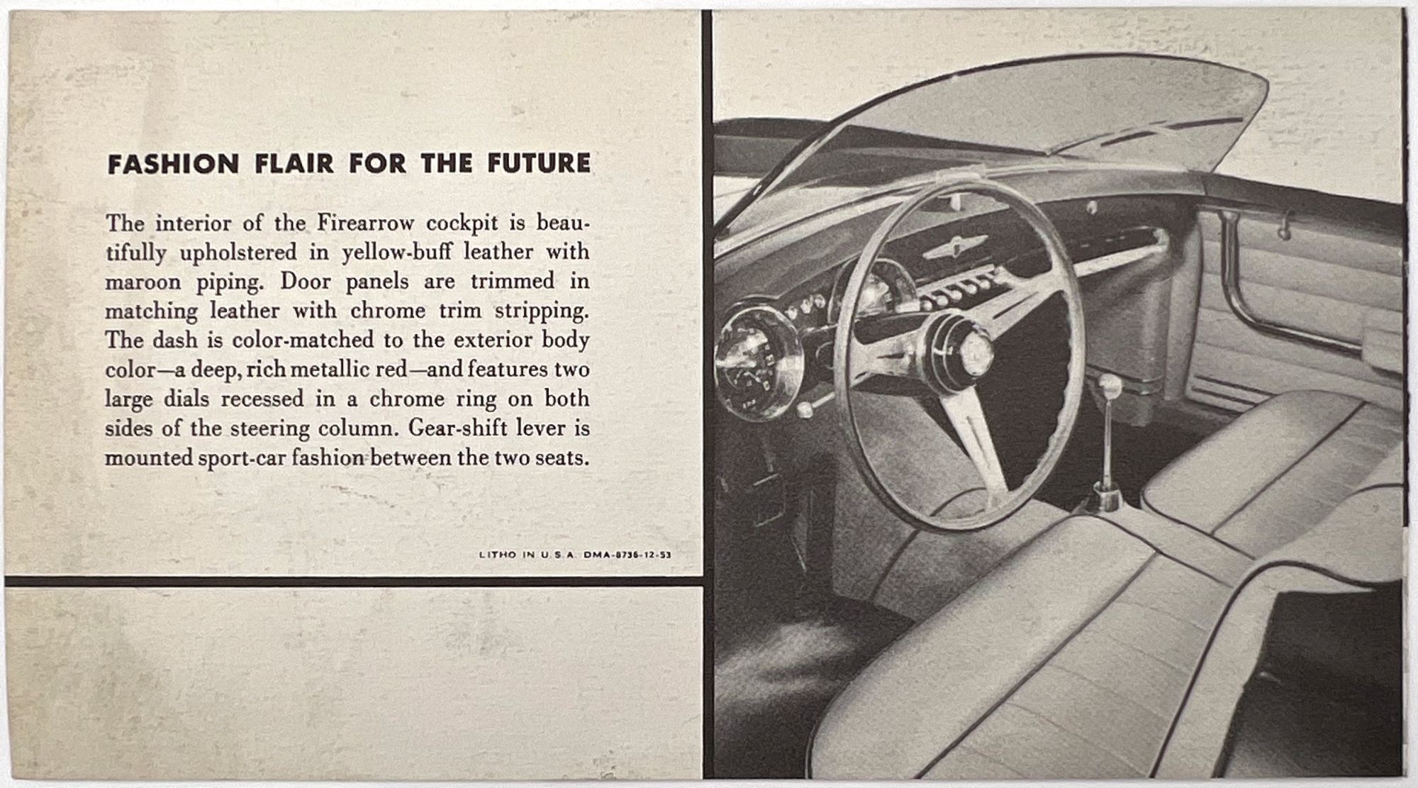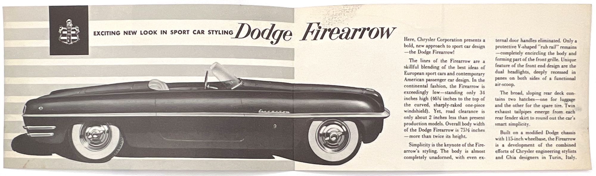 [Detroit, Michigan]: Dodge, 1953. Very good to near-fine. Minor toning.. Printed advertisement for the Firearrow, a "new kind of sports car" marketed by Dodge as "fashion flair for the future". Includes photos of the roadster's futuristic dashboard, front and side views. Illustrated bifolium measuring approx. 4" by 7.25" The Dodge Firearrow II was a one-off concept / dream car designed in the early 1950's by Chrysler Corporations legendary design chief, Virgil Exner and hand built by Ghia Coachbuilders of Turin Italy.