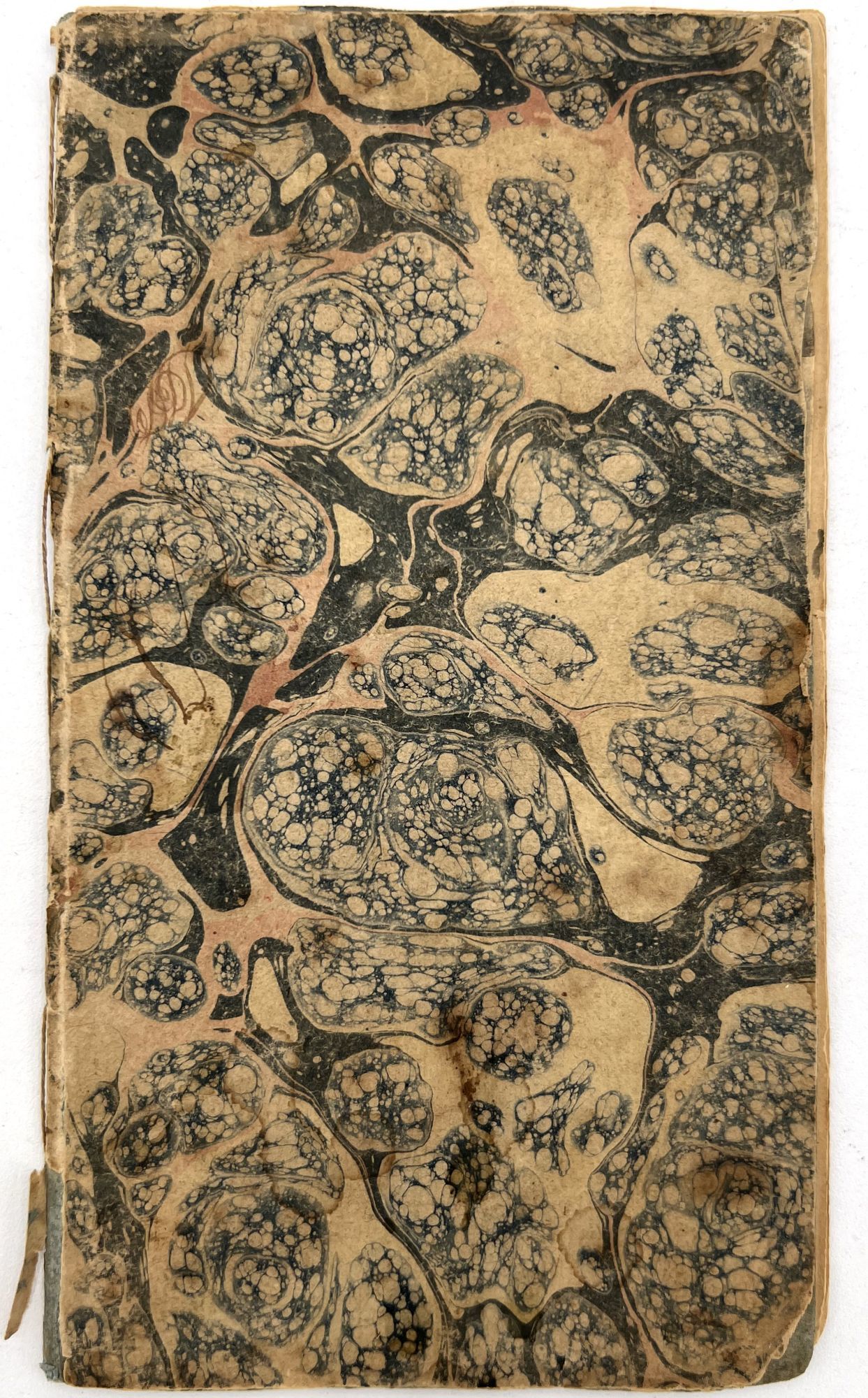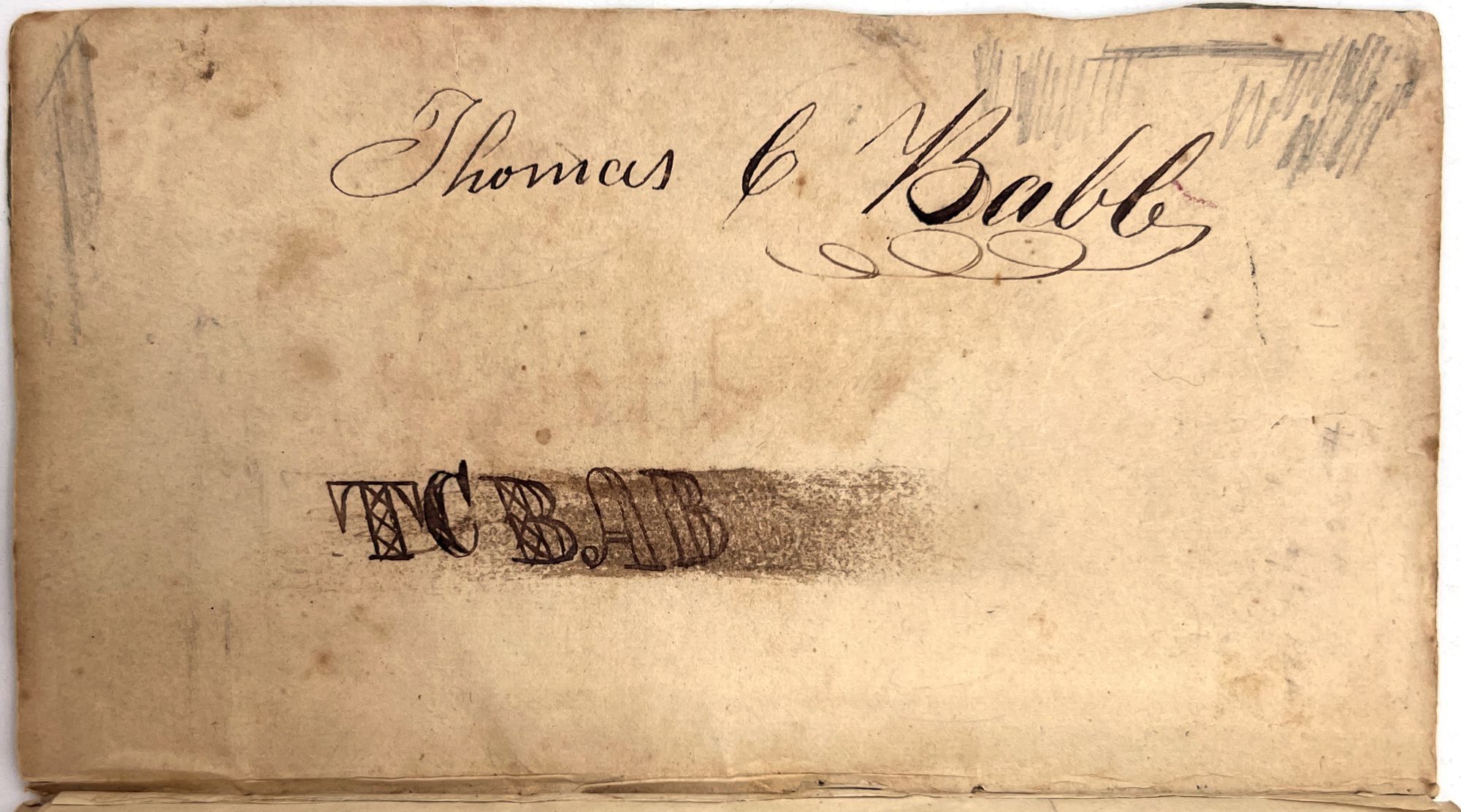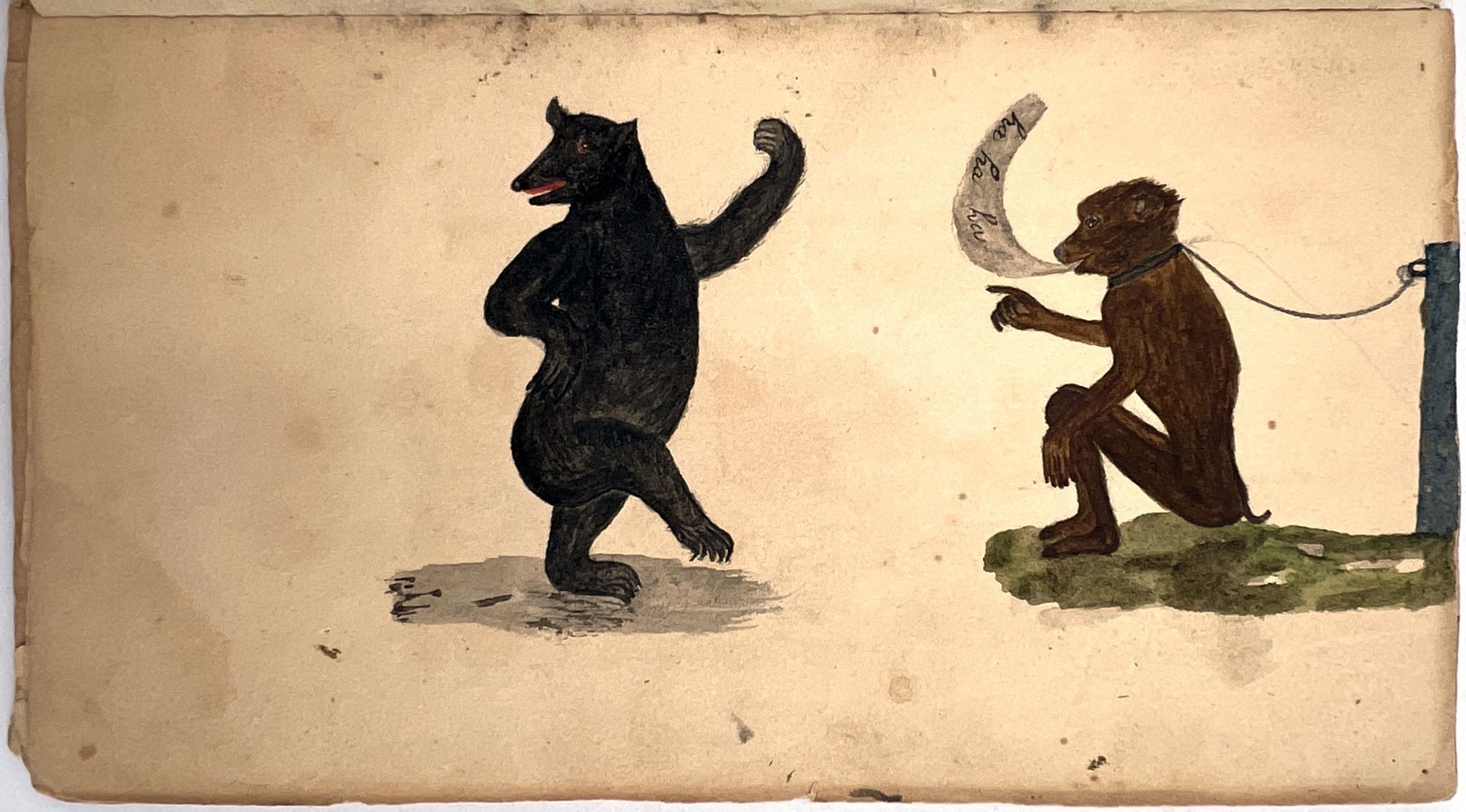 [United Kingdom?], 1840. Good to very good. Some toning, dust soiling, wear to extremities.. A charming pocket-sized sketchbook belonging to Thomas C. Babb, with original artwork. There are three pages with artwork, including: a pastoral view of a mill with horse and carriage and man fishing in the foreground; a dancing bear and laughing pet monkey; a dog barking at a rearing big horned sheep, and a peaceful miniature scene of a horse grazing in front of dilapidated ruins. Rendered in pencil, ink, and watercolor. Single vol. (6.5" by 3.75"), 14 unnumbered blank pages, three with original artwork, some pages sometime excised including a leaf with ink ms., sewn in original handmade marbled paper wrappers, spine reinforced with a metal pin. Ink signature of Babb to inside of upper cover. Note that, regretfully, the final leaf seems to have been at one point torn away; the remaining stub reads, "A Catalogue of T.C. Babb's books". The first one appears to have been some kind of lesson book.