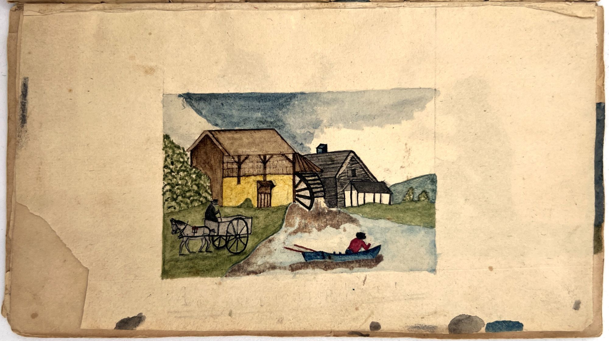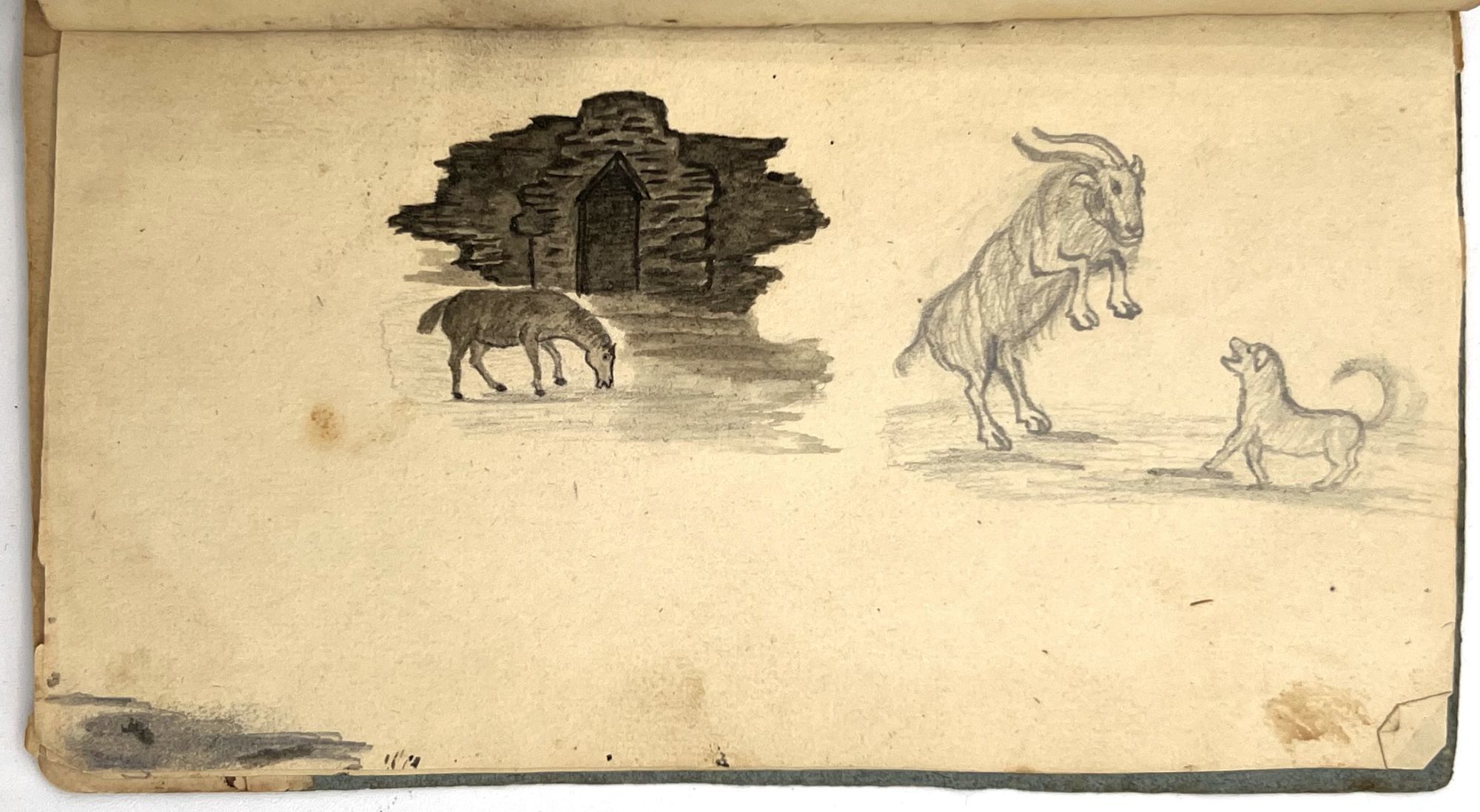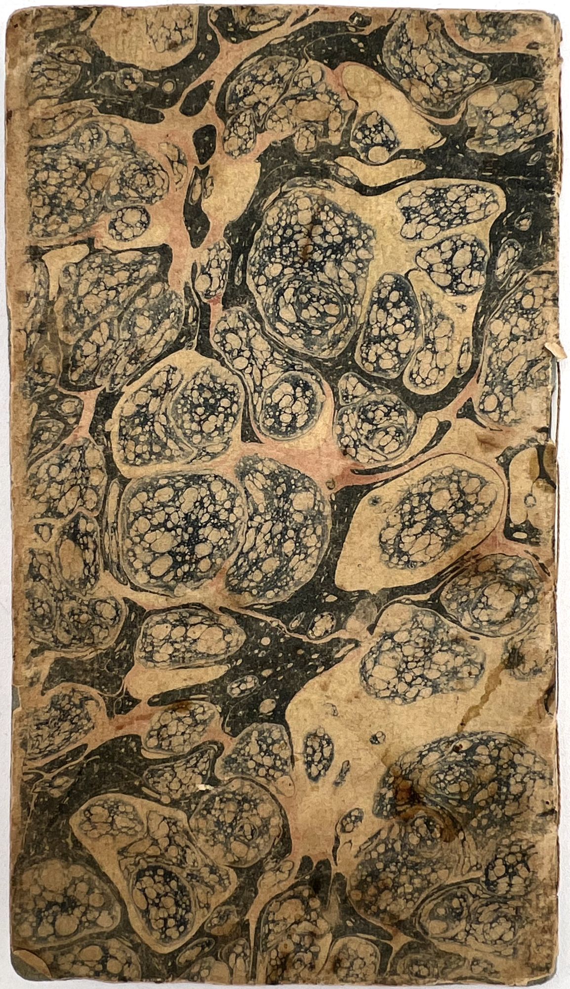 [United Kingdom?], 1840. Good to very good. Some toning, dust soiling, wear to extremities.. A charming pocket-sized sketchbook belonging to Thomas C. Babb, with original artwork. There are three pages with artwork, including: a pastoral view of a mill with horse and carriage and man fishing in the foreground; a dancing bear and laughing pet monkey; a dog barking at a rearing big horned sheep, and a peaceful miniature scene of a horse grazing in front of dilapidated ruins. Rendered in pencil, ink, and watercolor. Single vol. (6.5" by 3.75"), 14 unnumbered blank pages, three with original artwork, some pages sometime excised including a leaf with ink ms., sewn in original handmade marbled paper wrappers, spine reinforced with a metal pin. Ink signature of Babb to inside of upper cover. Note that, regretfully, the final leaf seems to have been at one point torn away; the remaining stub reads, "A Catalogue of T.C. Babb's books". The first one appears to have been some kind of lesson book.