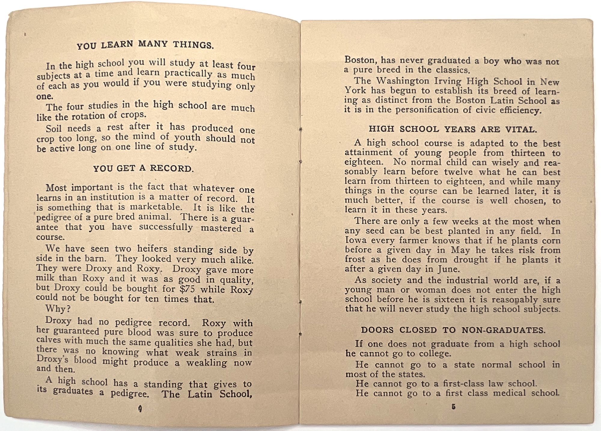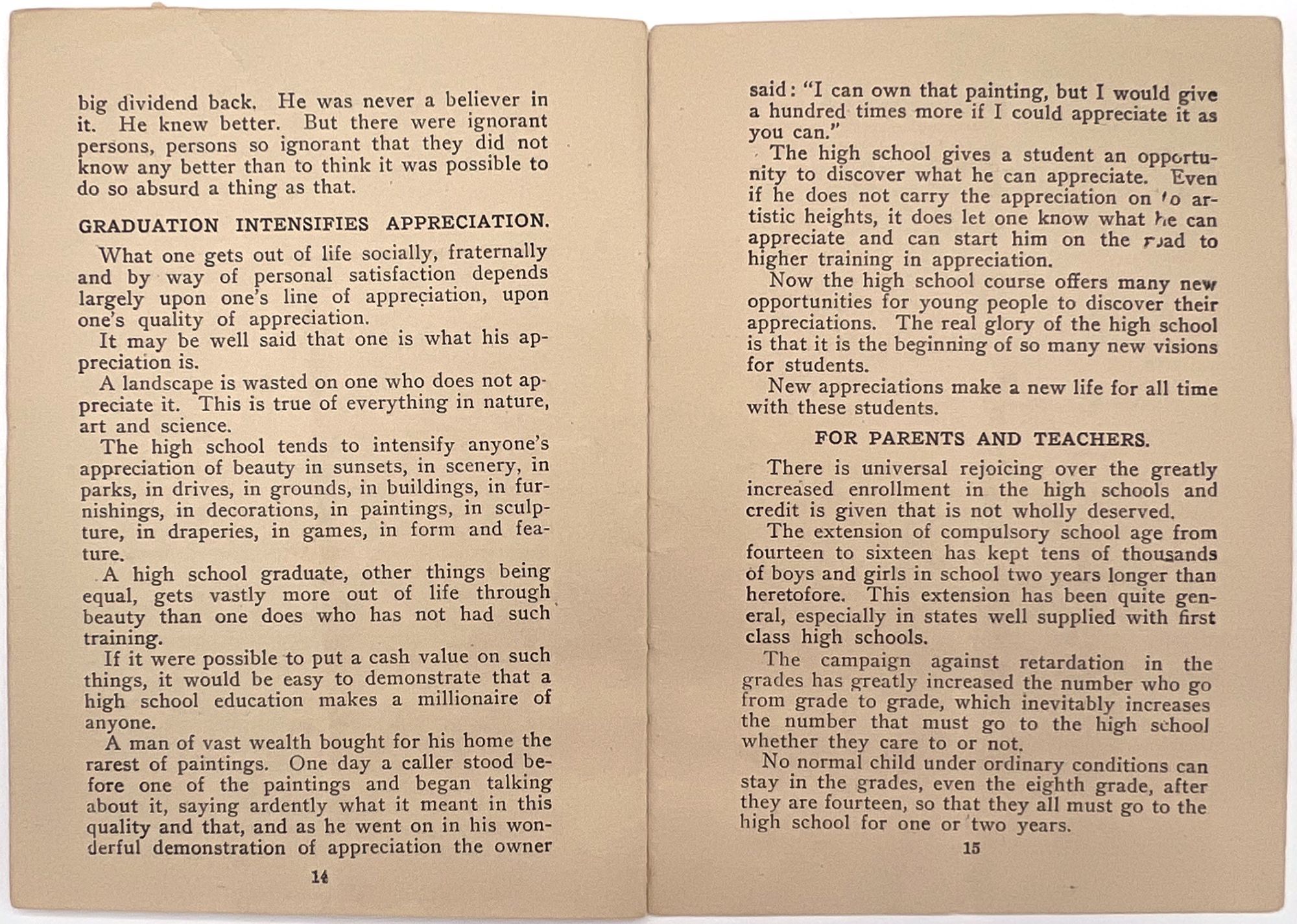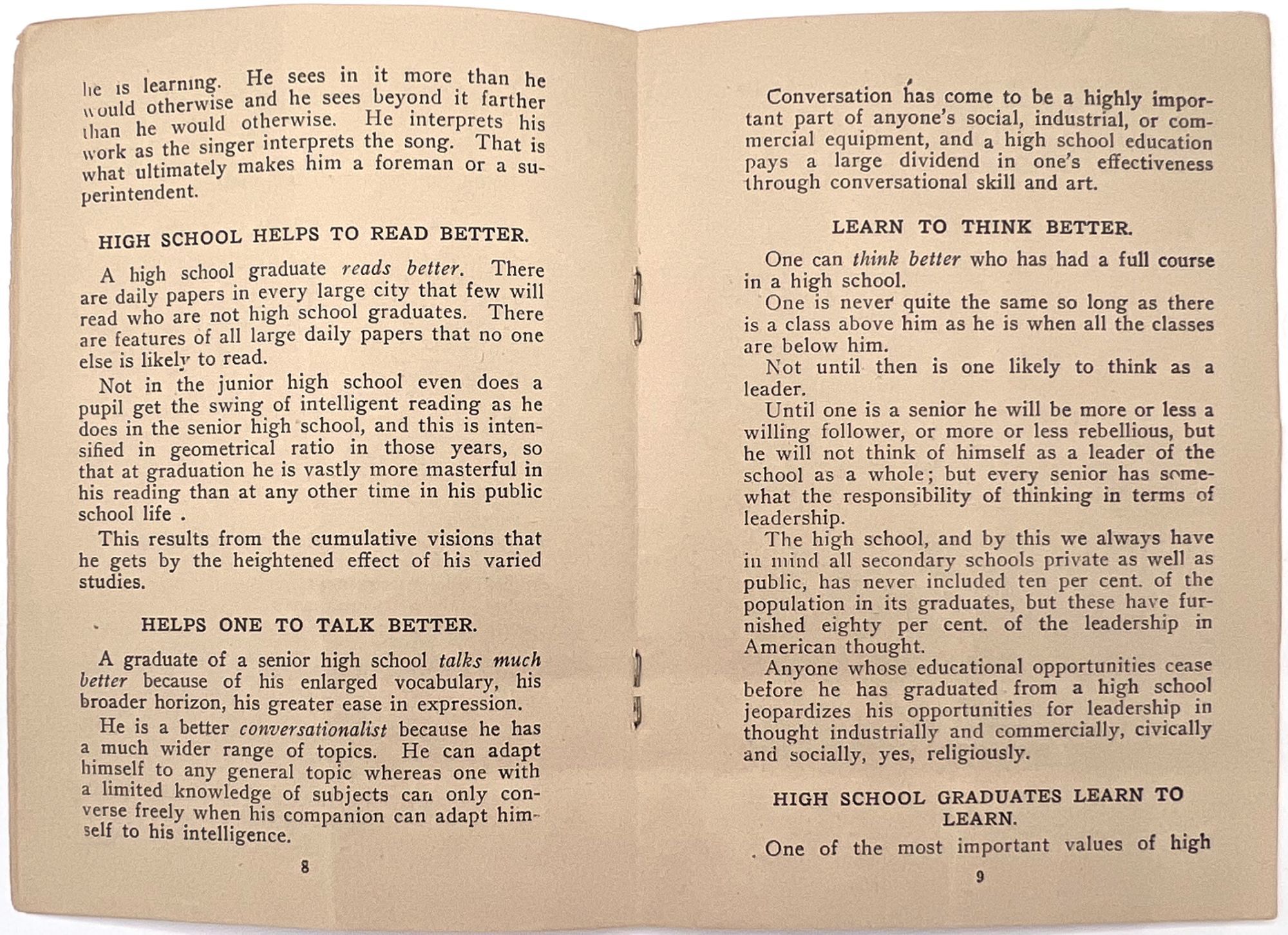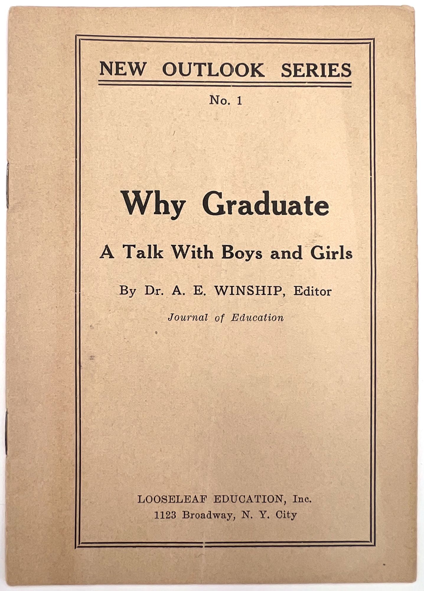 New York, New York: Looseleaf Education, Inc, 1926. Very good. Toned. Vertical crease. A couple minor short tears to spine.. A fascinating look into social values surrounding education in 1926, from a booklet encouraging young people to pursue education and graduate from high school: "Most of the really great men of America have found themselves, as the saying is, in their high school, academy, or preparatory school life. Those are the years in which one is likely to go wrong or right. They are the turning-point years in most lives" (p. 16). Offers young people reasons to graduate, such as better opportunities, pay, and appreciation of life. Includes a form on the inside of the upper wrapper, asking the student about their favorite subject, what extra curricular activities they take part in, and-- most interestingly-- asks them to grade themselves 1-3 in different personal qualities including: Alert, Energetic, Square, Polite, Reliable, Industrious, Orderly, Optimistic, etc. Single vol. (6" by 4.25"), pp. 16, original printed self wrps.