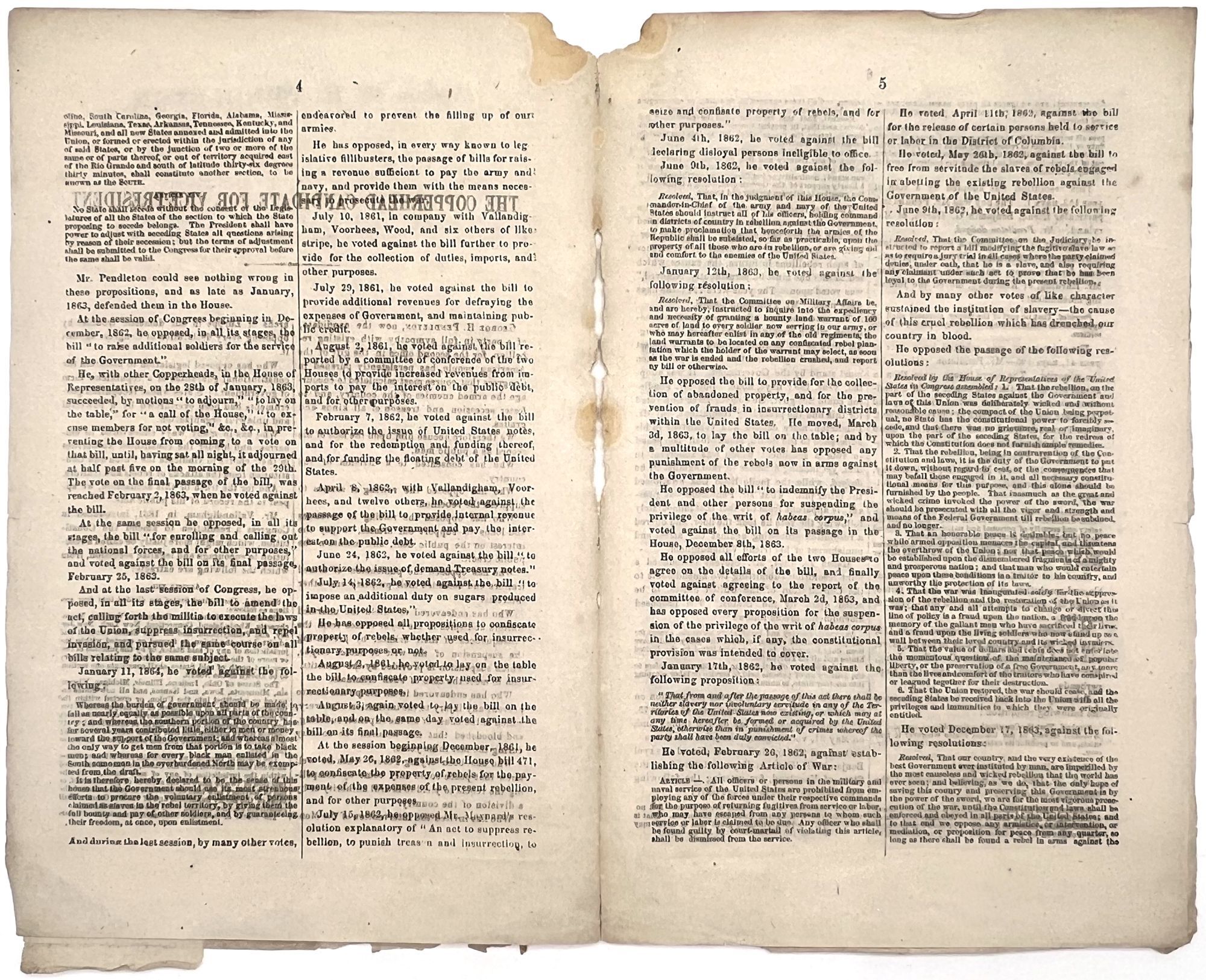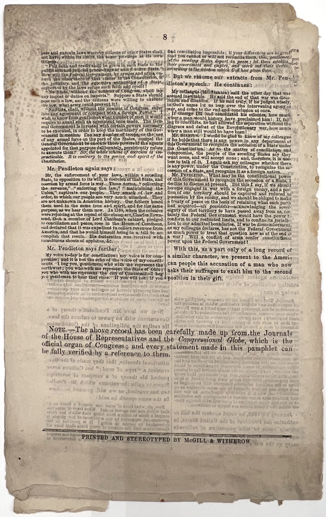 Washington, D.C.: Union Congressional Committee, 1864. Good. Toned, short tears, chipping, dust soiling.. A fiery political pamphlet published by the Union Congressional Committee, penned to discourage other Northerners from supporting George Hunt Pendleton's (ultimately unsuccessful) bid for Vice President. Pendleton had emerged by 1864 as a leader in the "Copperhead" faction of congress, otherwise known as the "Peace Democrats", so named for their push for peace with the South. The present pamphlet argues that this push for peace was, in practice, a boon to the South. Single vol. (9.5" by 6"), pp. 8, unbound.
