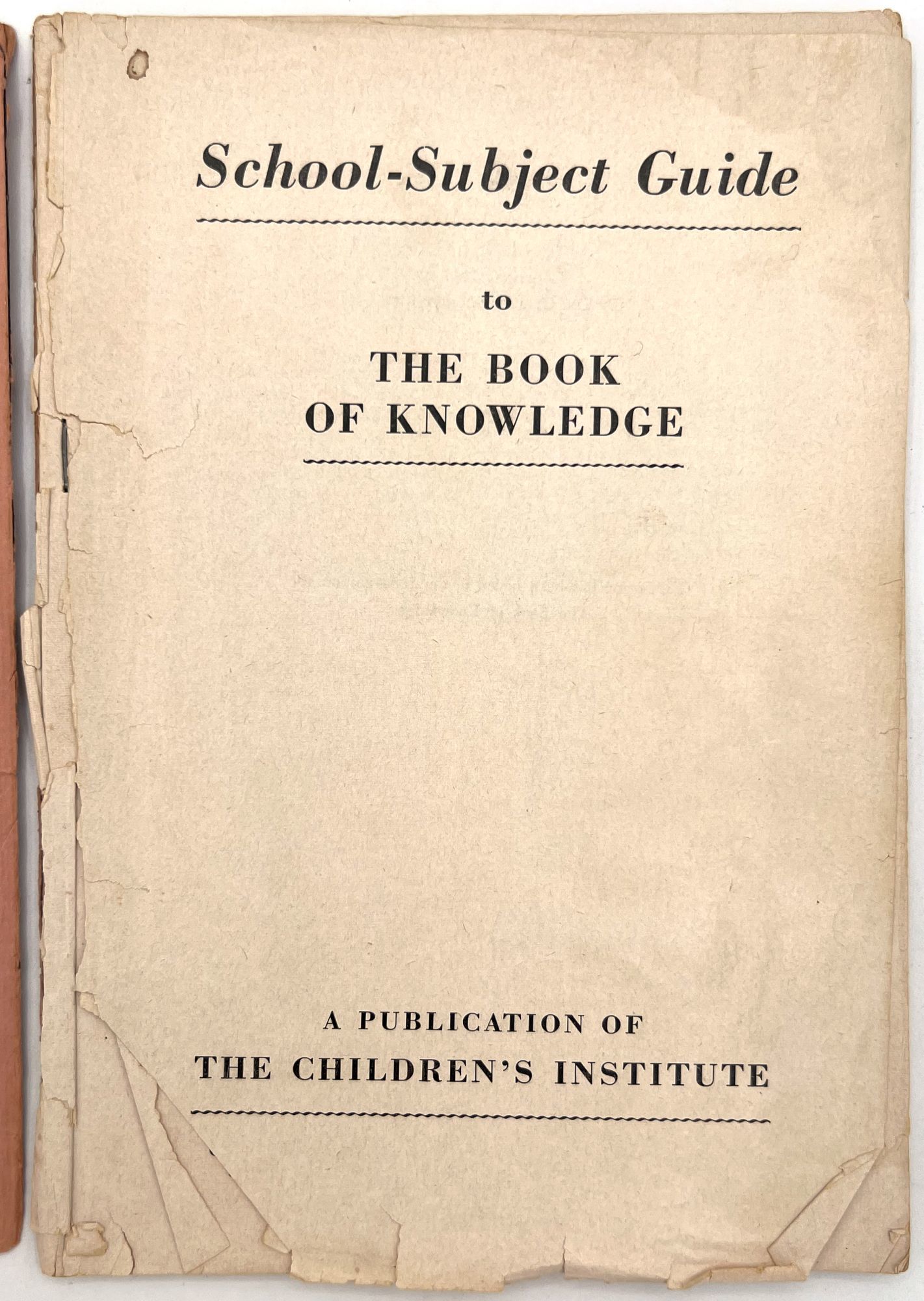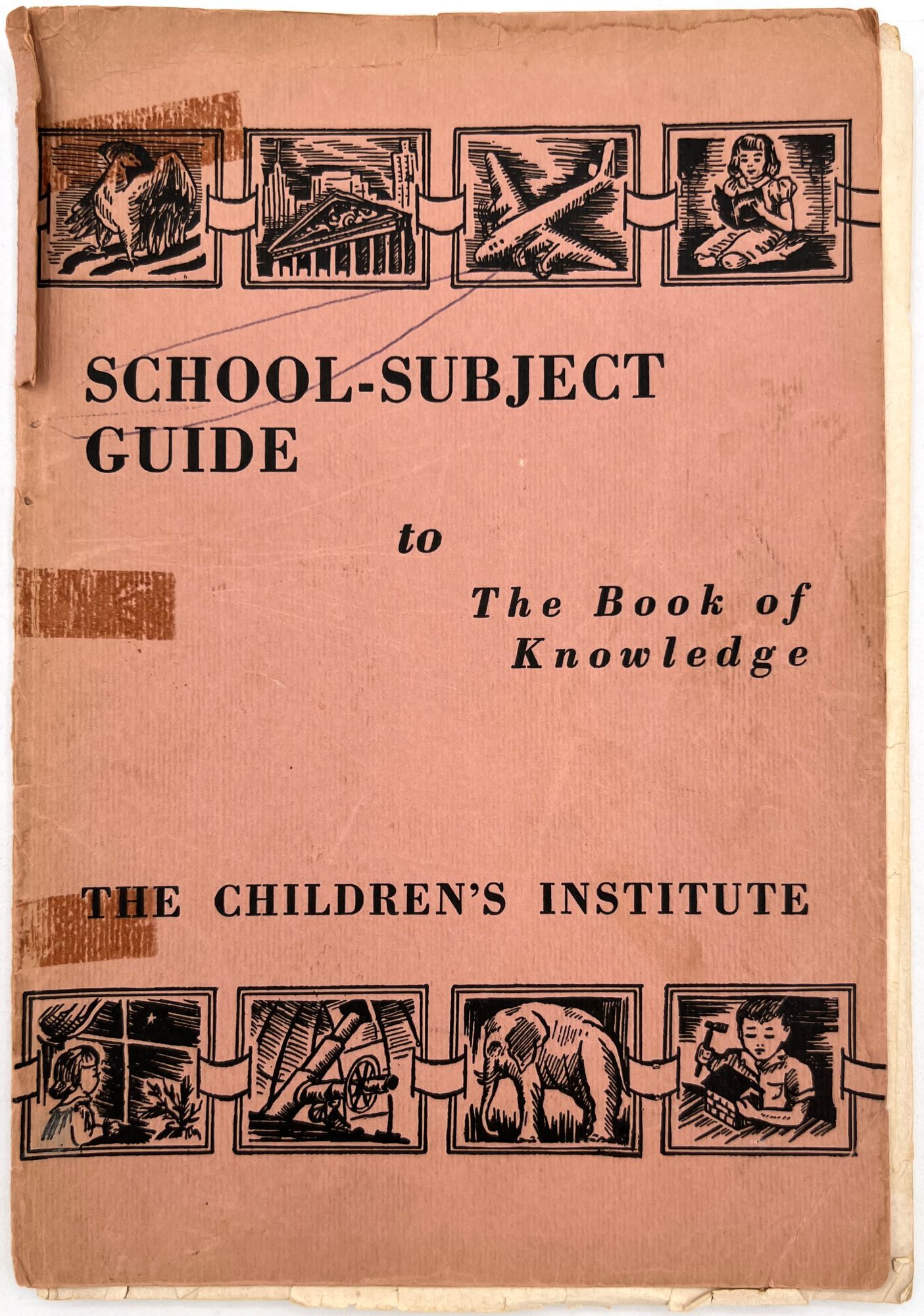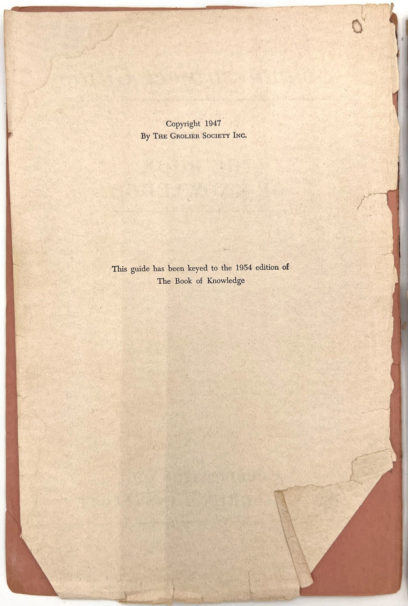 "School-Subject Guide to The Book of Knowledge". New York: The Grolier Society, c.1954. Single vol. (9.5" by 6.5"), pp. 127, [1], original printed salmon pink wrps with illus. at top and bottom.