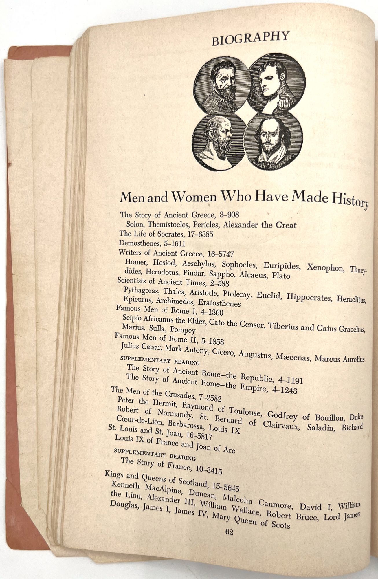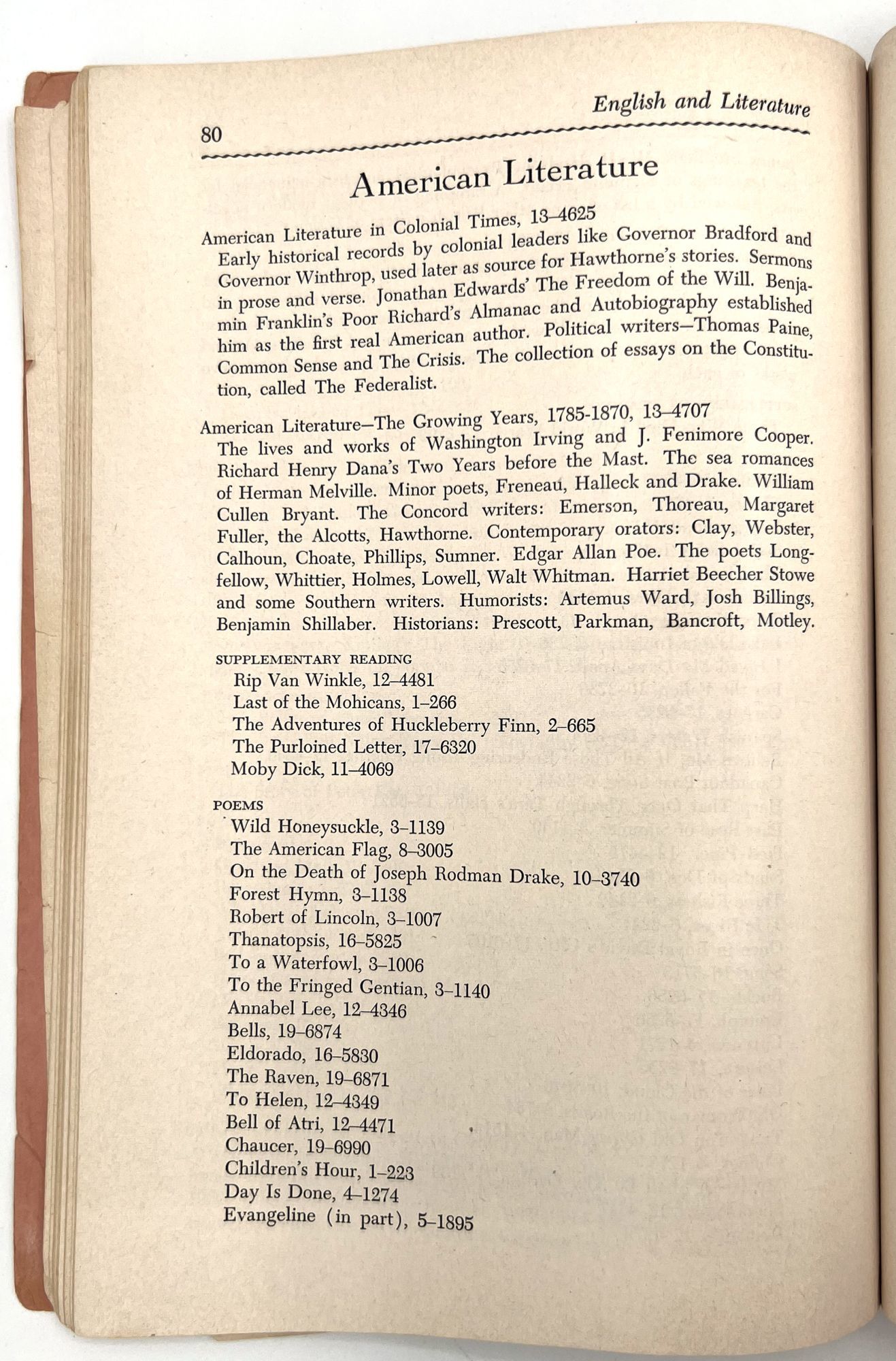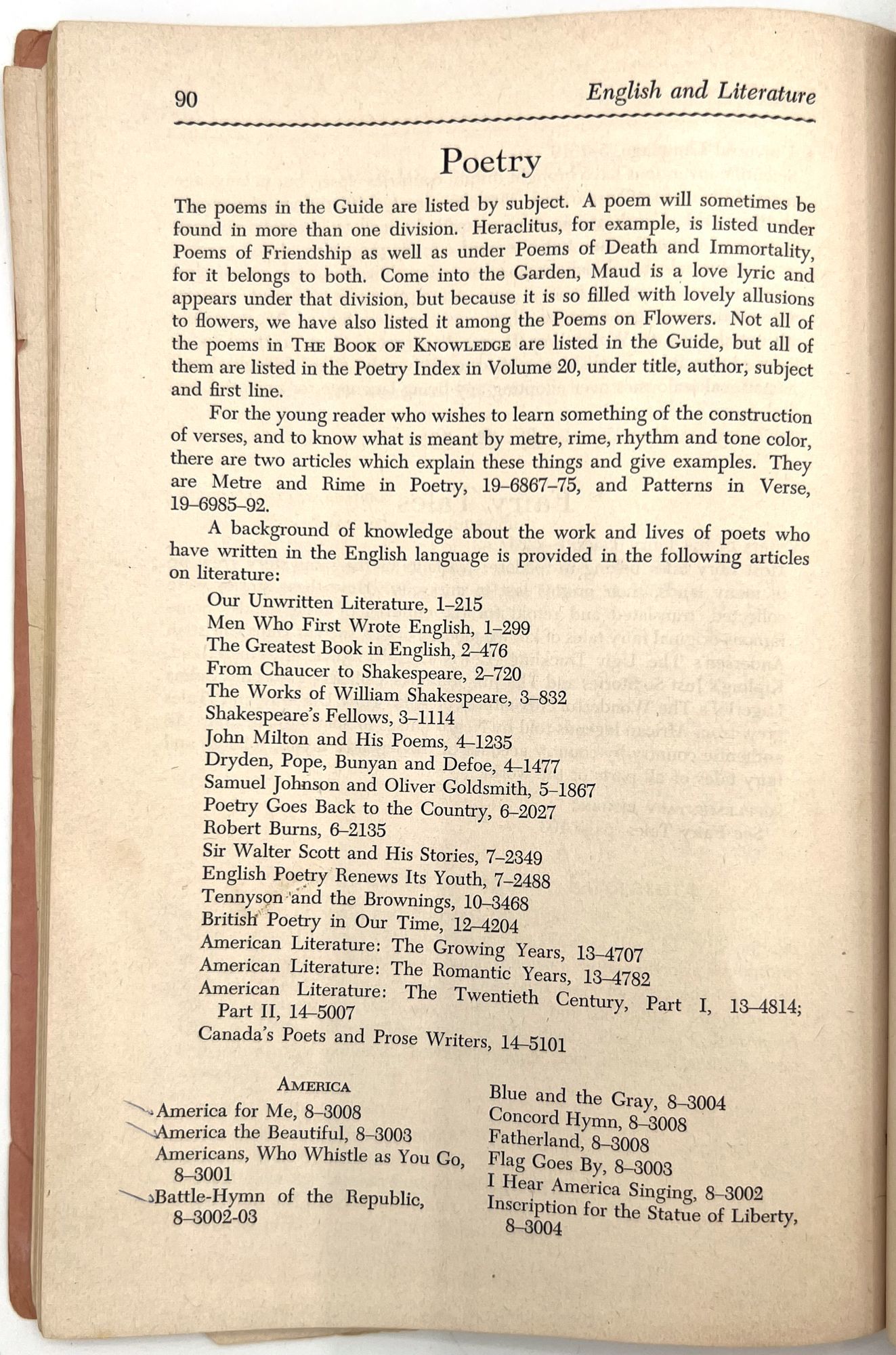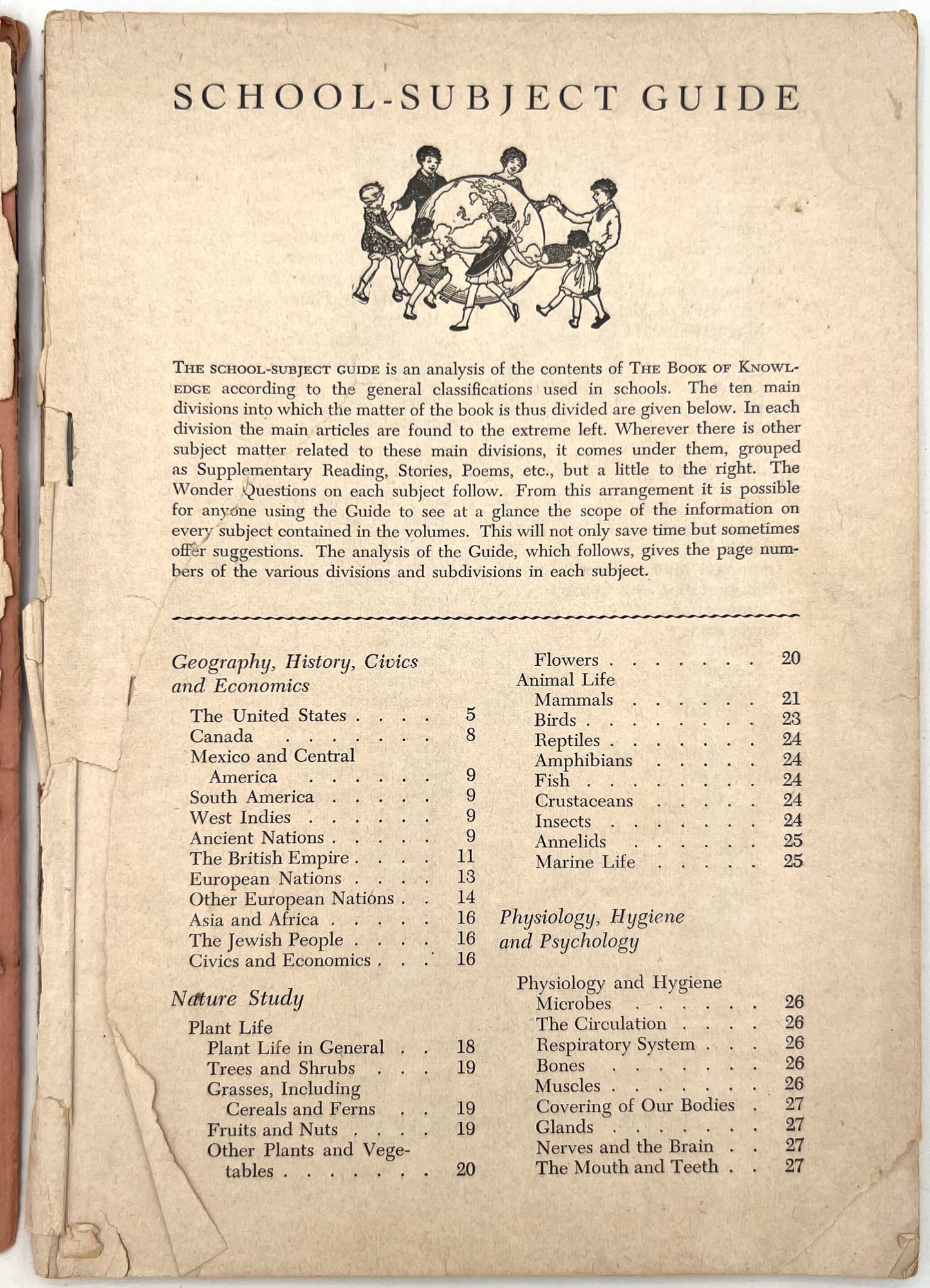 "School-Subject Guide to The Book of Knowledge". New York: The Grolier Society, c.1954. Single vol. (9.5" by 6.5"), pp. 127, [1], original printed salmon pink wrps with illus. at top and bottom.