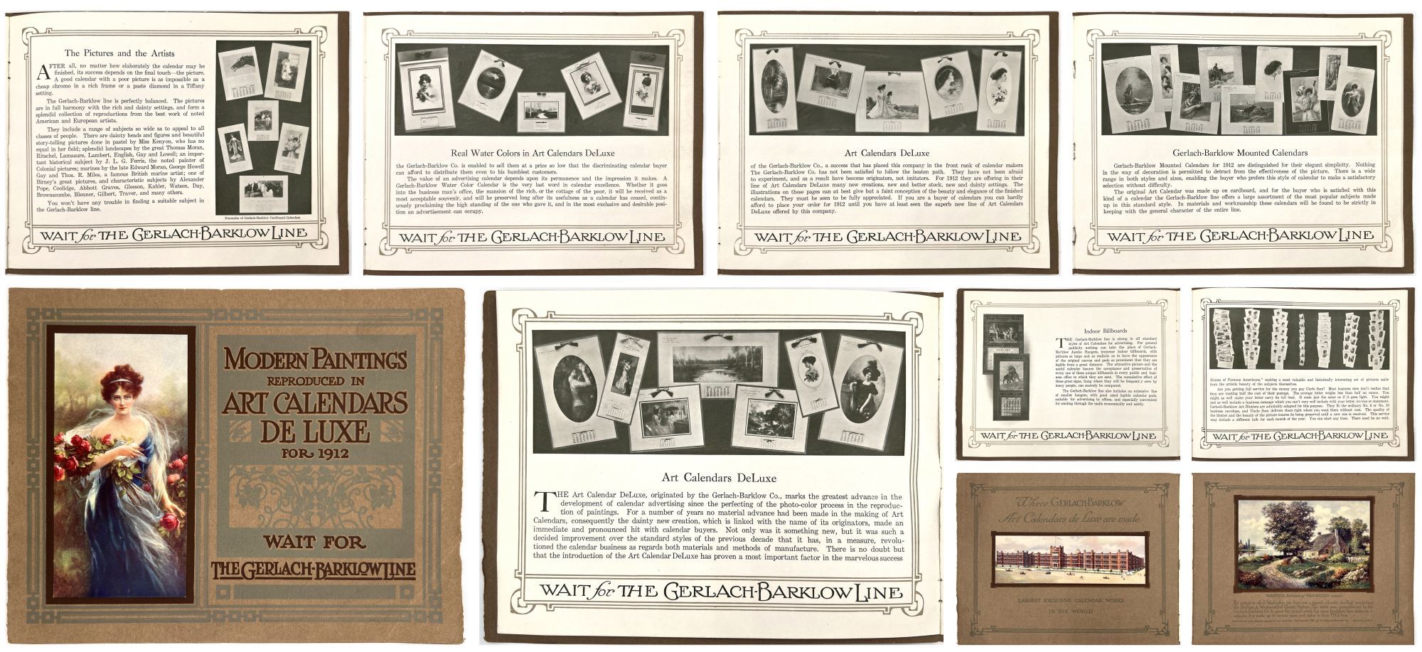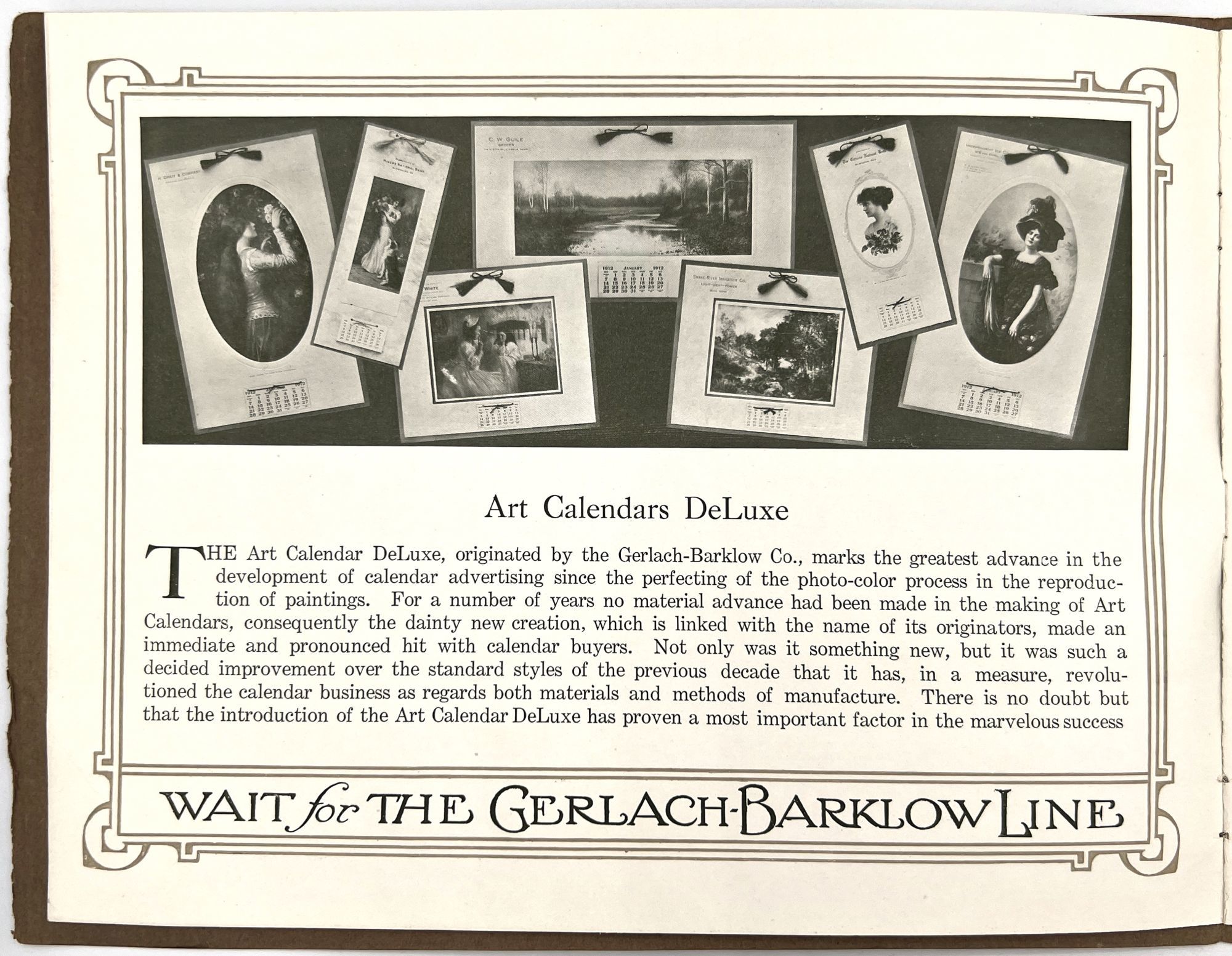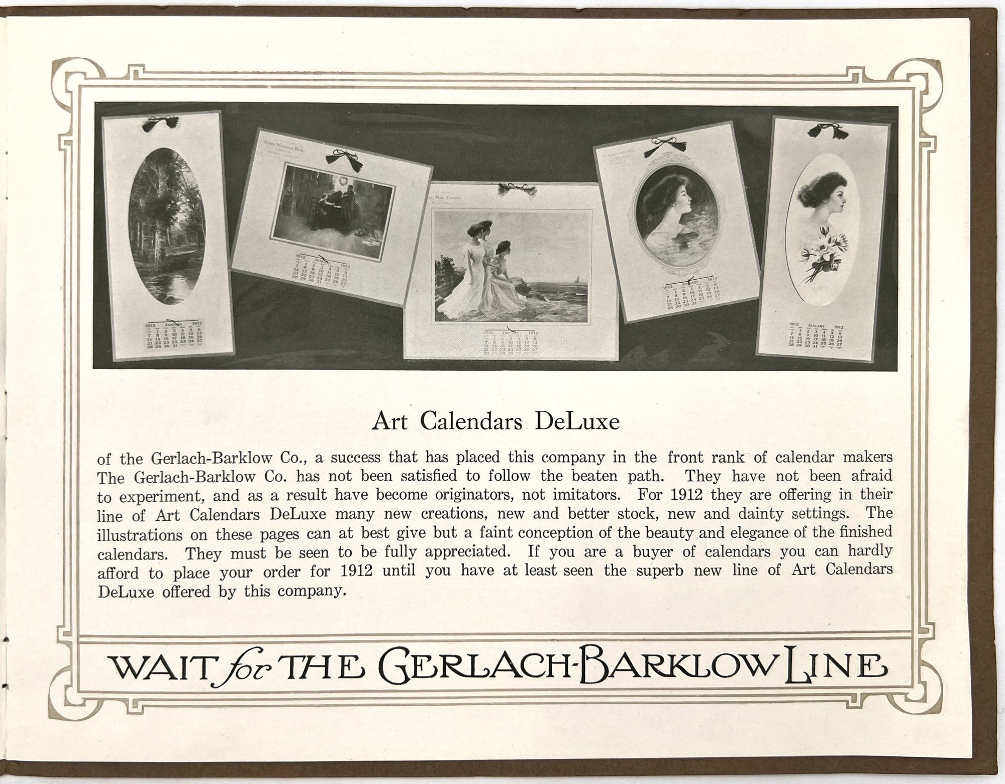 Joliet, Illinois: The Garlach-Barklow Co, 1912. Very good to near-fine.. Illustrated trade catalogue promoting the 1912 line of art calendars published by the Garlach-Barklow Co. of Joliet, Illinois. Distributed chiefly to stationers, it shows dozens of products newly designed for the 1912 season, offering consumers high art at a low price. Single vol. (8" by 10"), pp. [12], illus., stapled in original illus. wrps. with additional color image of a painting of a young woman holding roses mounted to upper cover.