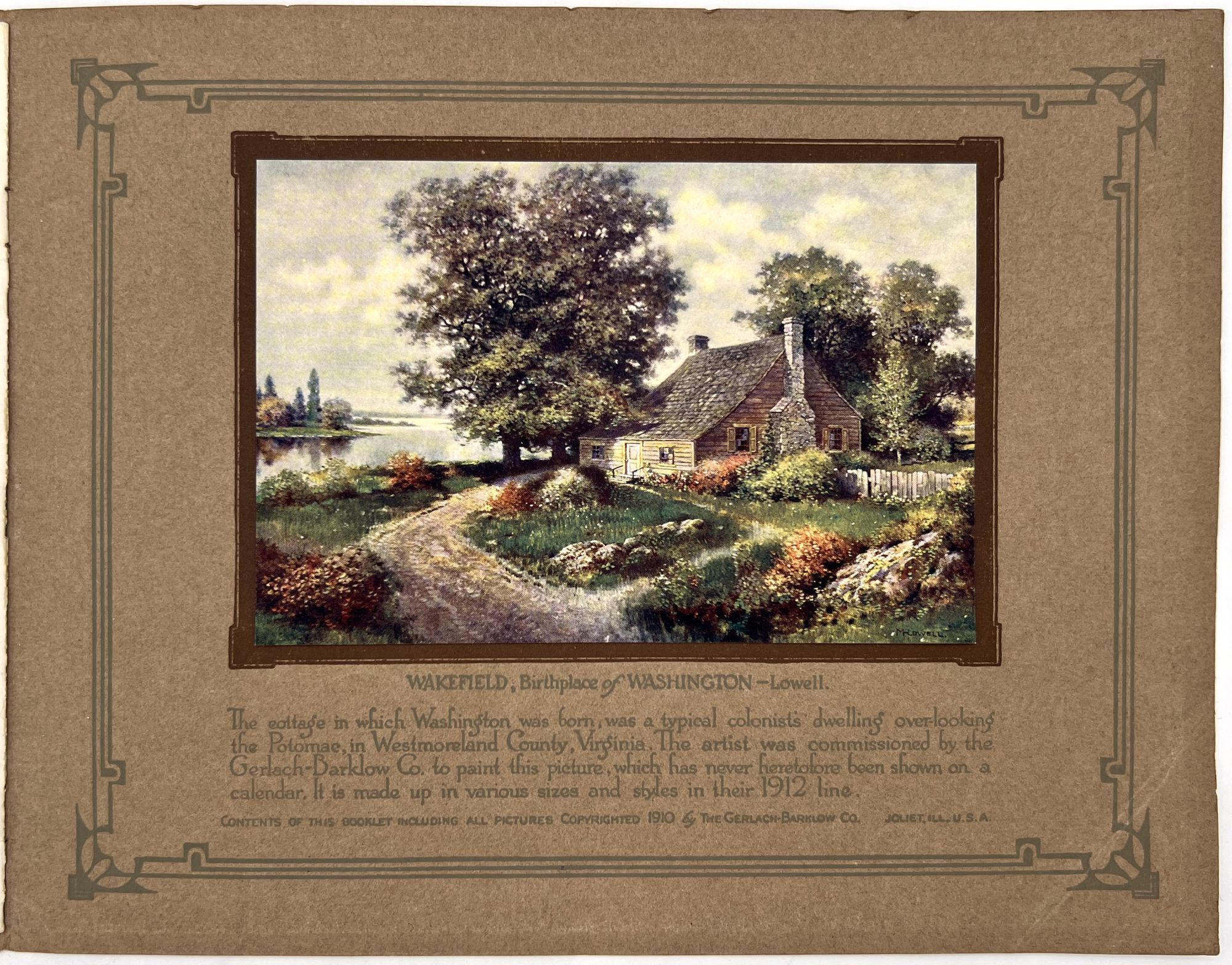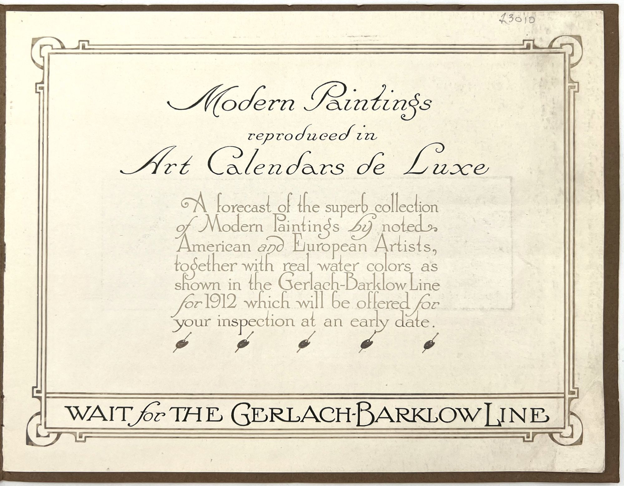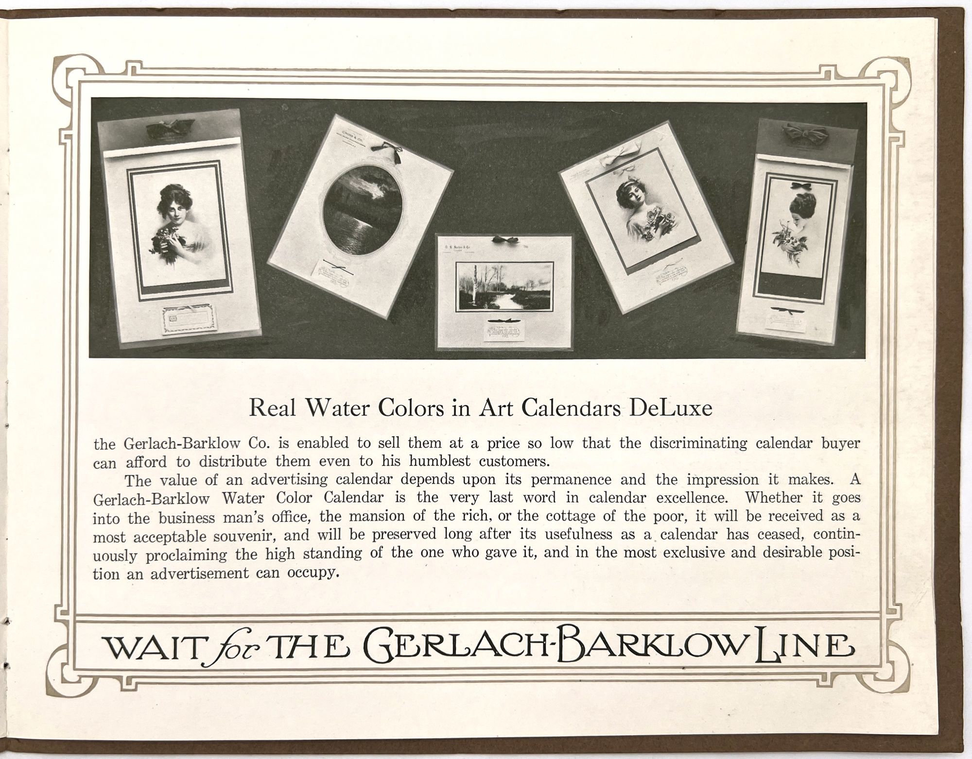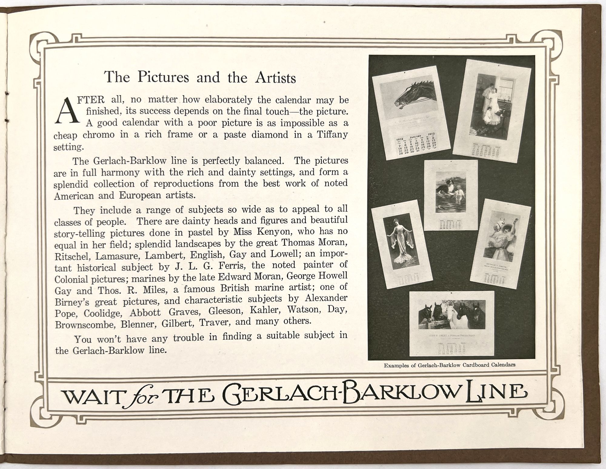 Joliet, Illinois: The Garlach-Barklow Co, 1912. Very good to near-fine.. Illustrated trade catalogue promoting the 1912 line of art calendars published by the Garlach-Barklow Co. of Joliet, Illinois. Distributed chiefly to stationers, it shows dozens of products newly designed for the 1912 season, offering consumers high art at a low price. Single vol. (8" by 10"), pp. [12], illus., stapled in original illus. wrps. with additional color image of a painting of a young woman holding roses mounted to upper cover.