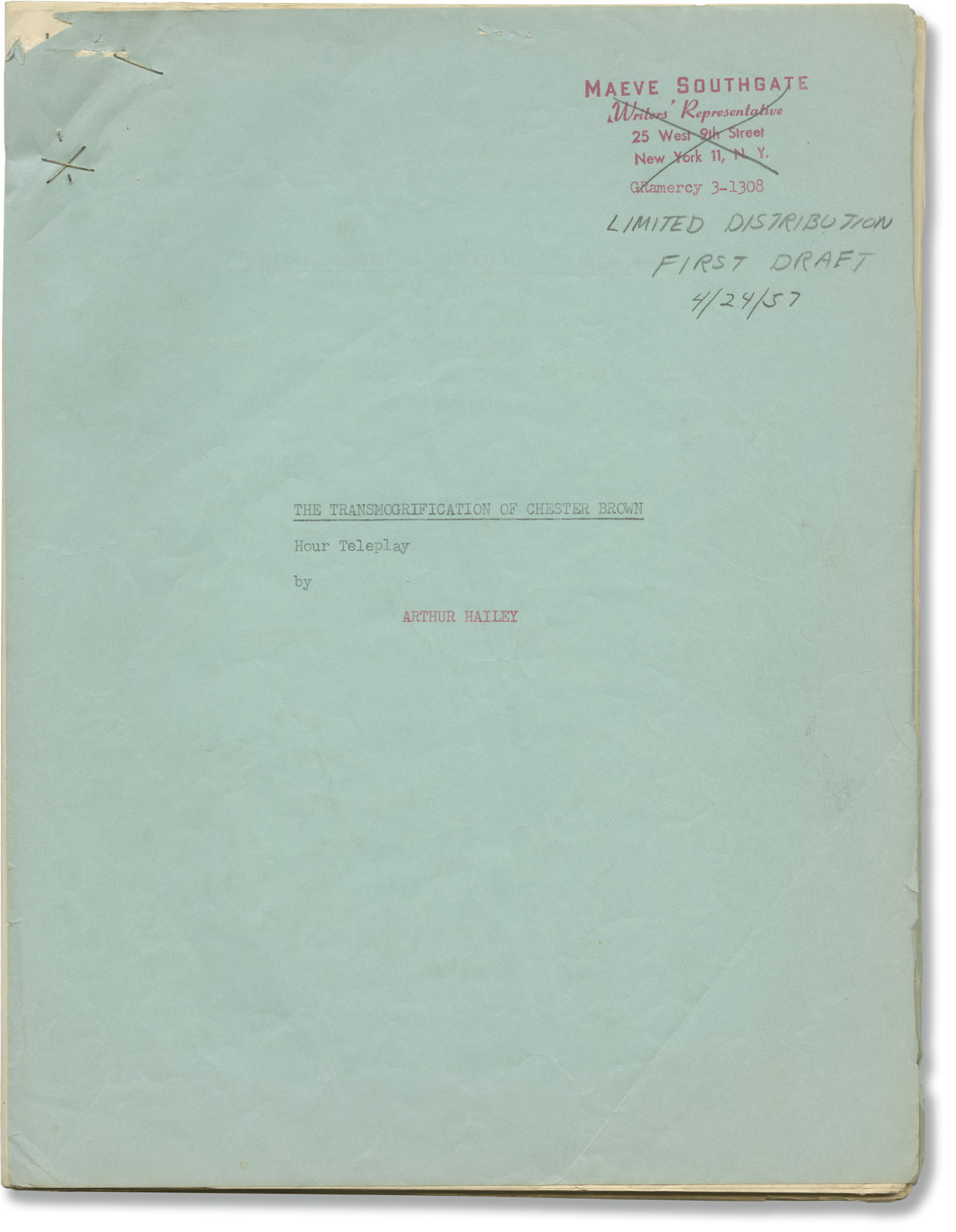 Blue titled self wrappers, noted as LIMITED DISTRIBUTION / FIRST DRAFT in manuscript pencil annotation on the front wrapper, along with an annotation noting the date 4/24/57, with credits for screenwriter Arthur Hailey. Title page present, with credits for screenwriter Arthur Hailey. 82 leaves, with last page of text numbered III-21. Typescript, rectos only. Pages Near Fine, wrapper Very Good plus, partially bound with a single staple to the top left corner.
