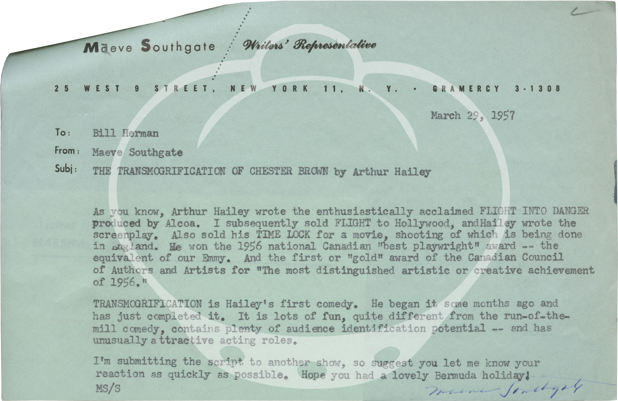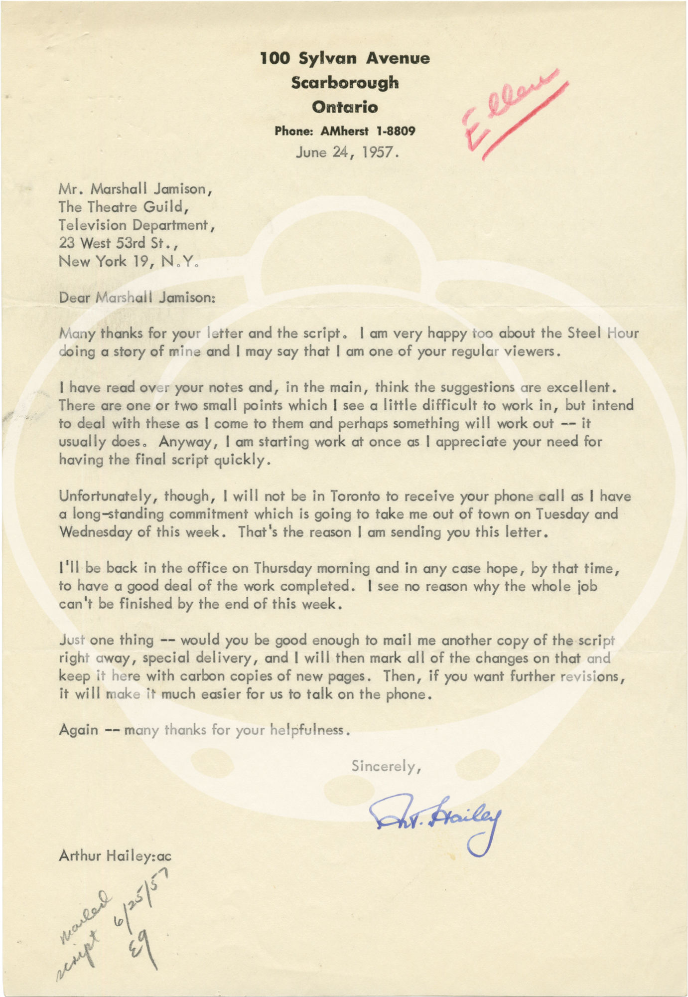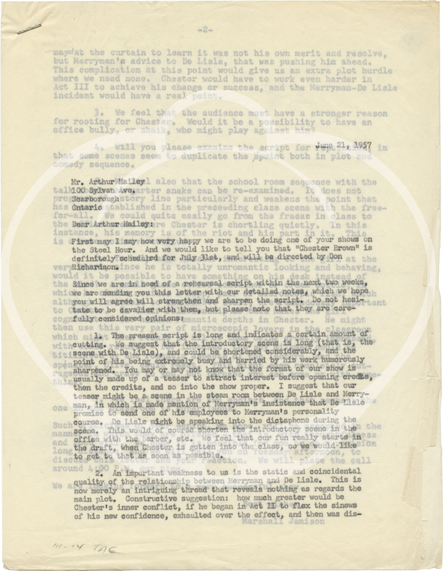 Included with the script are several letters and memos between screenwriter Arthur Hailey, agent Maeve Southgate, and programming executive Marshall Jamison, as well as several typed memos from within Jamison's office, discussing revisions to the script, dated variously between March 29 and July 30, 1957.