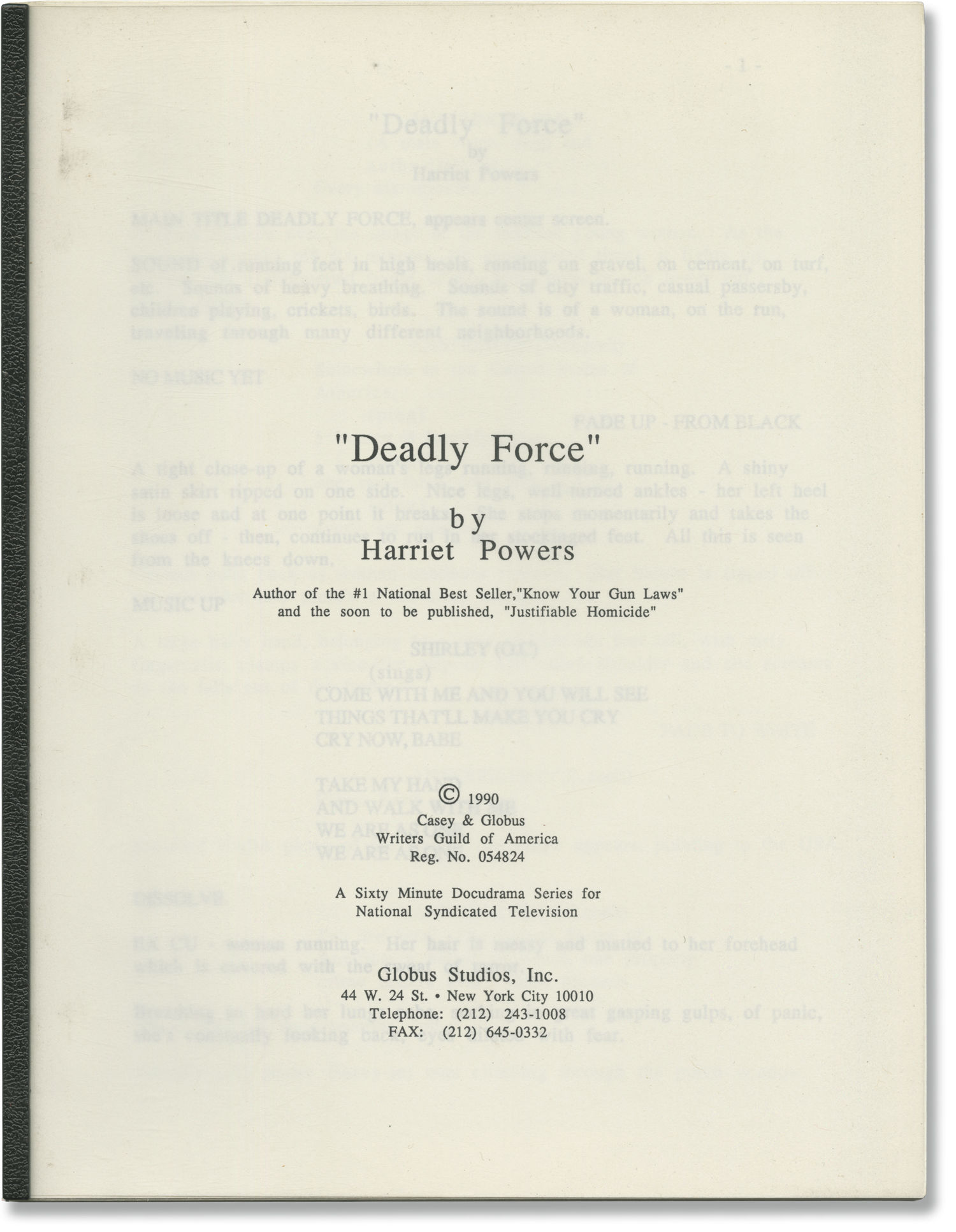 Clear mylar front wrapper, black rear wrapper. Title page present, dated 1990, with credit for screenwriter Harriet Powers. 52 leaves, with last page of text numbered 51. Xerographic duplication, rectos only. Pages Near Fine, wrapper Near Fine, with a black Velo binding.