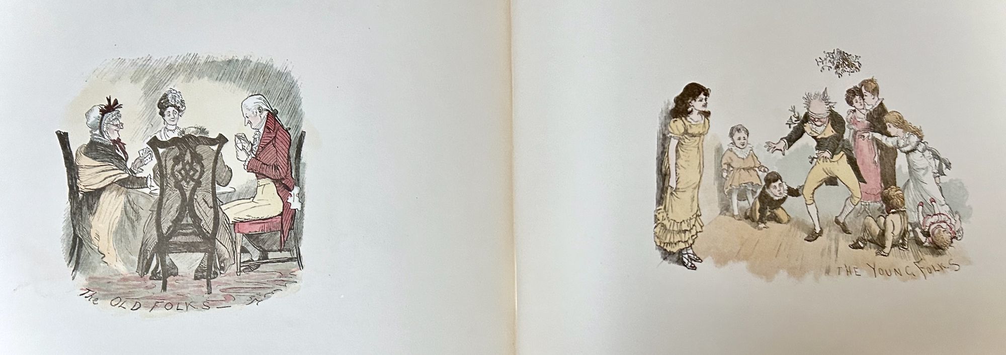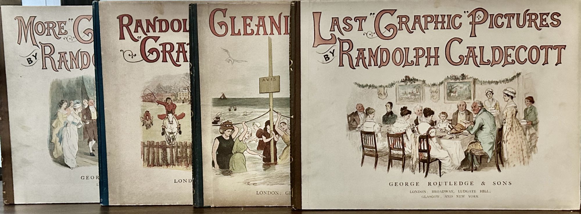 London: George Rutledge and Sons, 1889. Hardcover. Orig. boards in a multitude of colors, both front and back. Spines lettered in gilt. Very good. 4 Vols. Caldecott, Randolph. Unpaginated. 25.5 x 37 cm. The complete set of four volumes. Voluminously illustrated with colored lithographs and black and white illustrations by the premier color printer of the 19th century, Edmund Evans. Caldecott died in St. Augustine, Florida in 1886 at the age of forty while on holiday. All spines lettered in gilt -- three in brown cloth and one in navy. All pictorial front covers with interior contents fresh and clean, very slight rubbing to backstrips head and foot.