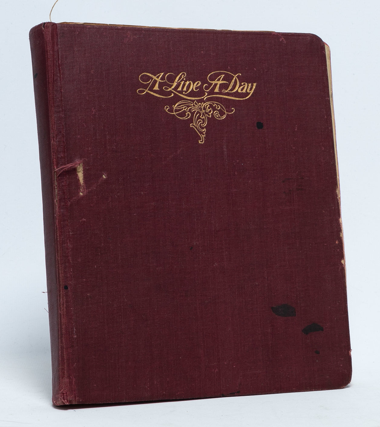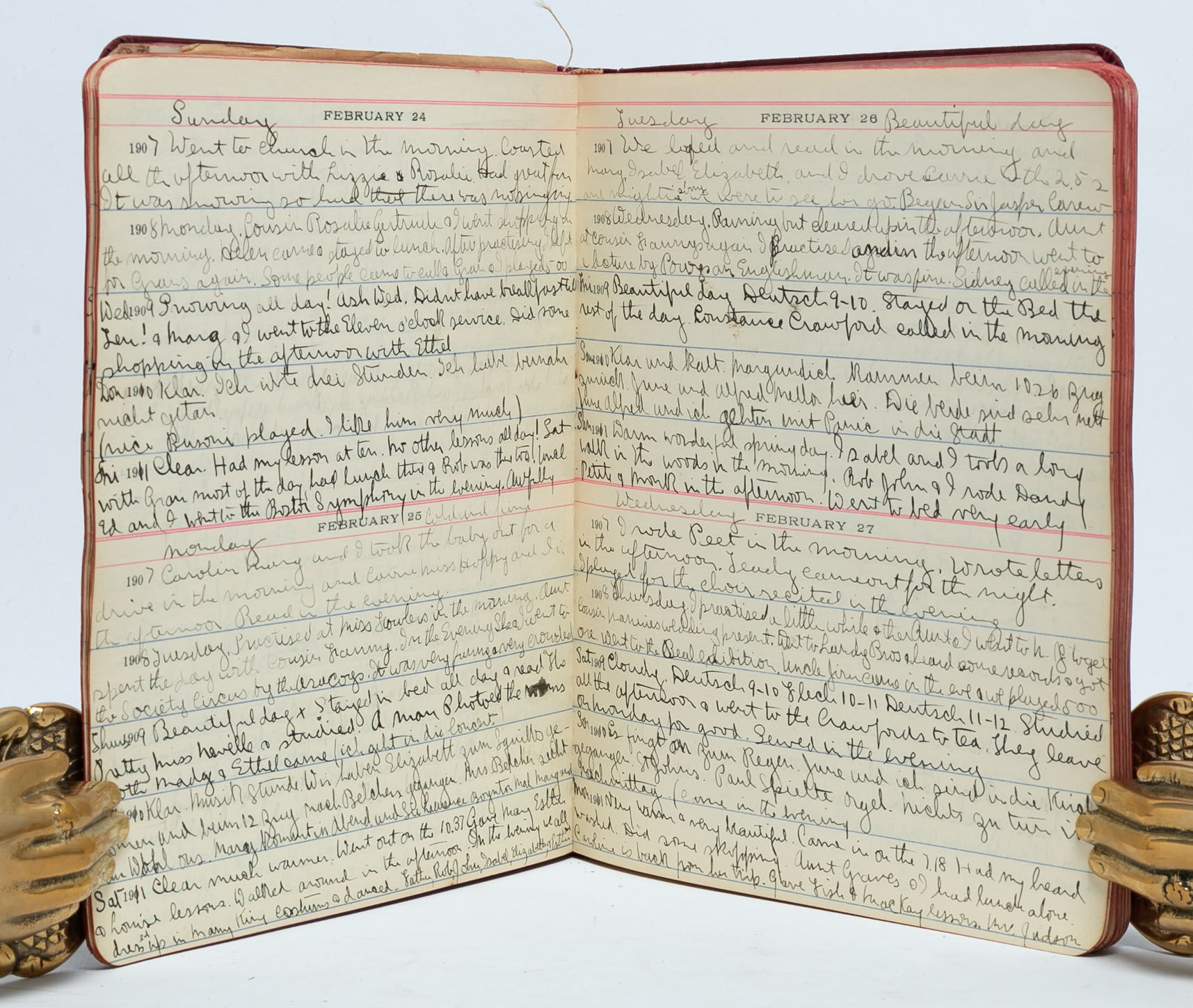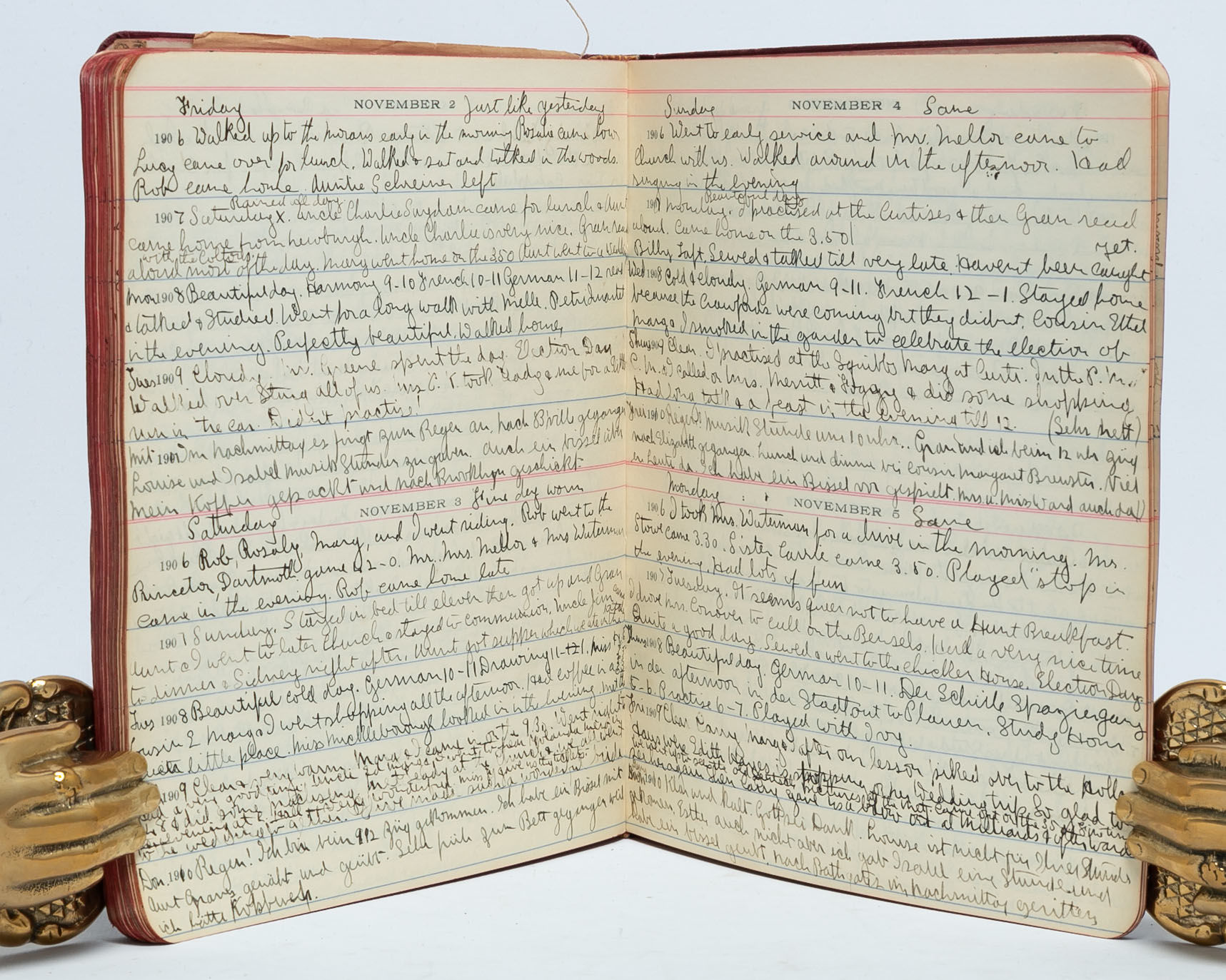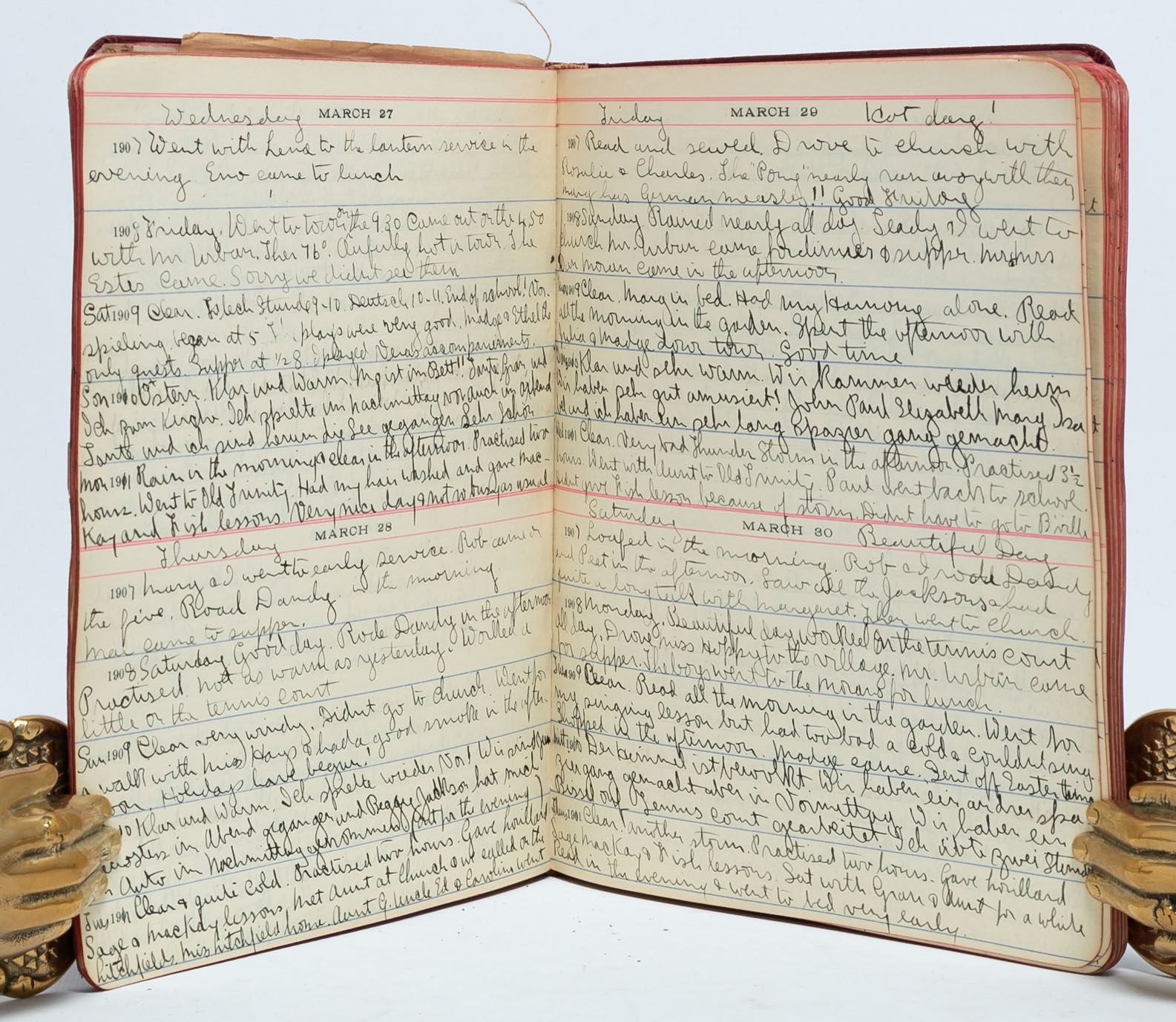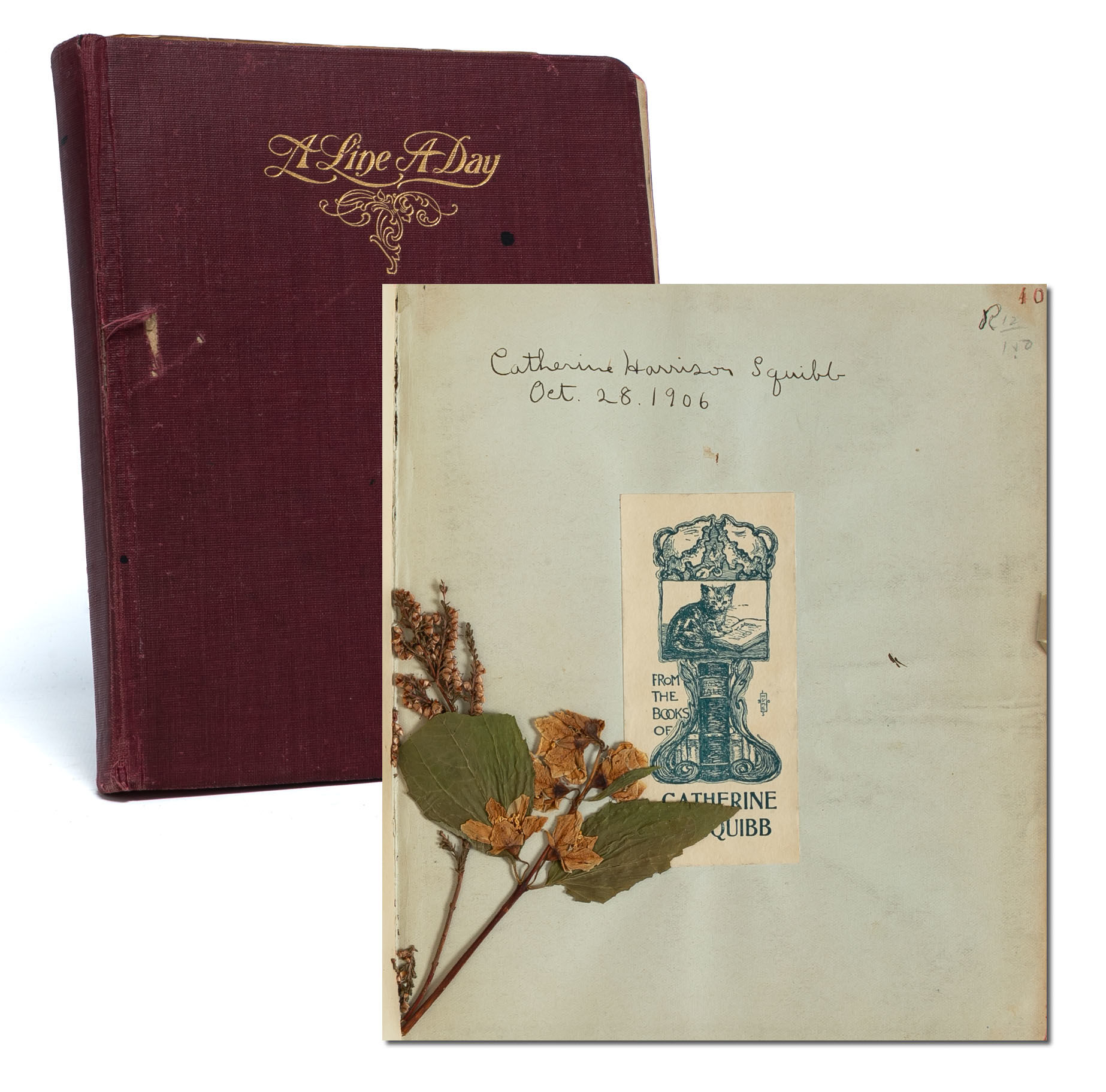 US, Germany, 1911. Red cloth over card with gilt to front board. All edges stained read. Measuring 200 x 170mm and containing 186 handwritten pages across five years. Dried flowers and theatre program loosely inserted at front. Ownership signature and bookplate of Catherine Harrison Squibb to front pastedown and endpaper with signature of the same to rear endpaper. A research rich and densely written diary, the present would be useful in fields including but not limited to intergenerational wealth and its relationship to emotional abuse, women's education and educational travel, early 20th century reading habits, modern friendship, courtship and romance, and women's increased mobility and travel.