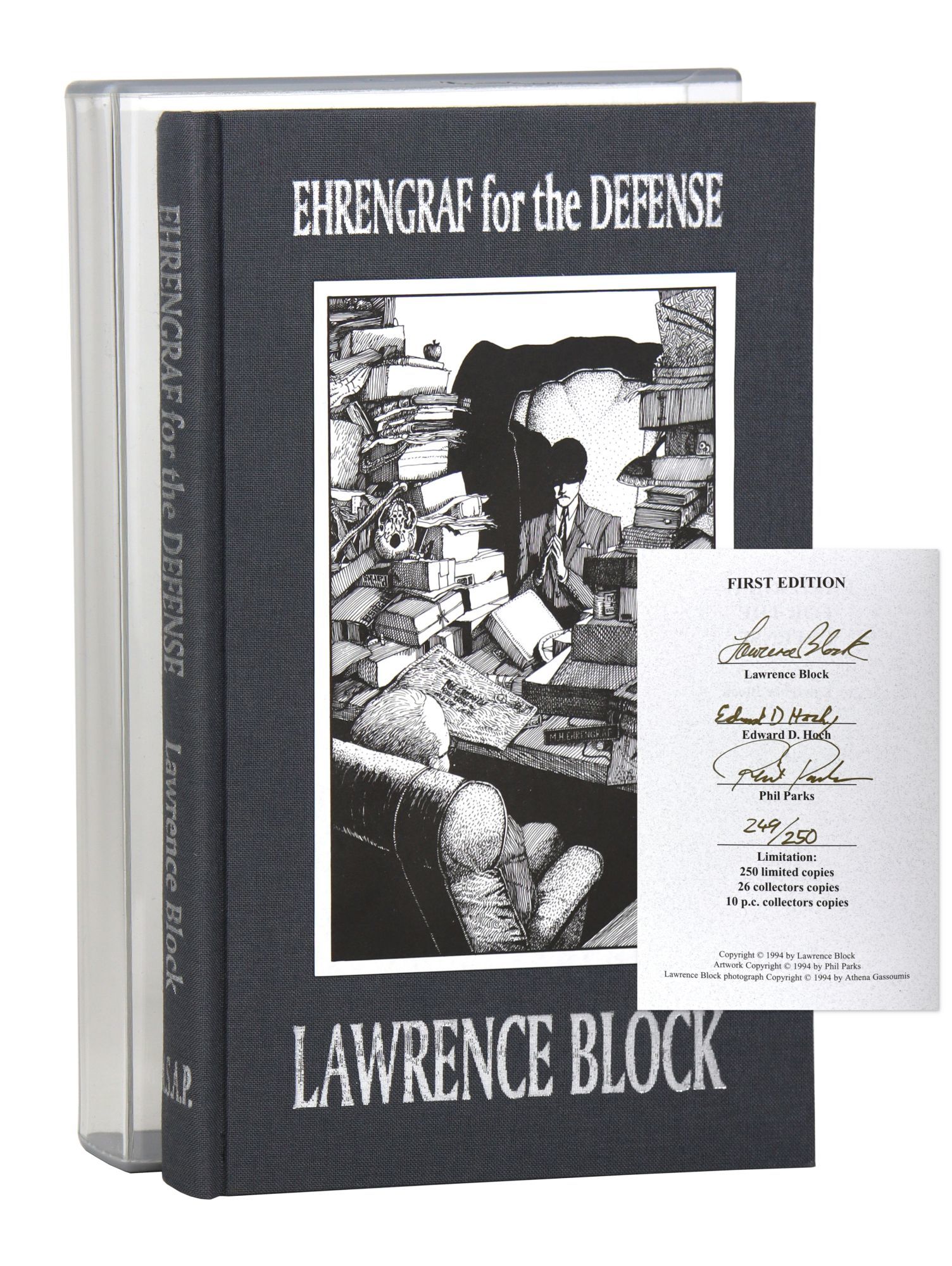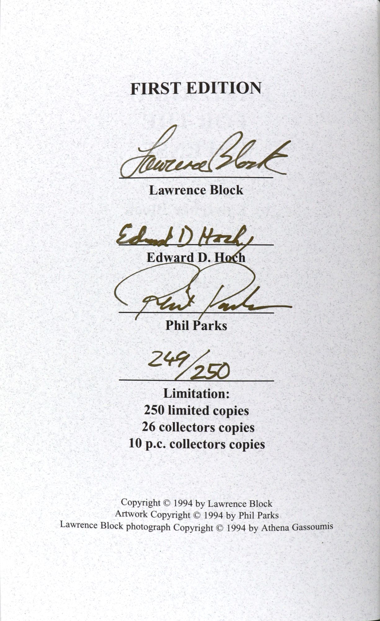Royal Oak, MI: ASAP, 1994. Near Fine. Royal Oak, MI: ASAP, 1994. Limited First Edition, numbered 249 of 250 and signed by Lawrence Block, intro. author Edward D. Hoch, and artist Phil Parks on limitation notice at front. Octavo; 167pp. Mounted photo frontis. Publisher's gray cloth with silver lettering and mounted illustrations to front and back, housed in clear acrylic slipcase. Boards are sturdy, square, and sharp, with slight nudging at head of spine. Binding is sound and pages unmarked. Small crack to slipcase at top edge along seam, but all still sturdy and solid.