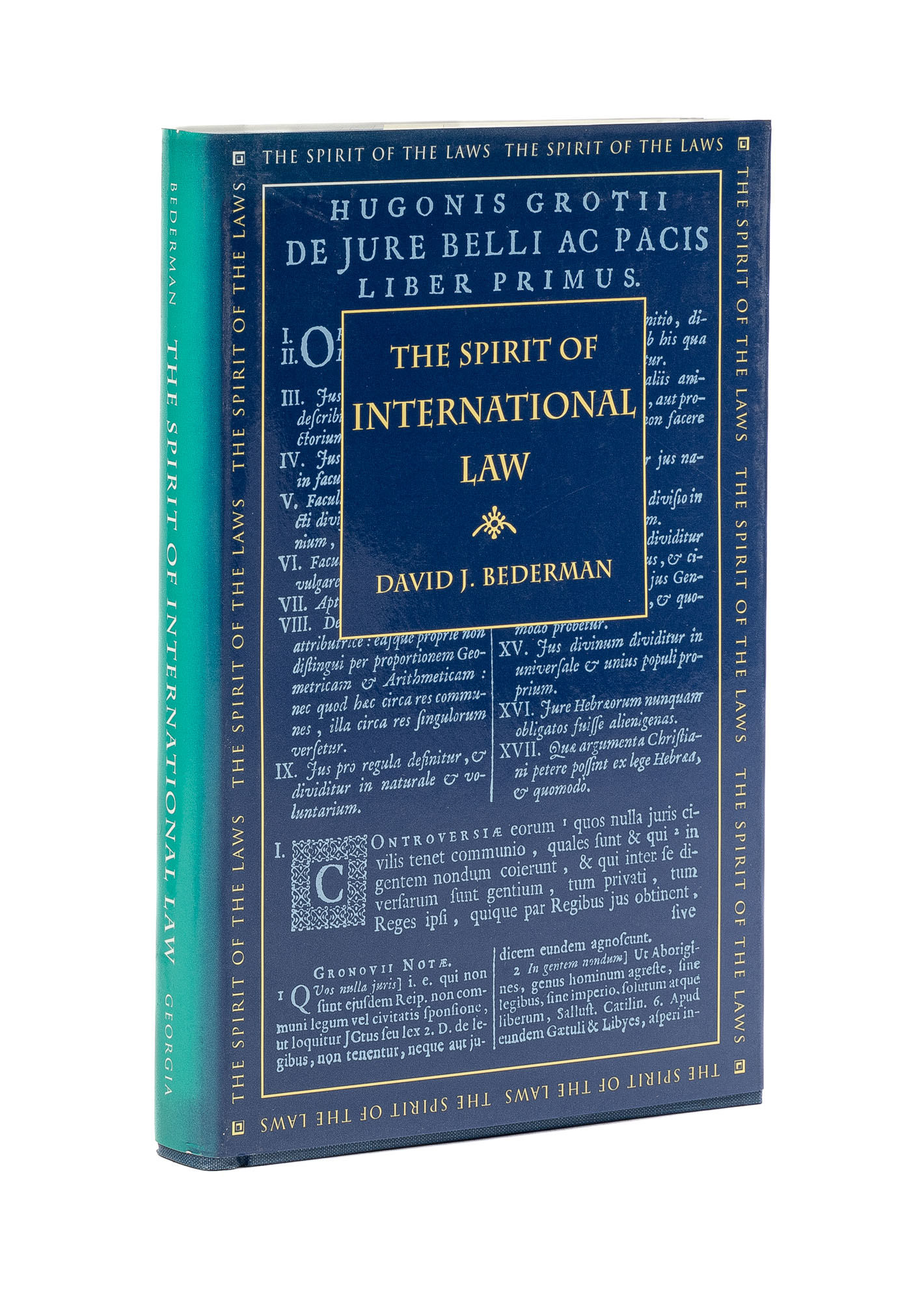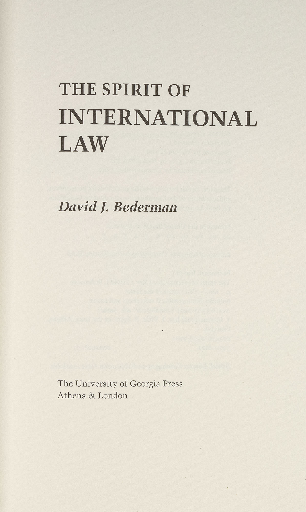 2002. Bederman, David J. The Spirit of International Law. Athens, [Ga.]: University of Georgia Press, [2002]. xvi, 374 pp. Hardcover in near-fine dust jacket. Internally clean and bright. $25. * Contents: Authority and obligation; Sources; Methods and approaches; Subjects and objects; Coherence and sophistication; Values and paradoxes; Confines; Formalism and pragmatism; Enforcement and compliance; Rectitude and ambition; Skepticism and exuberance.