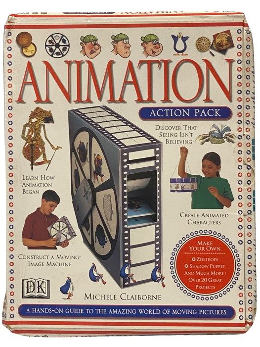 New York: DK Publishing / Dorling Kindersley Limited, 1998. Large Softcover. Good. 10x1x12. Box a bit flattened and lightly soiled. All parts included. 1998 Large Softcover. INCLUDES: Drawing Guide, Moving-Image Machine, Zoetrope, Phenakistoscope, Kinetipic Viewer, Pencil Roller, Flipbook and Gripper, Thaumatrope, Pegboard, and Guidebook. "The incredible world of animation where a penguin can parachute, animated characters and real people perform together, and creatures tucked away in your imagination can come to life. With the DK Animation Pack you can make your own amazing viewing machines. Then, with a little help from the templates and drawing guide, you will be able to watch your own unique animated sequences. Drawing guide contains a cast of characters and creatures showing a range of movements and expressions to help you draw your own animation sequences. Other exciting elements in the pack explain how to create expressions and movement. The shadow puppet can be used as a template; and the zoetrope and moving-image machine demonstrate how images can spring to life. Pack contains 10 main items, including 16pp guidebook, zoetrope, moving-image machine, viewing tube, drawing guide, and flipbook, and 20 projects.