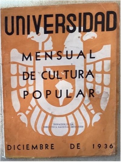 México, D.F.: Universidad Nacional, 1936. b/w plates, wrps. Devoted to art, architecture, literature, cinema published by the University. In 1929, when the University became autonomous, the concept of extension of culture was incorporated into the university mission, and the University created various agencies and dependencies with the purpose of extending university cultural heritage to Mexican society. The then rector Ignacio García Téllez supported the foundation of the Center for Social Action of University Students - whose headquarters was under the directorship ofSalvador Azuela until 1938 -, on which various cultural outreach centers depended. The creation of the Universidad de México magazine dates back to this period. Contains many important articles by and about emerging artists and writers. Published T. 1, no. 1 (feb. 1936)-t. 5, núm. 29 (jun. 1938). Supersedes Universidad de México, issued 1930-33; superseded by Universidad de México, issued 1946-59. SPECIAL ART SECTION: Imagenes: Luis Ortiz Monasterio: Esculturas -- José Guadalupe Posada: Grabados.