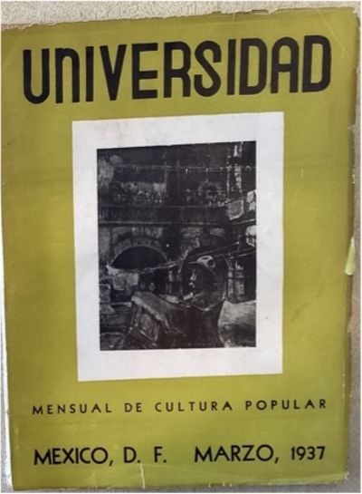 México, D.F.: Universidad Nacional, 1937. b/w plates, wrps. Devoted to art, architecture, literature, cinema published by the University. In 1929, when the University became autonomous, the concept of extension of culture was incorporated into the university mission, and the University created various agencies and dependencies with the purpose of extending university cultural heritage to Mexican society. The then rector Ignacio García Téllez supported the foundation of the Center for Social Action of University Students - whose headquarters was under the directorship ofSalvador Azuela until 1938 -, on which various cultural outreach centers depended. The creation of the Universidad de México magazine dates back to this period. Contains many important articles by and about emerging artists and writers. Published T. 1, no. 1 (feb. 1936)-t. 5, núm. 29 (jun. 1938). Supersedes Universidad de México, issued 1930-33; superseded by Universidad de México, issued 1946-59. SPECIAL ART SECTION:Imagenes: Francisco Goitia: Oleos -- Julio Castellanos: Oleos Frescos.