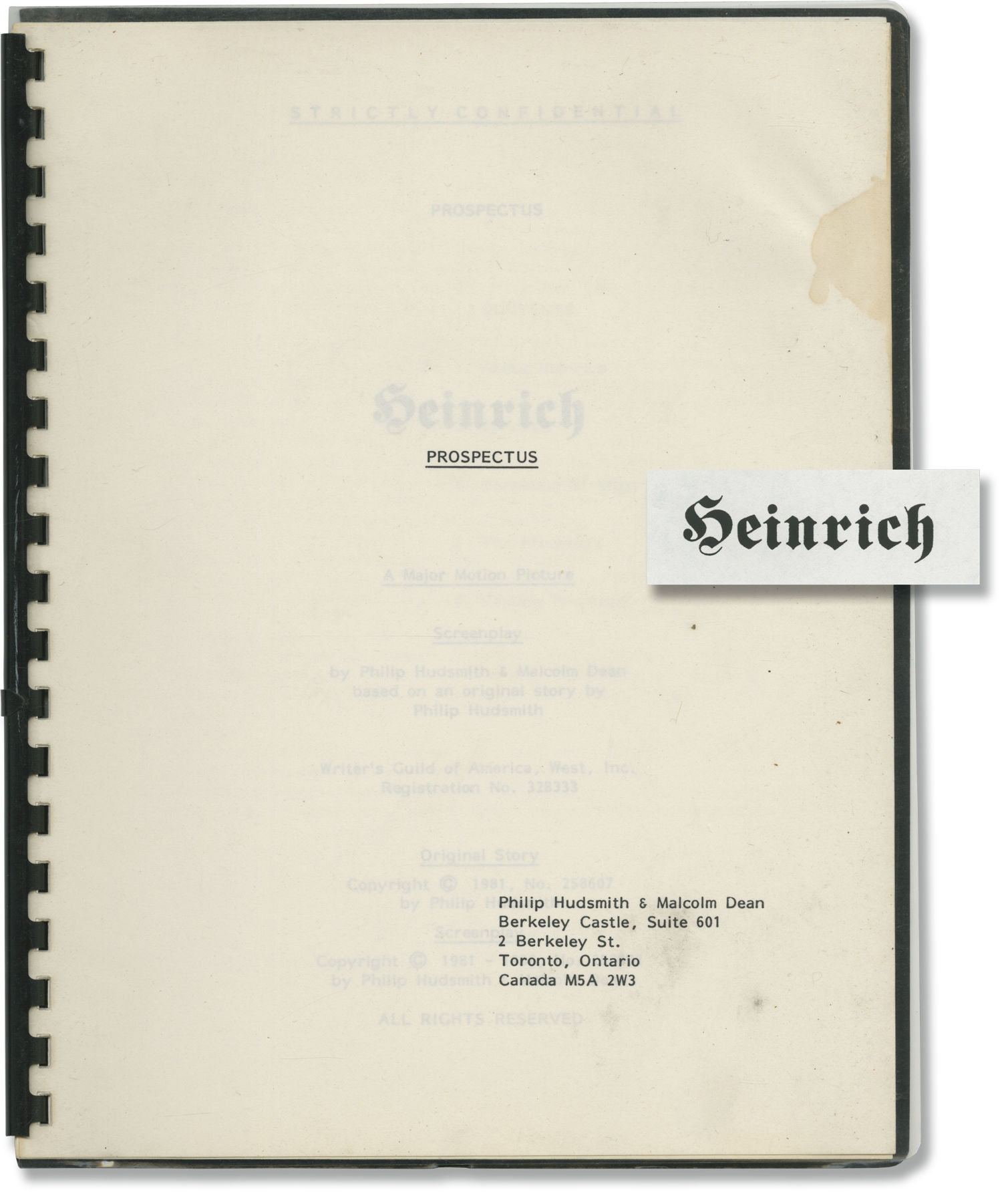Clear mylar front wrapper, black rear wrapper. Title page present, noted as PROSPECTUS, with credits for screenwriters Philip Hudsmith and Malcolm Dean. 12 leaves, with last page of text numbered 8. Xerographic duplication, rectos only. Pages Very Good plus, wrapper Very Good, with a black comb binding.