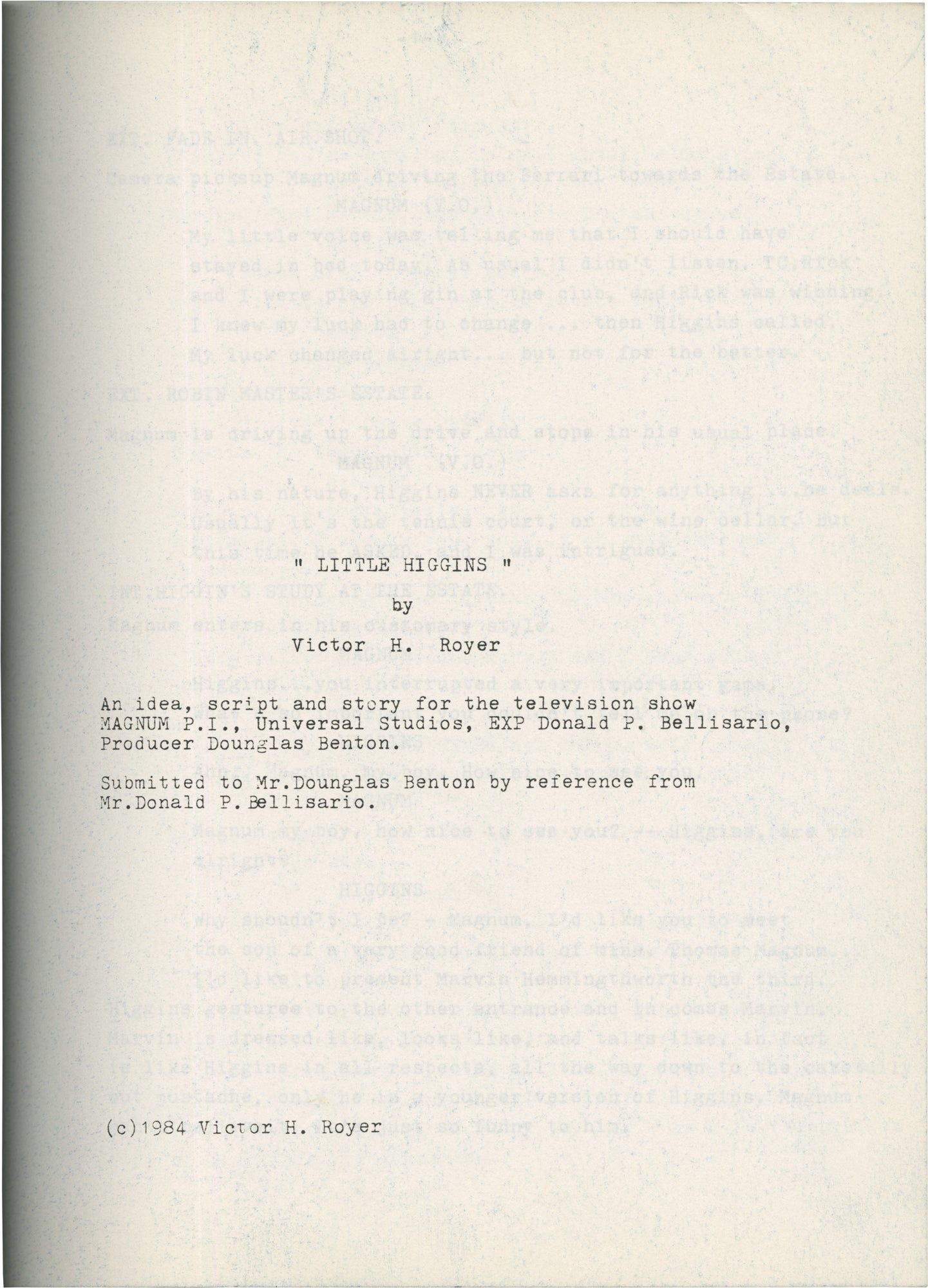 Magnum P.I.: Little Higgins (Original screenplay for an unproduced television episode)