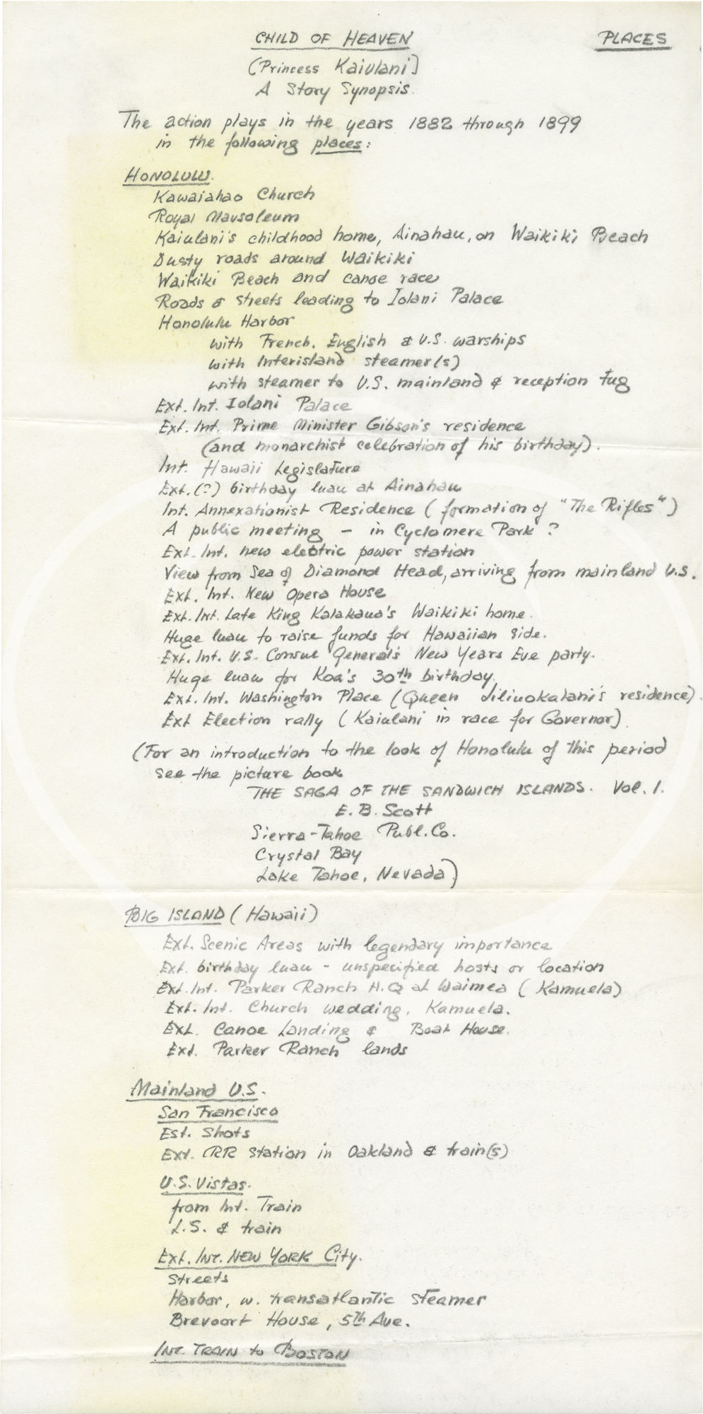 N.p.: N.p., 1980. Treatment script for an unproduced film. Laid in with the script is a manuscript letter addressed to casting agent Paul Kohner, and a two-page manuscript list of prospective filming locations.