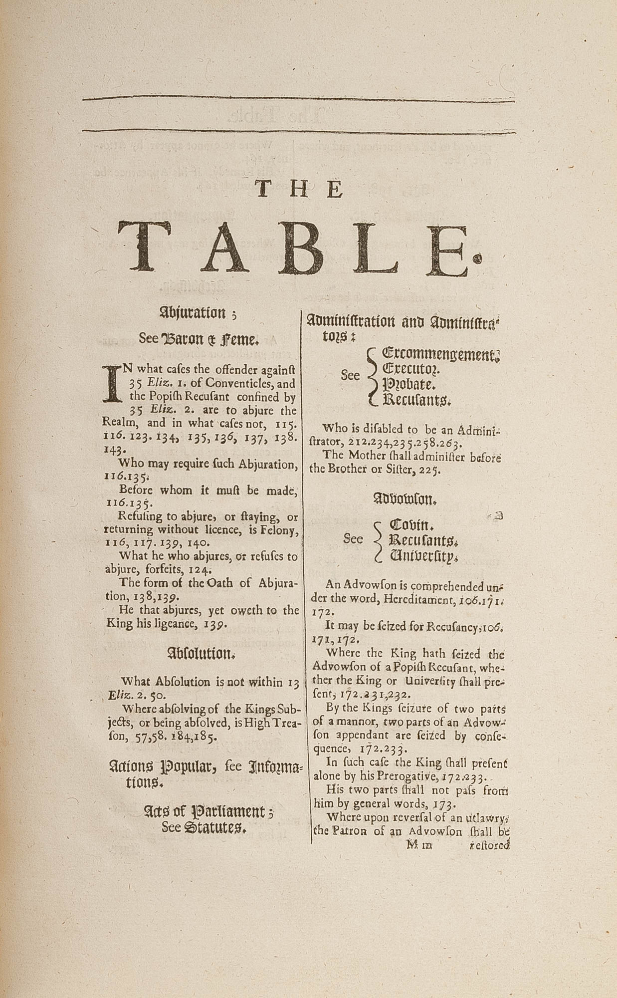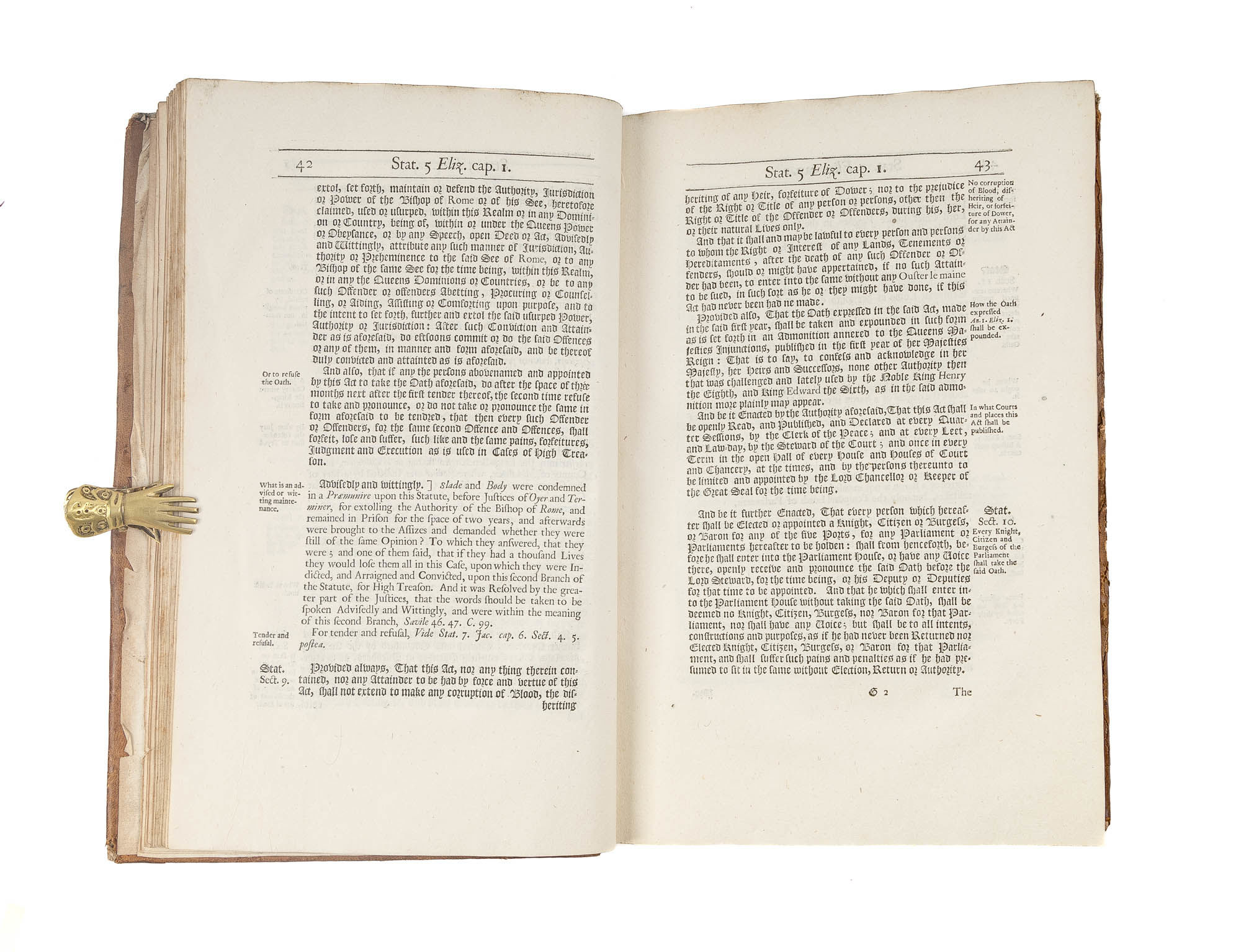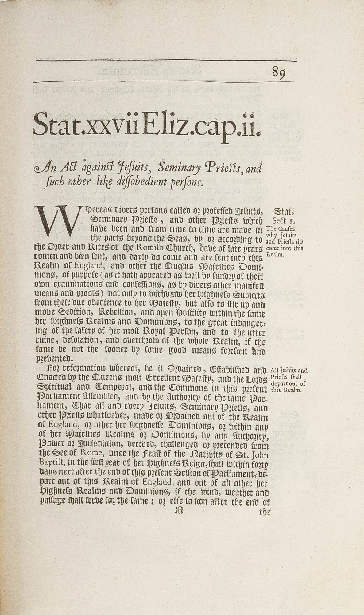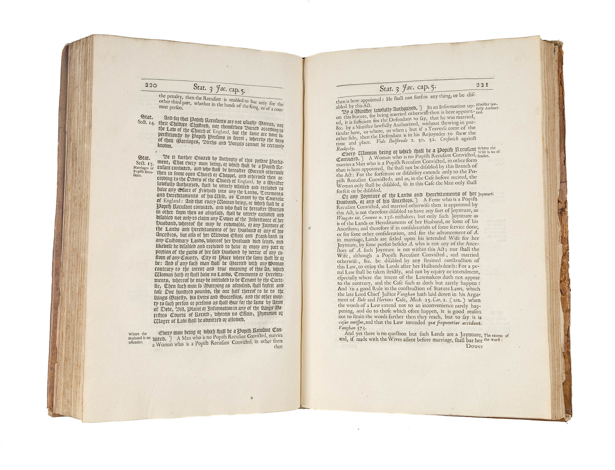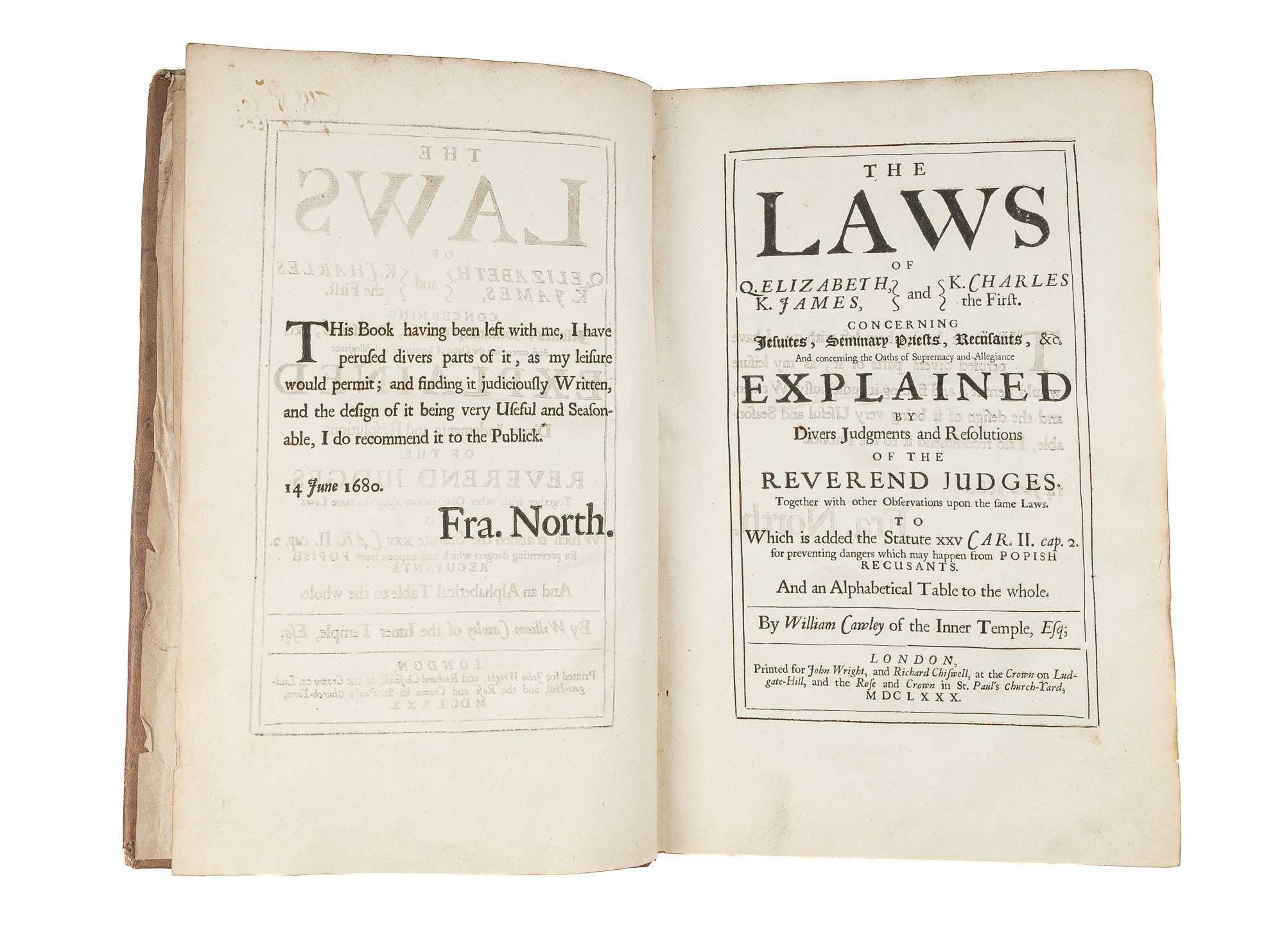 1680. London: John Wright, and Richard Chiswell, 1680. London: John Wright, and Richard Chiswell, 1680. Collection of Laws Concerning Jesuits Published Eight Years Before the Glorious Revolution Cawley, William. The Laws of Q. Elizabeth, K. James, and K. Charles the First, Concerning Jesuites, Seminary Priests, Recusants, &c. and Concerning the Oaths of Supremacy and Allegiance Explained by Divers Judgments and Resolutions of the Reverend Judges. Together with Other Observations Upon the Same Laws, To Which is Added the Statute XXV CAR.II. cap. 2. for Preventing Dangers Which May Happen from Popish Recusants. And an Alphabetical Table to the Whole. London: Printed for John Wright, And Richard Chiswell, 1680. [x], 267, [36] pp. Folio (12-1/2" x 7-3/4"; 31.75 x 19.70 cm). Contemporary calf, blind rules to boards, raised bands, early hand-lettered title label, two small later paper shelf labels and shelf number in early hand to spine. Shallow scuffs, nicks and faint stains to boards, a deeper scuff to rear board, moderate rubbing to extremities with wear to spine ends and corners, hinges starting, light edgewear to front endleaves. Light toning to interior, slightly heavier in places, light soiling and foxing to a few leaves, early owner initials, J.W., dated August 20, 1680, to front endleaf. $1,200. * Only edition. This volume was published eight years before the Glorious Revolution, a period that witnessed an increase in anti-Catholic sentiment. "The Judgments and resolutions of the reverend Judges upon the several branches of these Statutes, and of others likewise here occasionally mentioned, (as far as they relate to the subject in hand) which lye scattered in the printed Books, are here collected and placed under proper heads; And this is the only thing, the Statutes themselves excepted, for which I durst recommend the Book to thy perusal. Besides which, there are several other Authorities cited in the Cases, which arise upon the poenal Laws: And here and there, where the path is untrodden, I have adventured to add some observations of my own" (Preface). Topics include Catholic foreigners, women married to Catholic recusants, pro-Catholic books, land law regarding recusants and capital punishment for Jesuit missionaries. The text of the statutes is in black letter, the commentary in Roman type. English Short-Title Catalogue R5101.