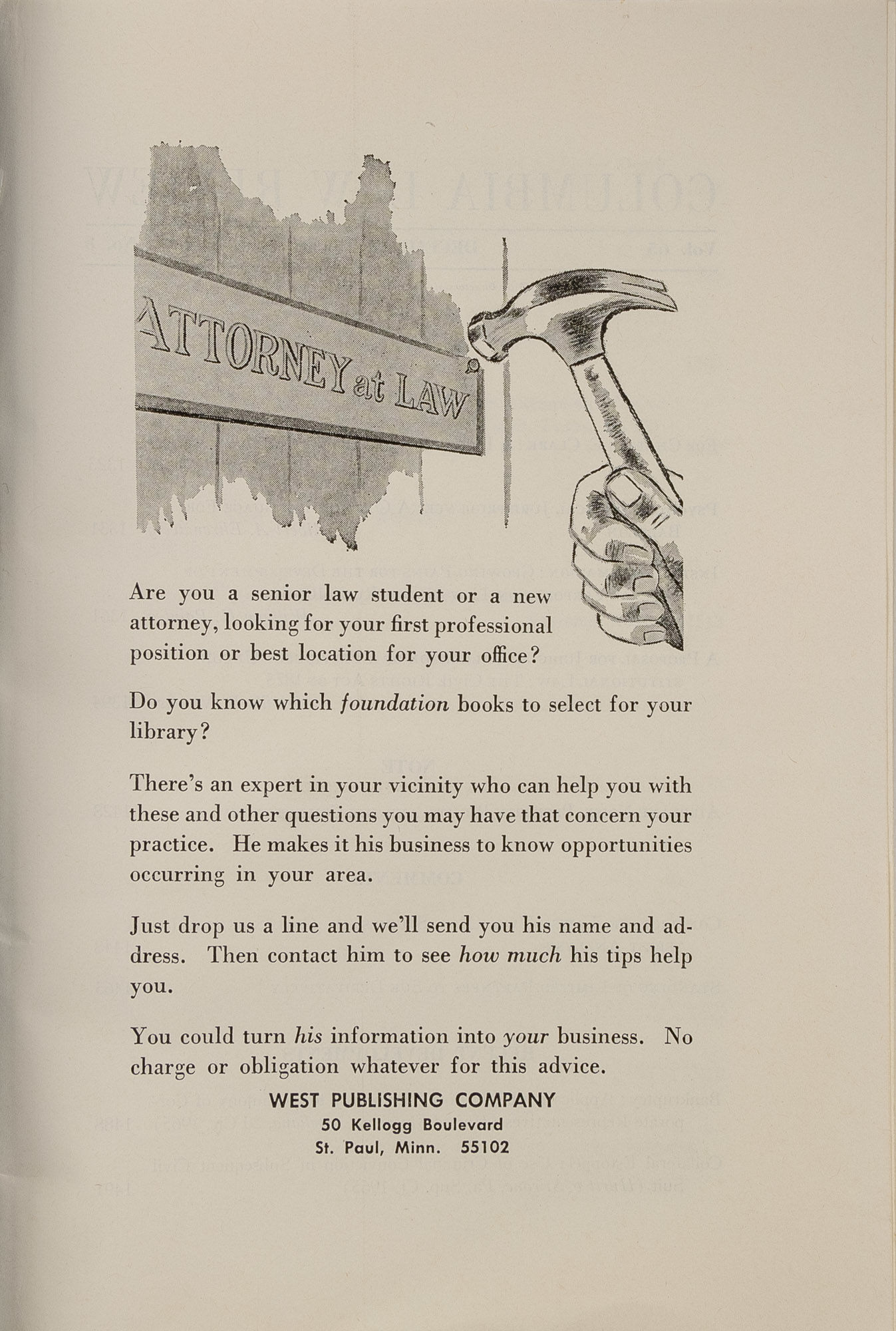 1972. Two (2) linear feet shelf space.. Two (2) linear feet shelf space. Columbia Law Review. New York: Columbia Law Review Association. 24 original paper issues. (1963-1972); vol. 63 no. 1-2, 4-8; vol. 65 no. 1-3, 5-8; vol. 69 no. 2-8; vol. 72 no. 1-3. Together 24 paper issues. Ex-library, worn. Two (2) linear feet shelf space. $250. * Founded in 1901 by Joseph E. Corrigan, the first Editor-in-Chief, and John M. Woolsey, the Secretary, the Columbia Law Review is a leader in legal scholarship in the United States and around the world. The Review is an independent nonprofit corporation edited and published entirely by students at Columbia Law School. It is one of a handful of student-edited law journals in the nation that publish eight issues a year. The Review is the third most widely distributed and cited law review in the country.