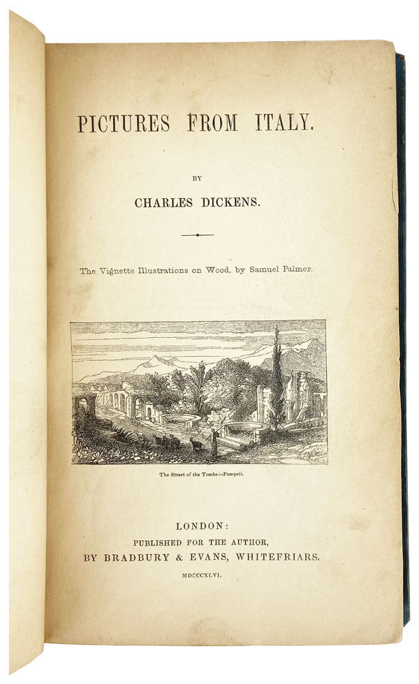 London: Bradbury & Evans, Whitefriars, 1846. Very Good. London: Bradbury & Evans, Whitefriars, 1846. First Edition, matching all first edition issue points listed in Smith, Eckel, and Podeschi. Octavo. 269 [3]. Includes 2 pp. advertisements and half title preliminaries; four black and white illustrations by Palmer; advertisements to rear with twelfth, tenth, and twentieth editions of Dickens' Christmas books; seven titles plus Portrait listed on final advertisements page. Bound in blue fine-diaper cloth; front and rear stamped in blind; gilt lettering to spine; yellow-white endpapers.