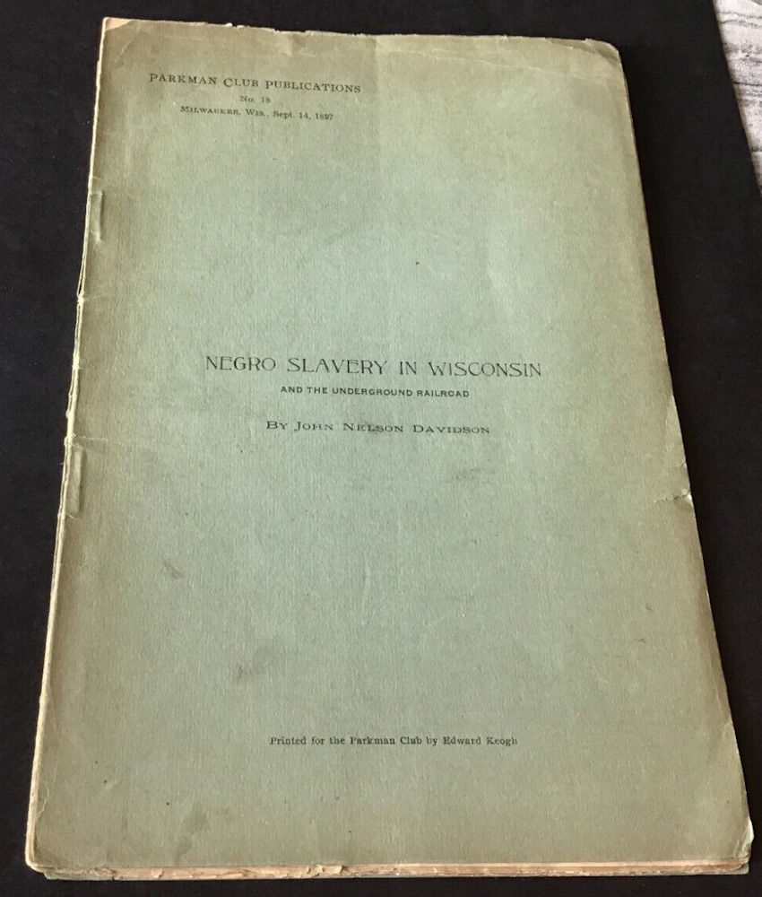 Milwaukee, WI: Parkman Club Publications, 14 September 1897. First Edition. Softcover. Mostly unopened. Rear wrap neatly detached. Very Good and quite uncommon. Stapled printed green wraps (6-5/8" x 9-1/2"); 211-244 pages plus blank and covers. The Ordinance of 1787 forbade the practice of slavery or involuntary servitude in any form in the Northwest Territory, making it a crime to own and possess humans as slaves. Despite federal law making it a crime to own and possess humans as slaves, slavery existed in Wisconsin. This paper describes a number of case histories, mostly of those bringing slaves to Wisconsin from other states, and the various reactions of Wisconsin residents.