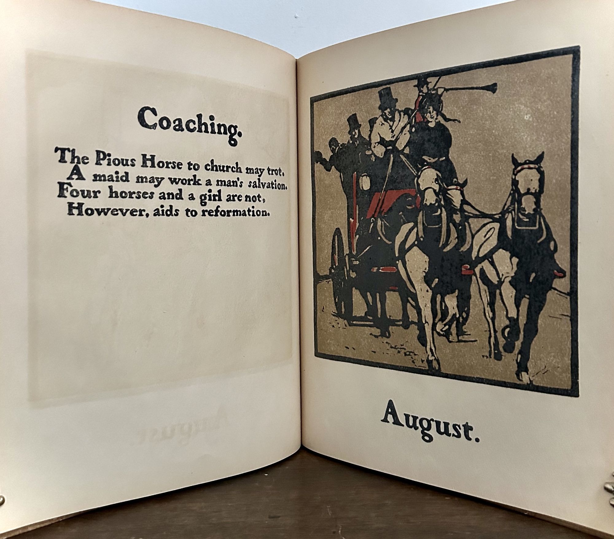 New York: R.H. Russell, 1898. First American edition. Hardcover. Orig. drab boards illustrated and lettered. Very good. 15 pages. 30.5 x 25. Twelve color lithograph plates after woodcuts by Nicholson. Interior and plates clean and sharp. Nick with loss at middle spine front cover, rubbing to extremities with calendar for 1898 noting dates for each day of the week.