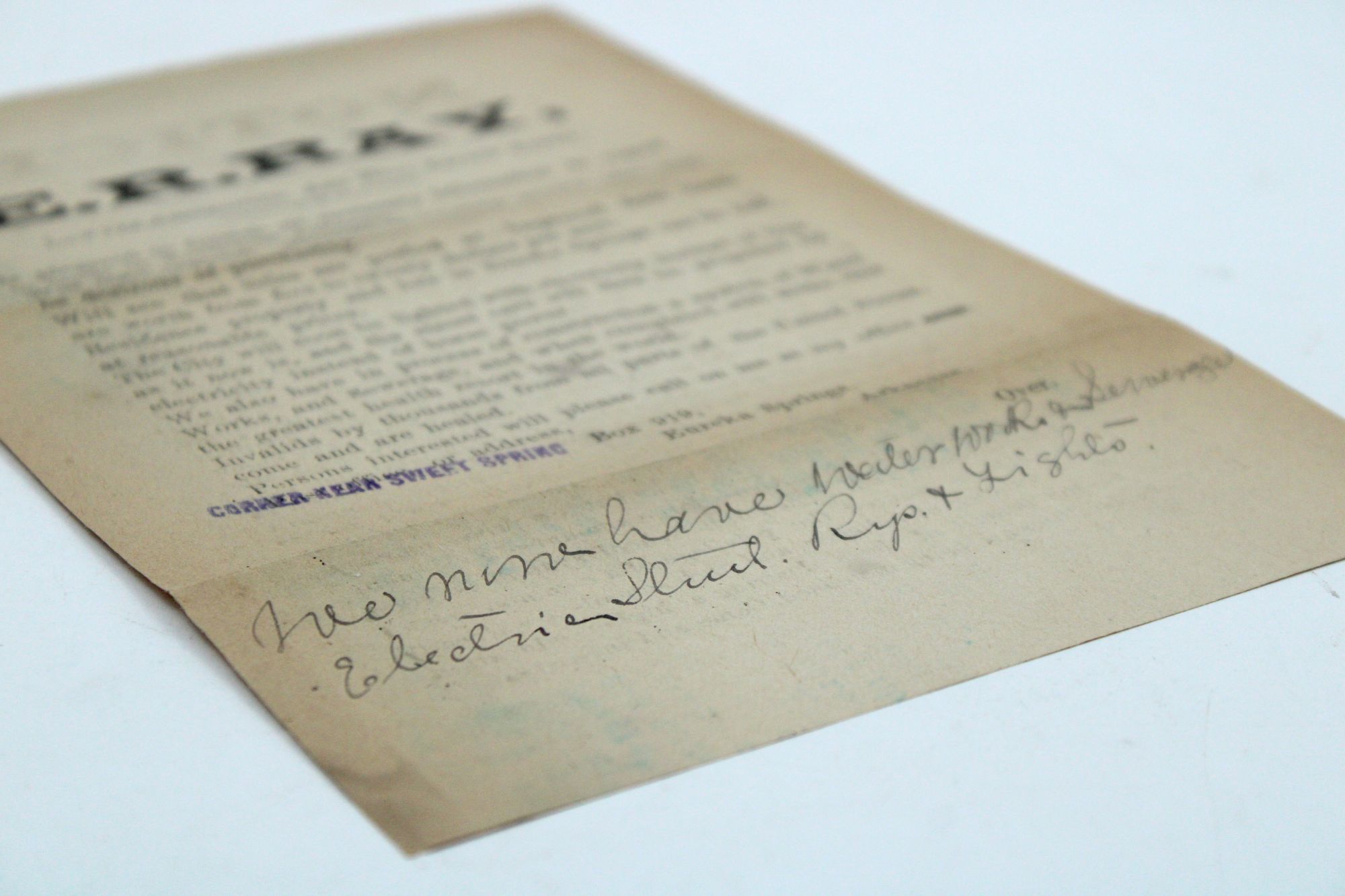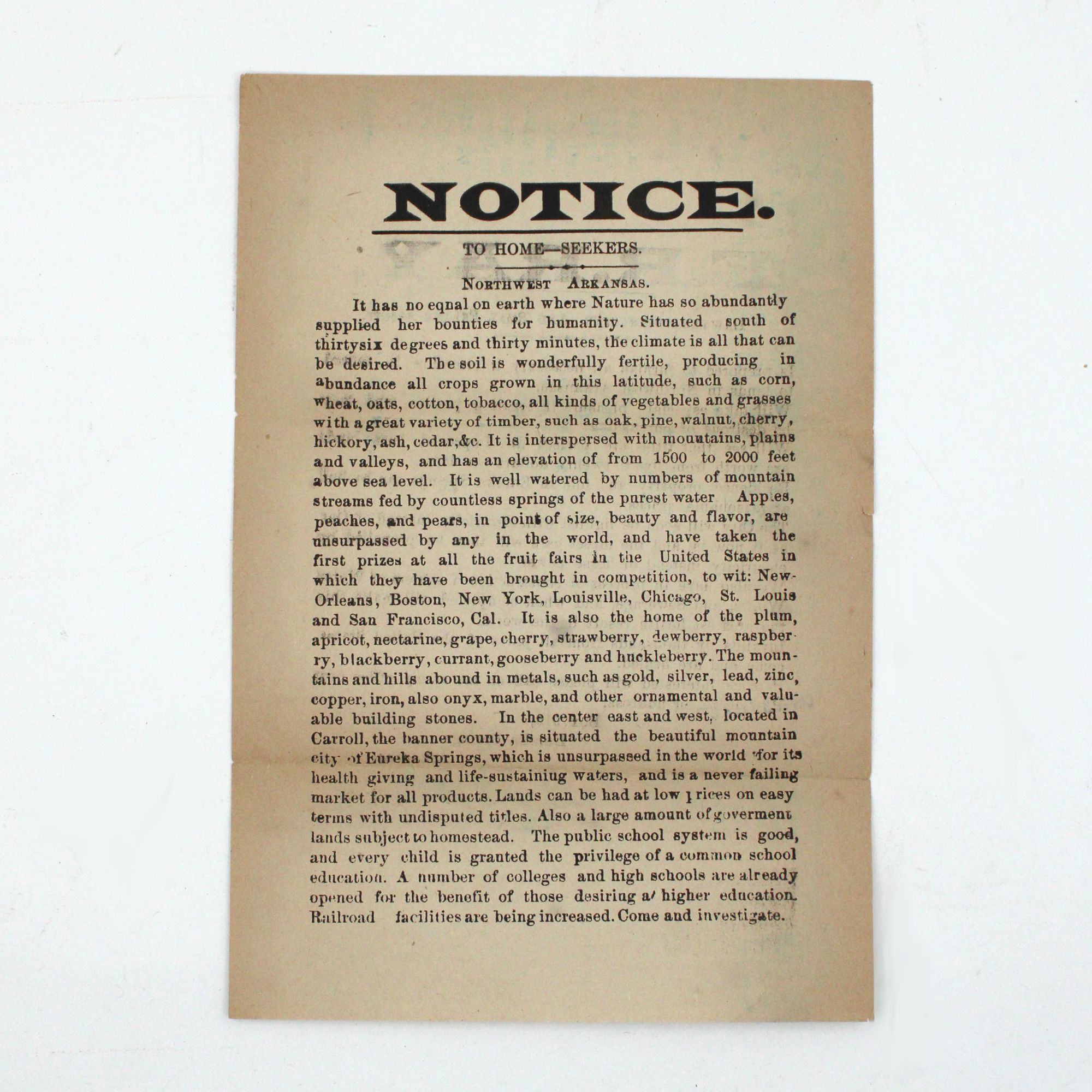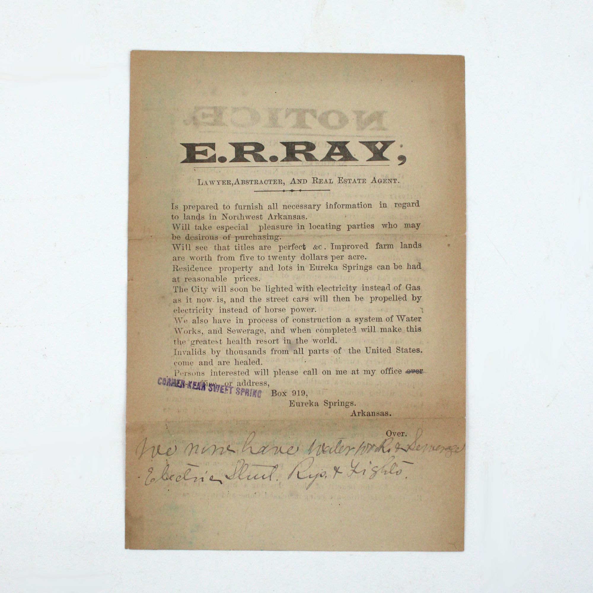 - 2pp. handbill, with advertisement on verso for E. R. Ray, lawyer, abstracter and real estate agent in Eureka Springs. Manuscript