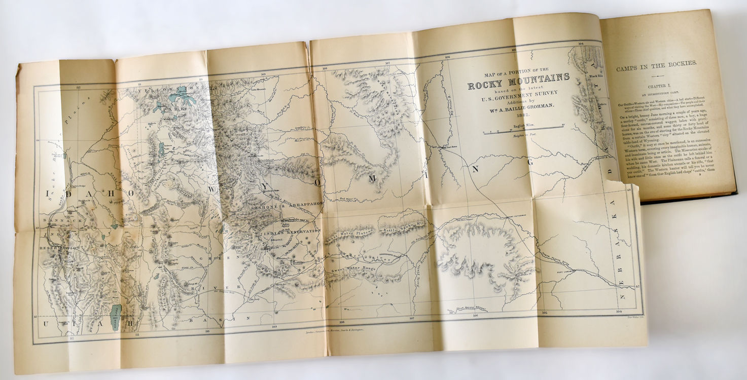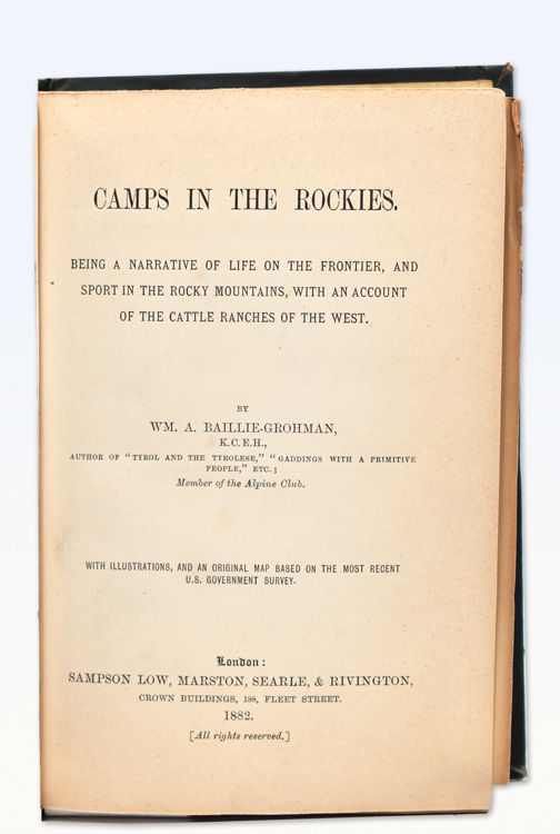 London: Sampson, Low, Marston, Searle, & Rivington, 1882. First Edition. Folding map at the beginning. Illus. 438pp. 8vo. Publisher's blue cloth. First Edition. Folding map at the beginning. Illus. 438pp. 8vo. MAP: "Map of a Portion of the Rocky Mountains based on the Latest U.S. Government Survey. Additions by Wm. A. Baillie-Grohman. 1882."