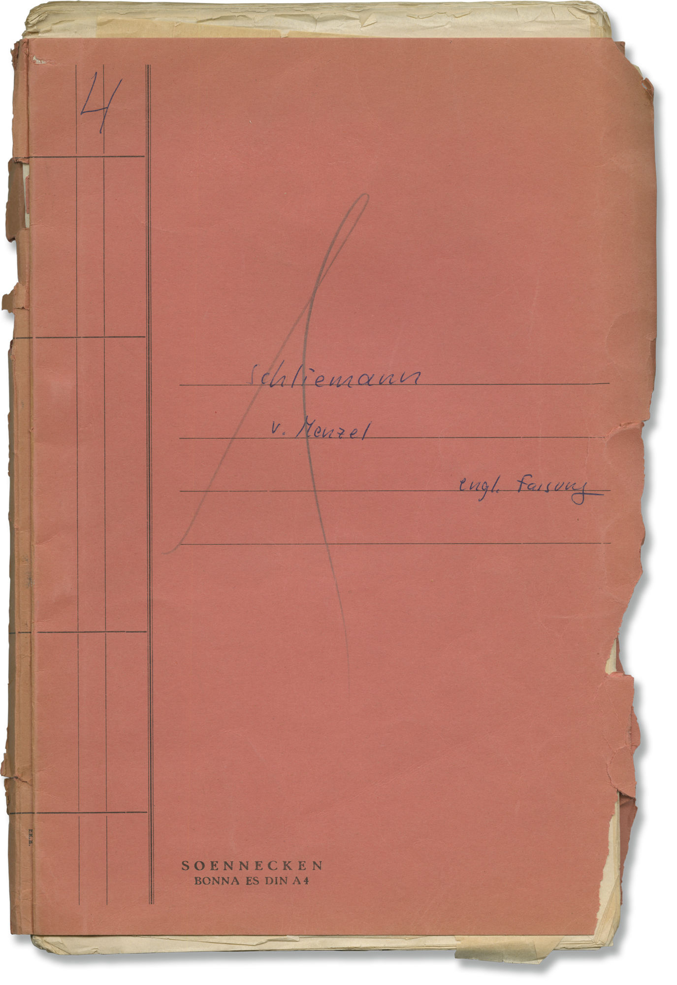 Salmon titled wrappers, with credit for screenwriter Gerhard Menzee. Title page present, with credit for screenwriter Gerhard Menzee. 175 leaves, with last page of text numbered 172. Carbon typescript on onionskin stock, rectos only. Pages Very Good plus, wrapper Very Good plus, bound internally with a silver prong.